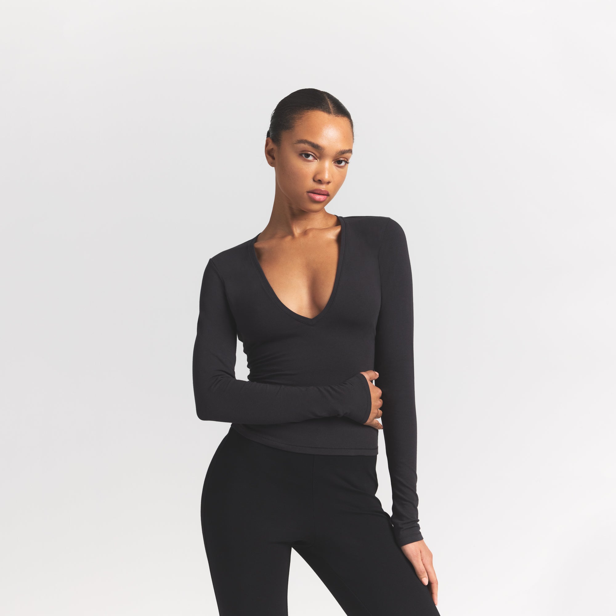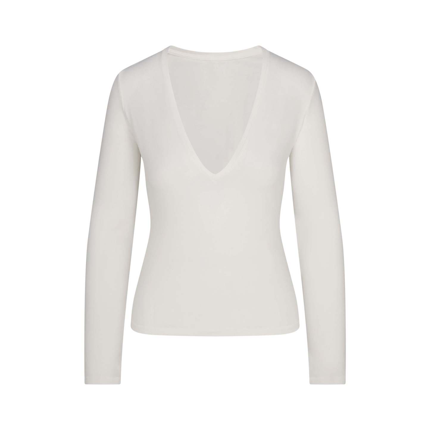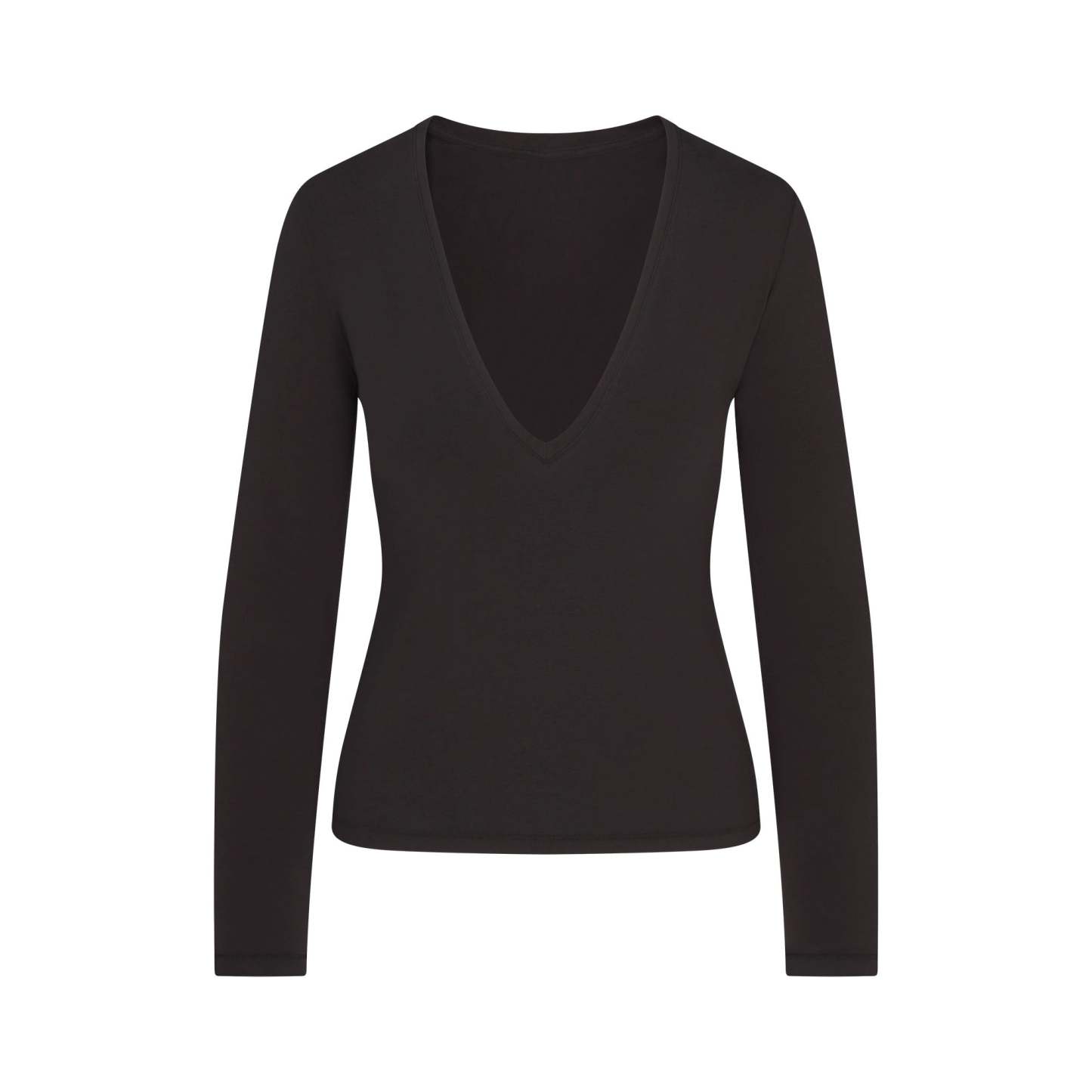 Plunge perfection. This long sleeve wardrobe staple is designed in our signature Cotton Jersey that stretches to your curves. Features a body-hugging fit.