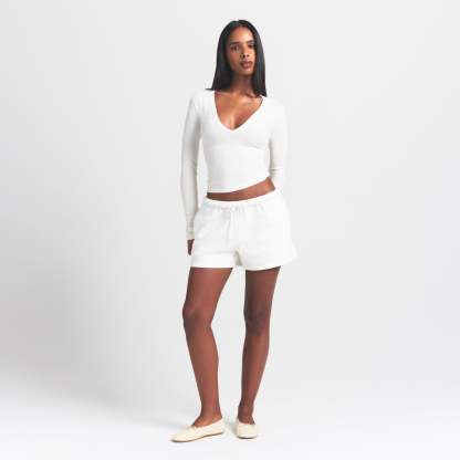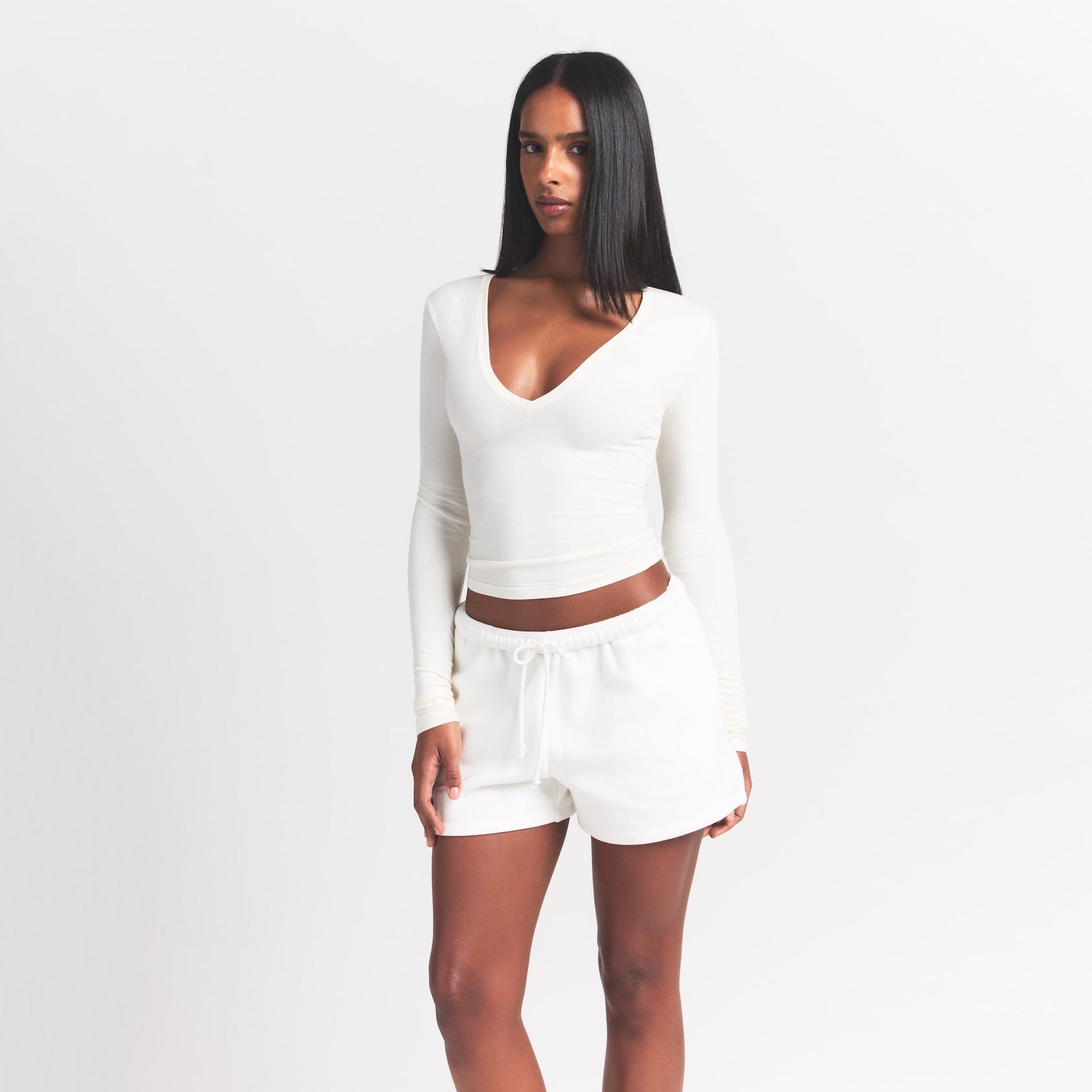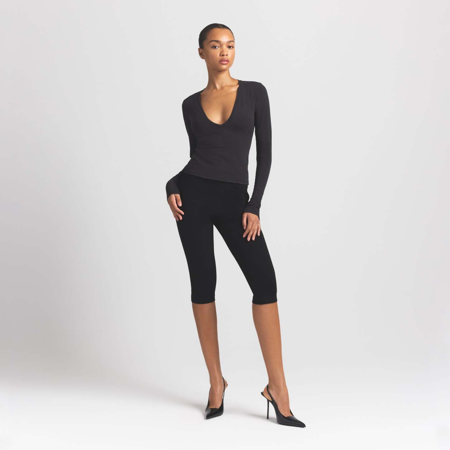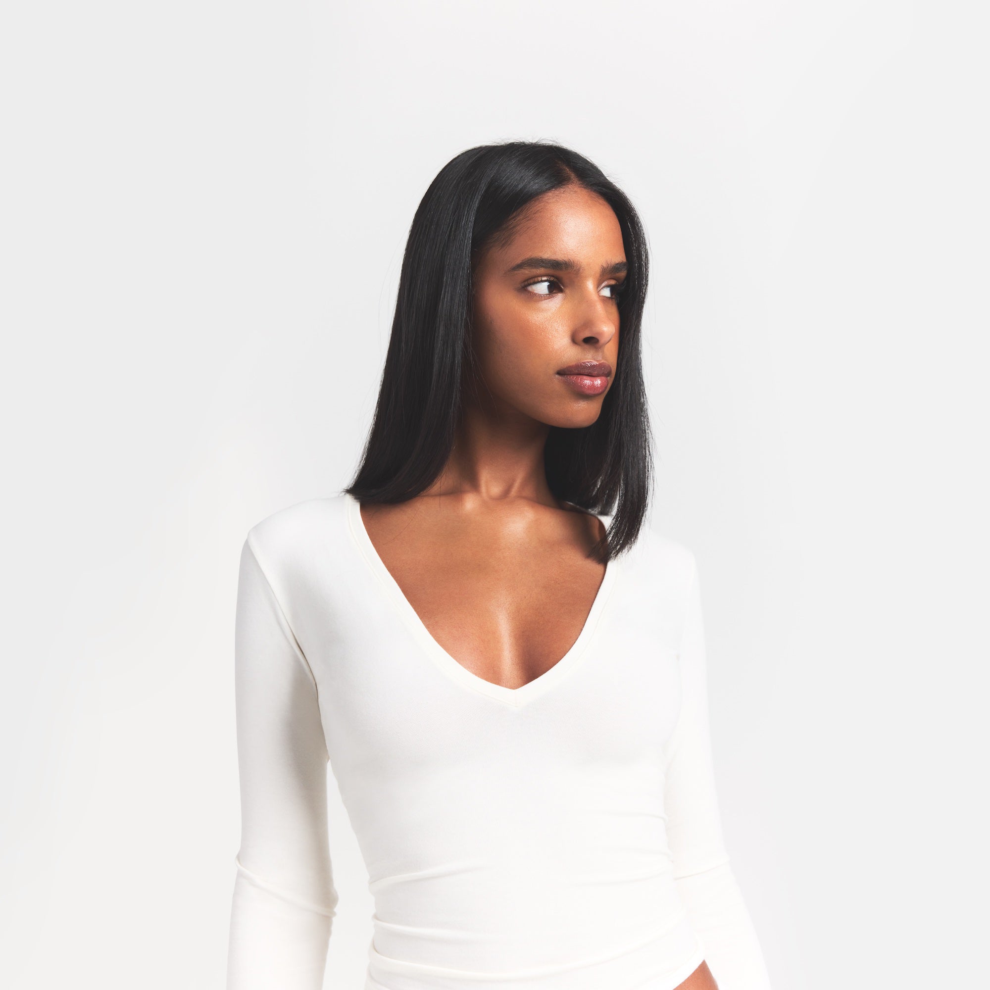 Plunge perfection. This long sleeve wardrobe staple is designed in our signature Cotton Jersey that stretches to your curves. Features a body-hugging fit.