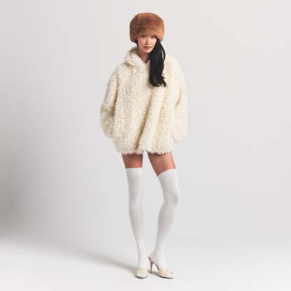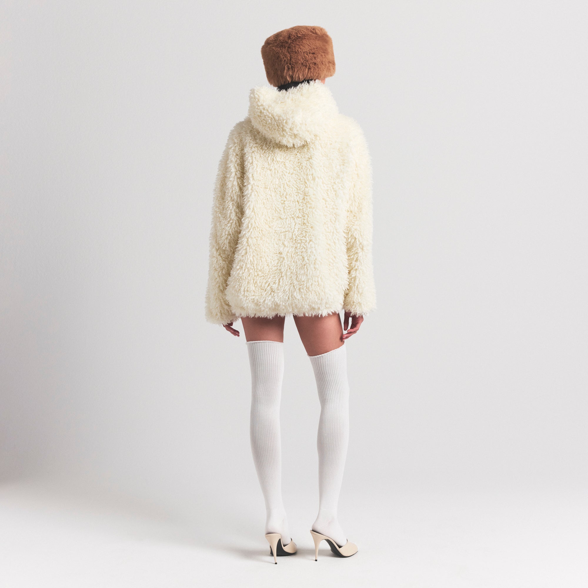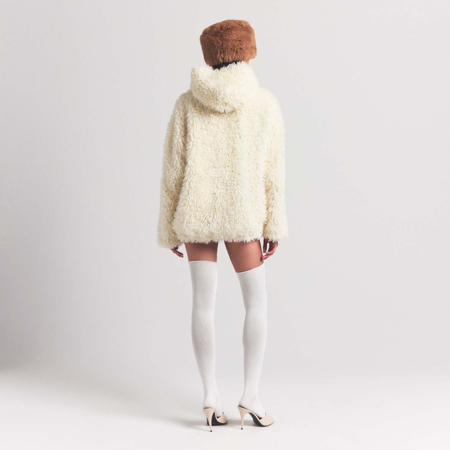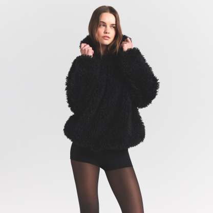 Peak cozy, incoming. This fluffy faux-fur hoodie has an ultra-plush feel and a soft jersey lining for total comfort inside and out. Features an oversized cut with an adjustable bungee hem, drop shoulders, and a side-pocket design.
