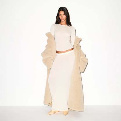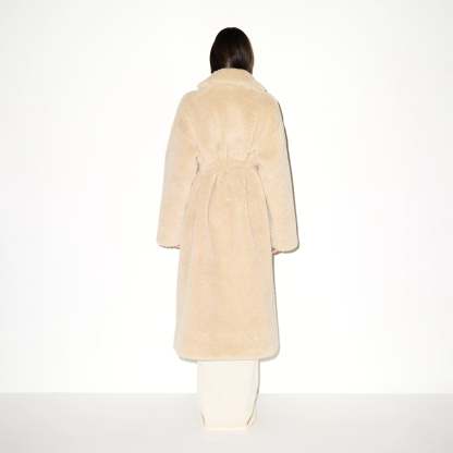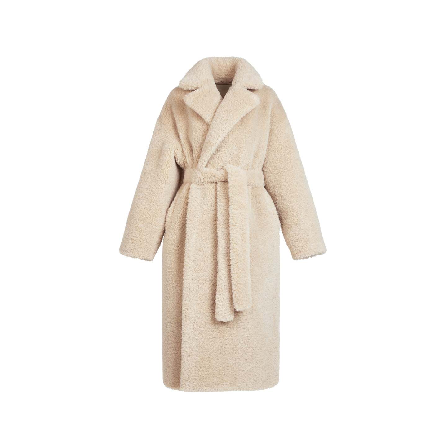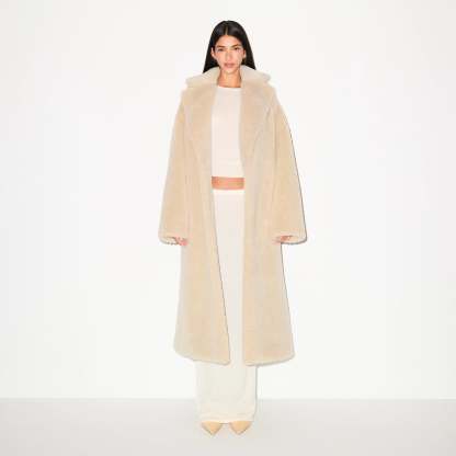 Wrap yourself in ultimate warmth. This oversized long coat is made in our soft faux fur and lined with smooth satin. Designed with a pointed collar and chic drop shoulder silhouette, this outerwear piece features a functional self-tie for a cinched look. Complete with welt pockets.