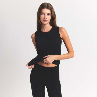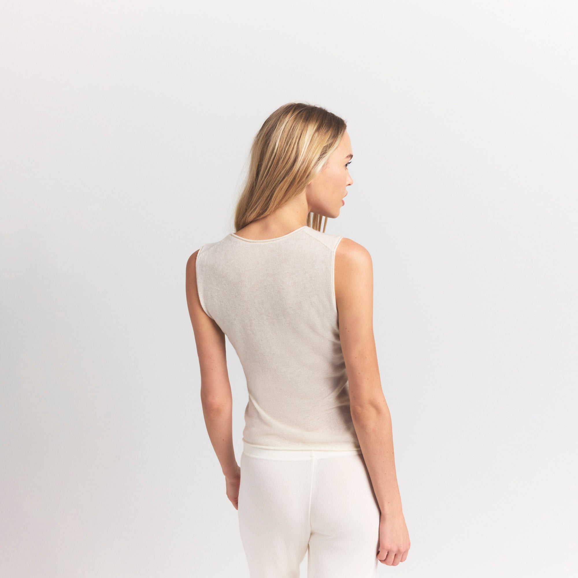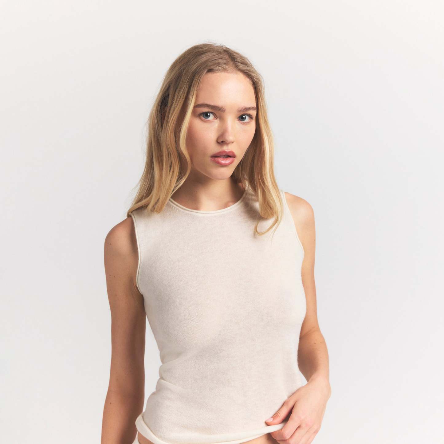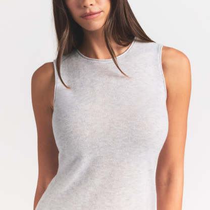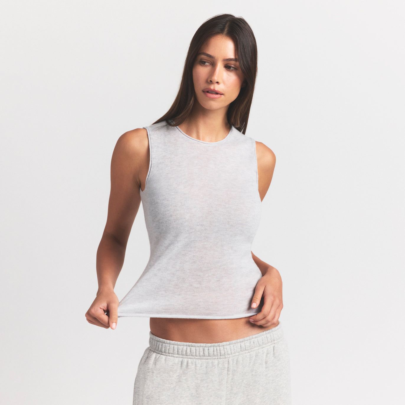 Refined, polished style. This semi-sheer sleeveless top is your-go to layer for luxe comfort, designed in our lightweight, 100% Grade A Cashmere. Features a crew neckline and rolled edge details.