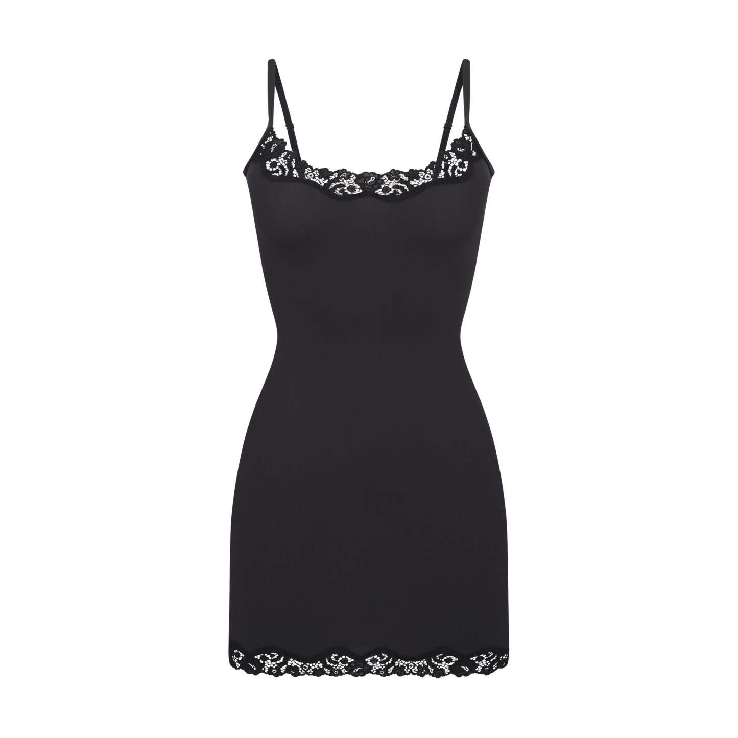 Slip into this buttery-soft, body-hugging mini dress with romantic stretchy lace trims. Features a front scoop neckline and adjustable straps. Fits true to size.