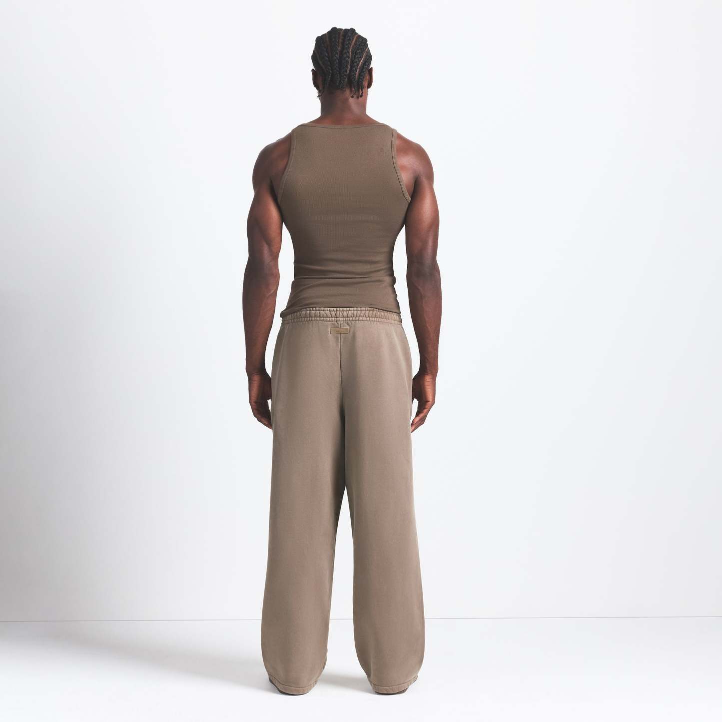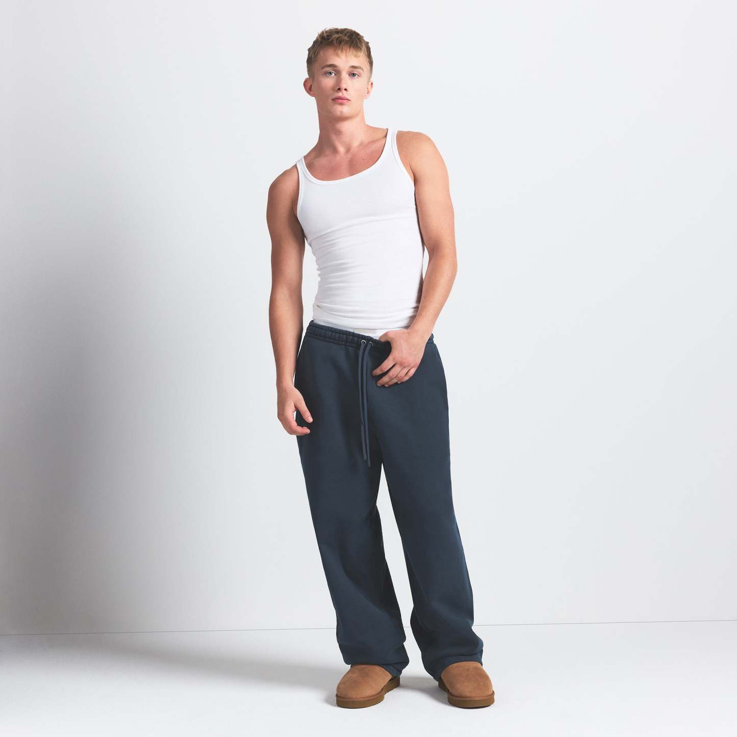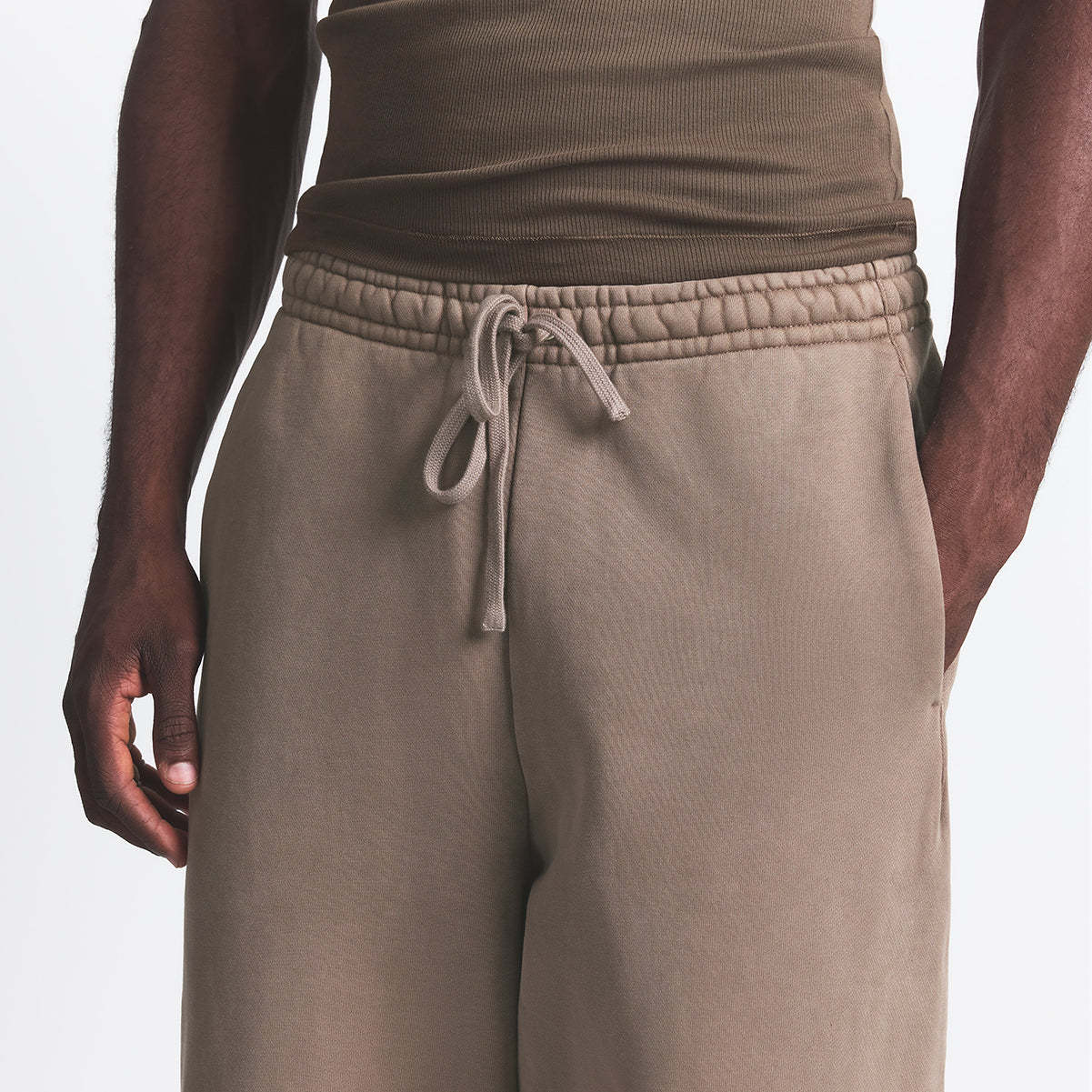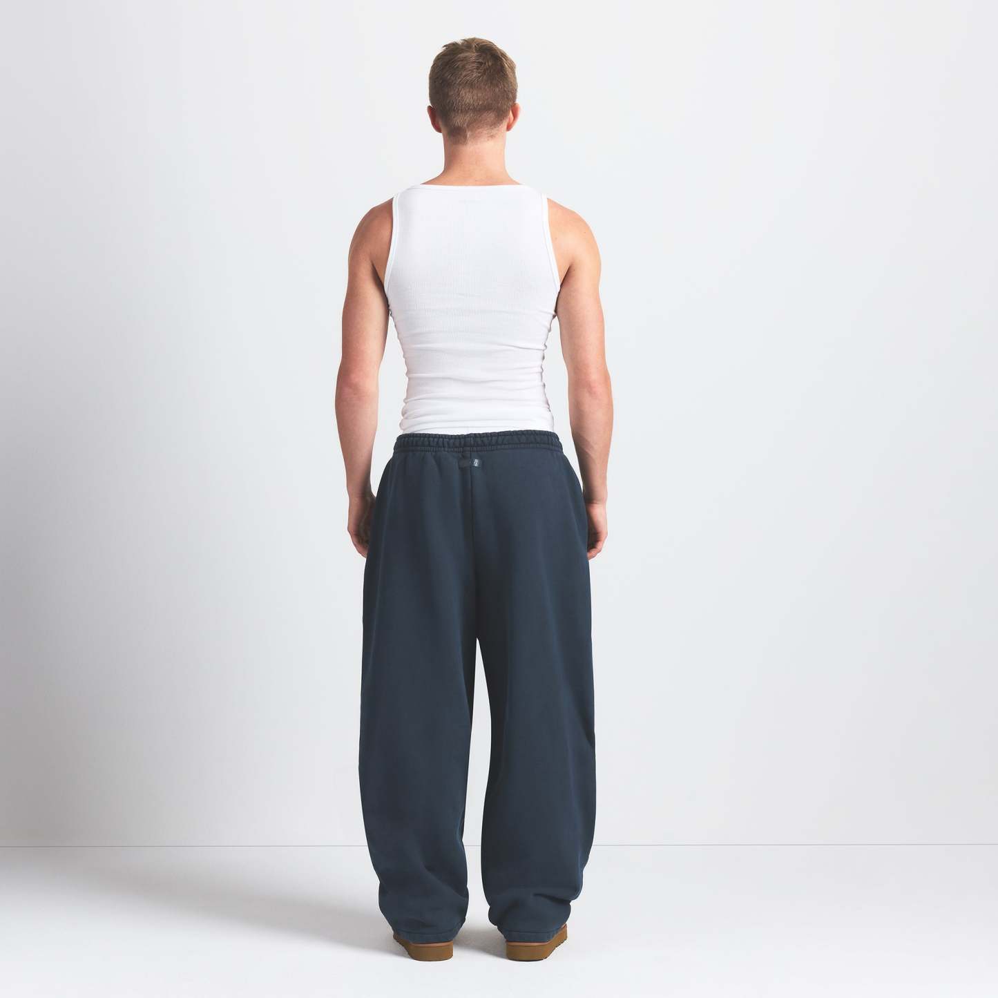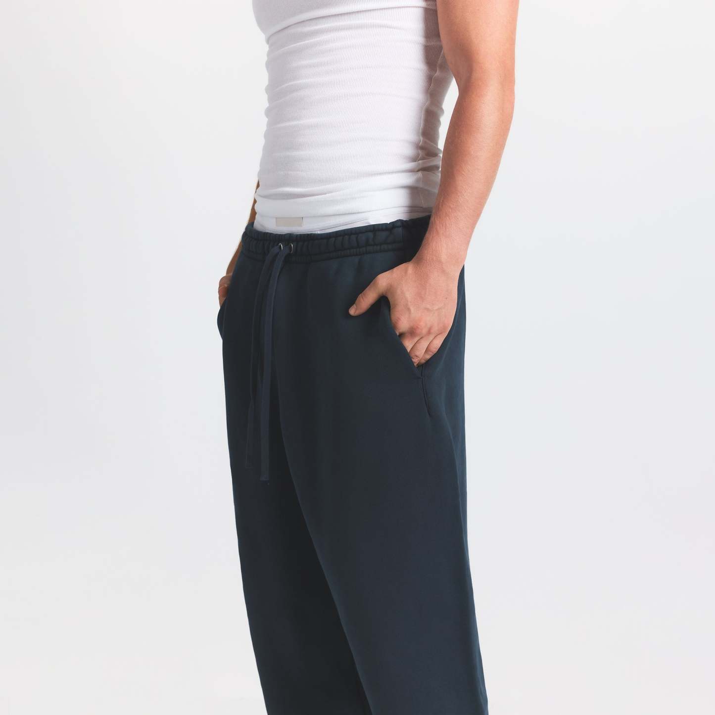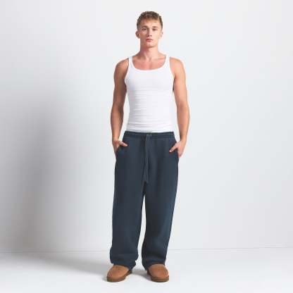 - Relaxed fit, Elastic waistband, Exterior drawcord for adjustability, Darted side pockets, Branded leather patch, Straight leg