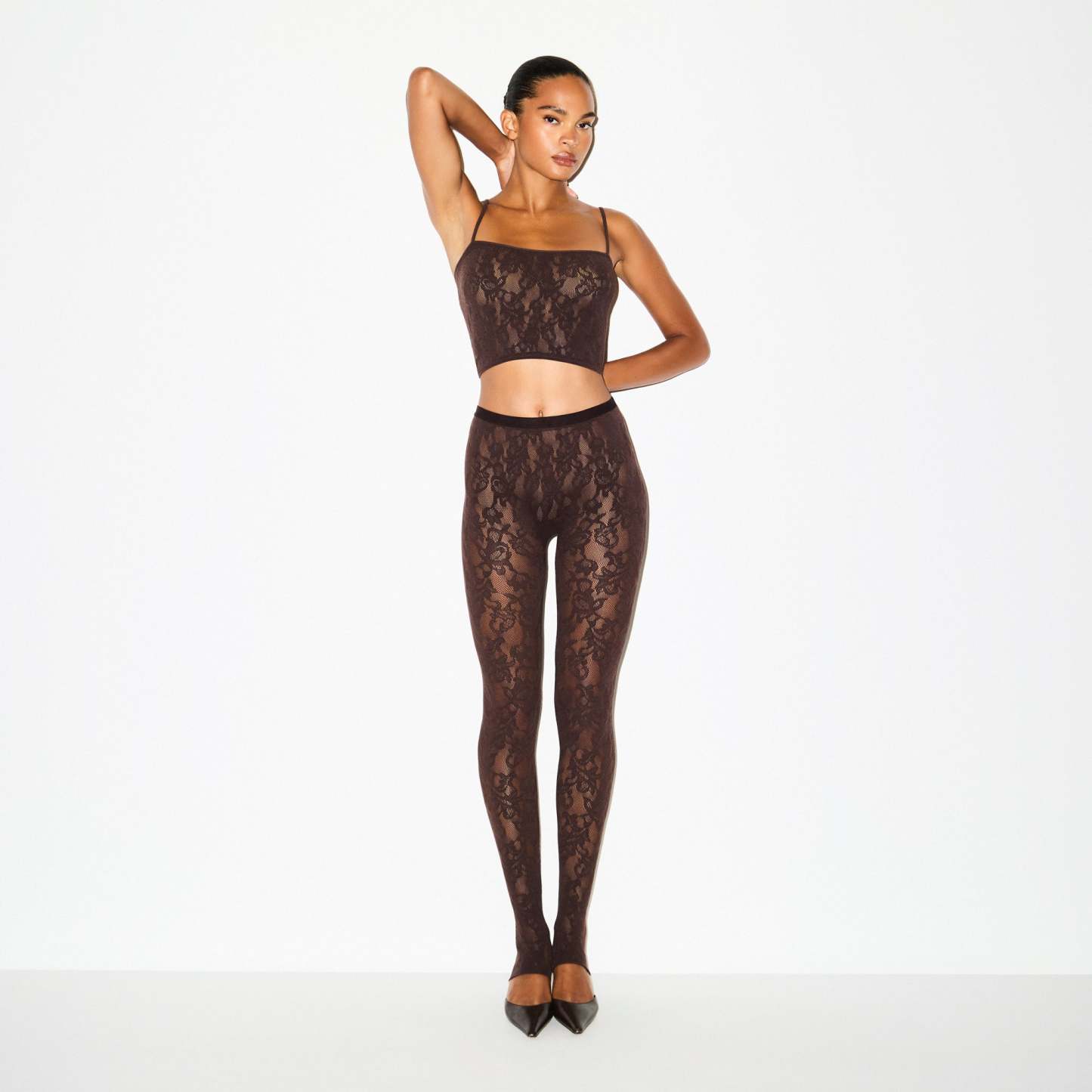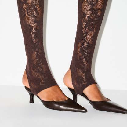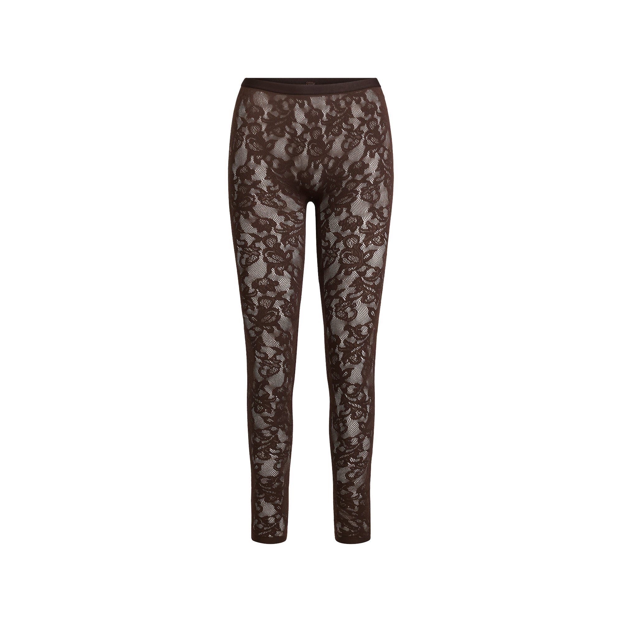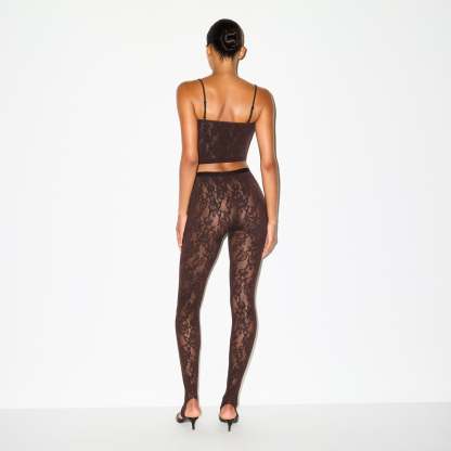 Make a luxe, sexy statement in these high-waisted leggings. Designed in our sheer Knit Lace, these bottoms feature an elastic waistband and stirrup detail for elevated style. Complete with a 100% cotton gusset lining and fits true to size.