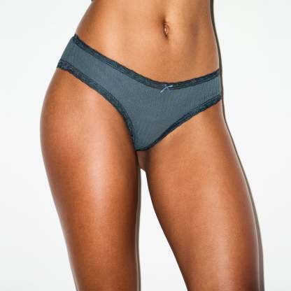 - Lace trim at waist and leg opening, Bow at center front, 100% Cotton gusset, Medium back coverage