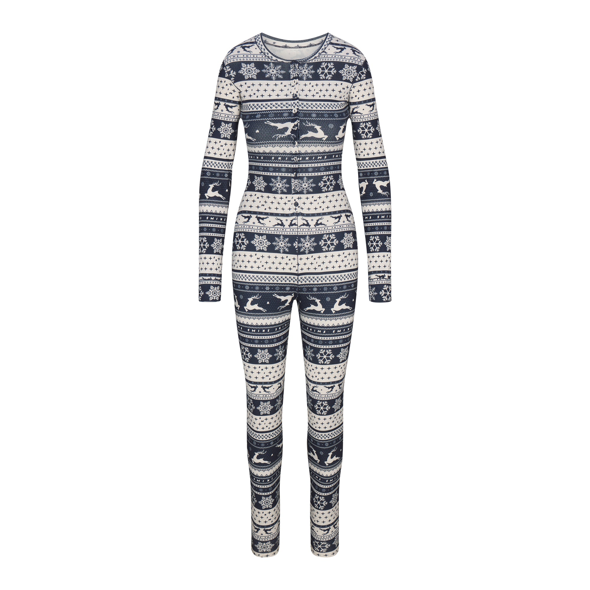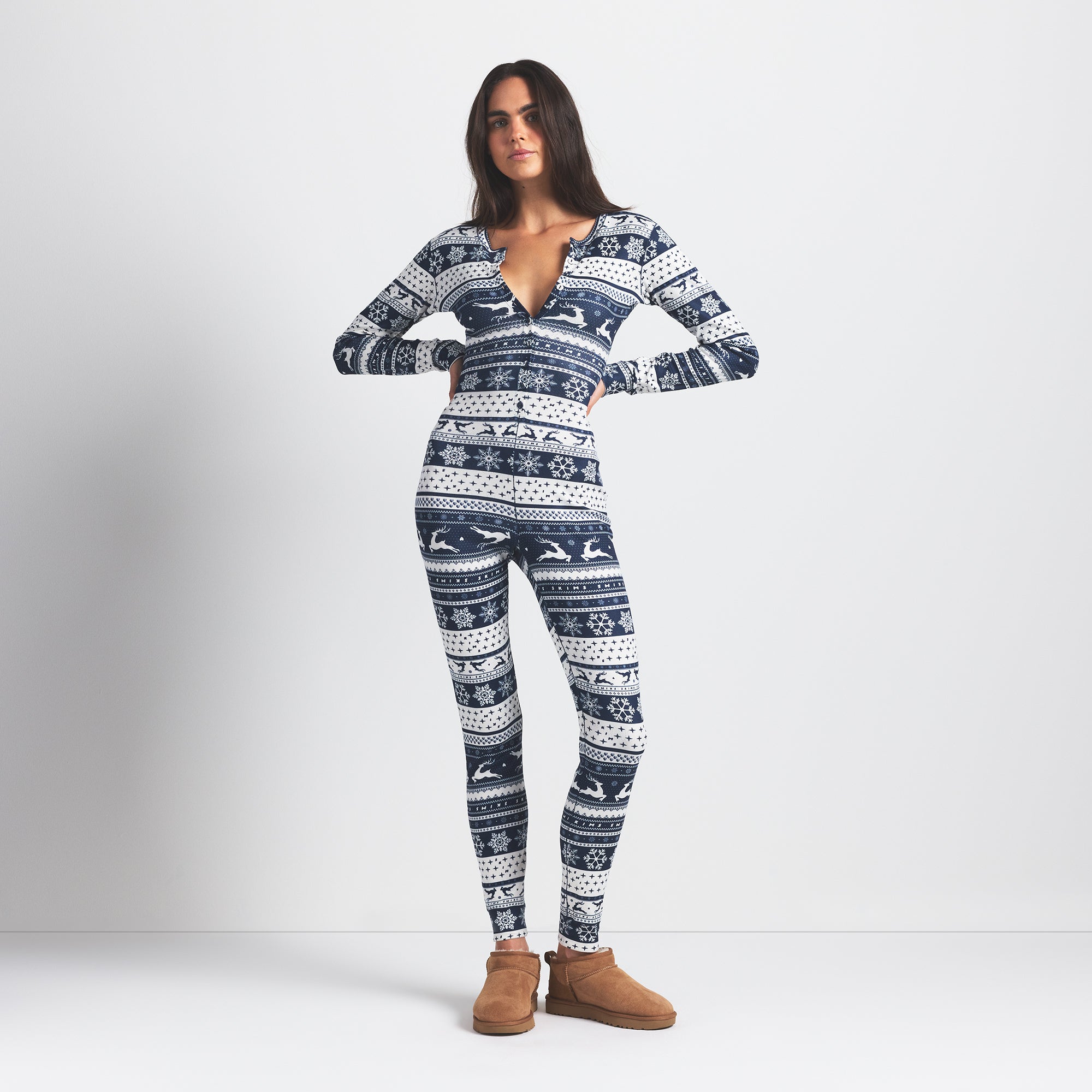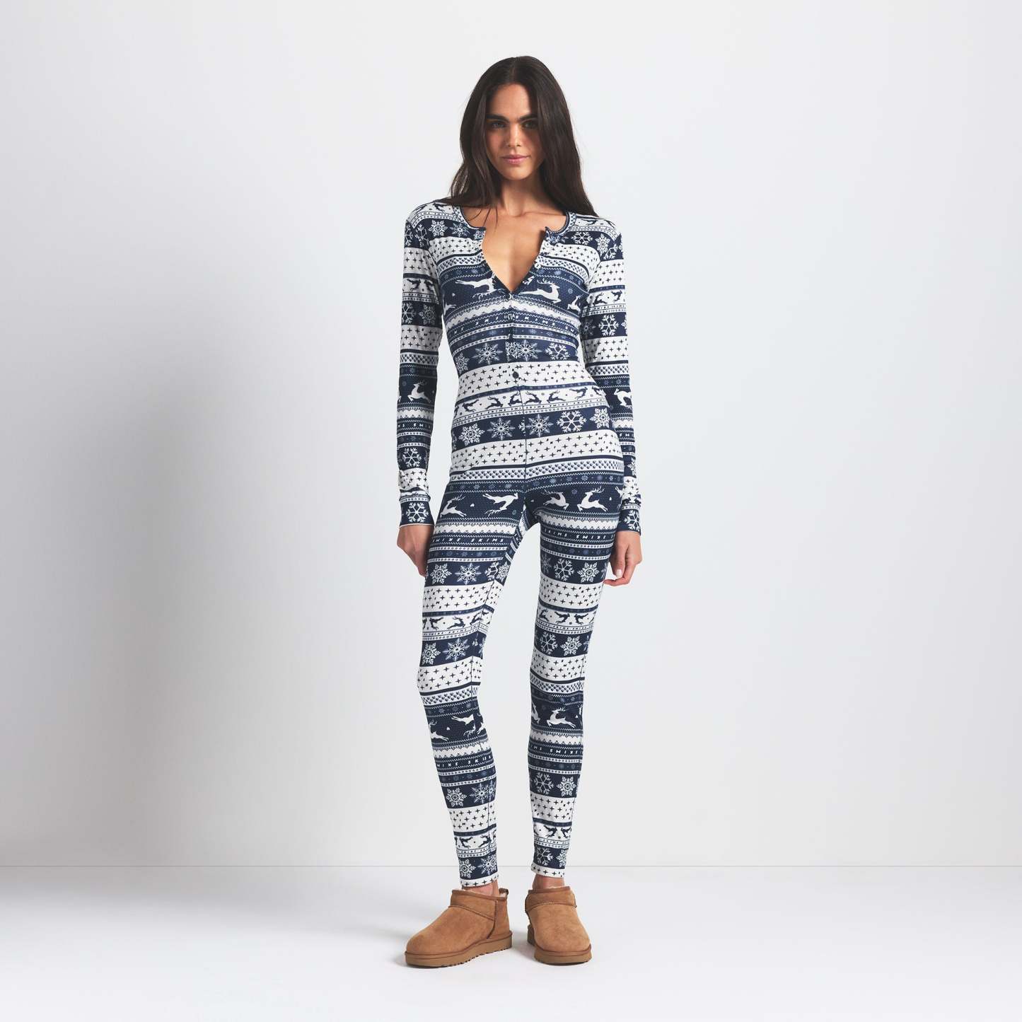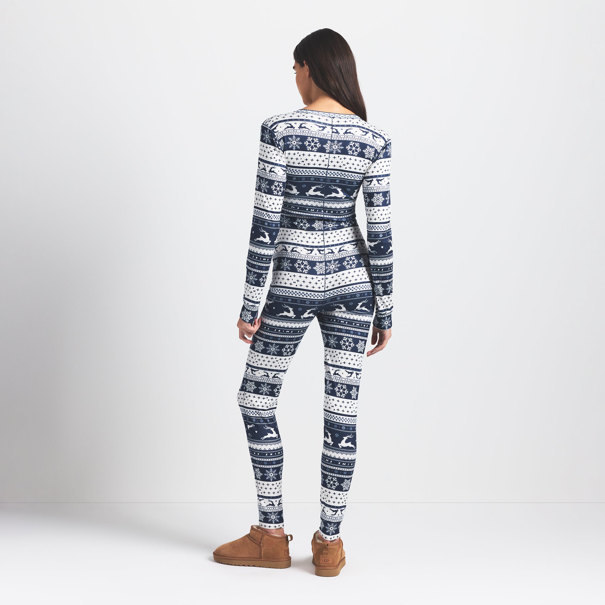 Feel the holiday spirit in this super soft onesie. Made with a super plush and stretchy pointelle fabric with a fair isle print, this one-and-done style is designed to keep you warm and comfortable all season long. Detailed with a high crew neck above the henley buttons and banded cuffs. Comes specially packaged in a branded gift box. Fits true to size.