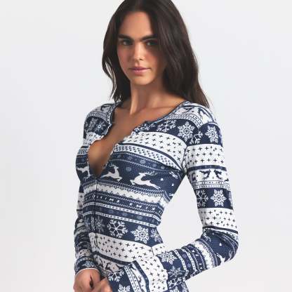 - Classic holiday onesie high crew neckline with henley button closure full-length with long sleeves, Branded cuffs on sleeve, Center front button up detail