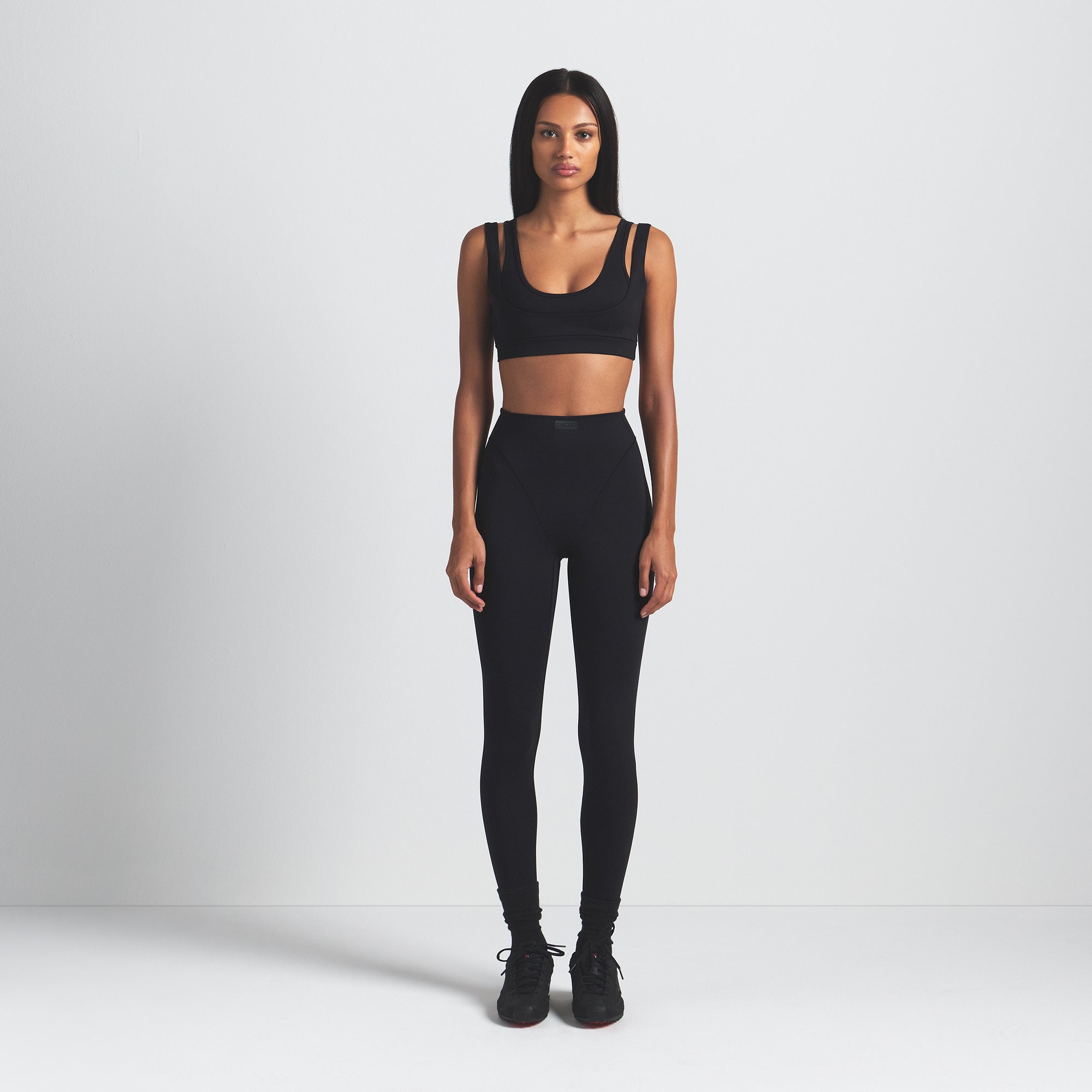 - Scoop neck, Double layered strap detail, Underlayer shelf bra, Silicone matte logo at center back, Pullover style, Fits tight to body, Best for low impact