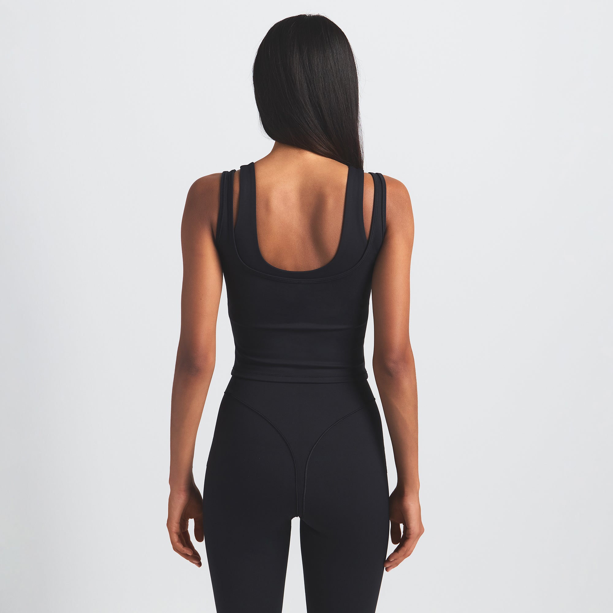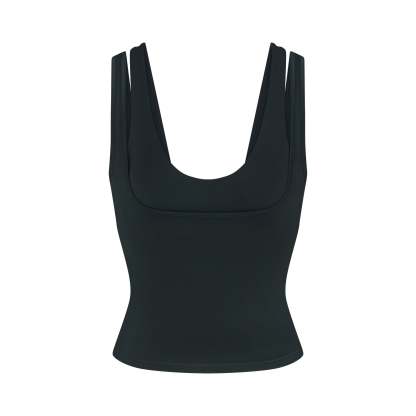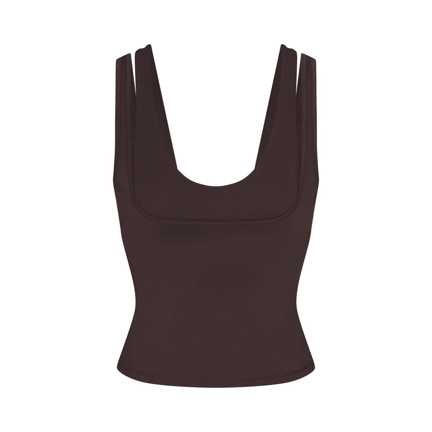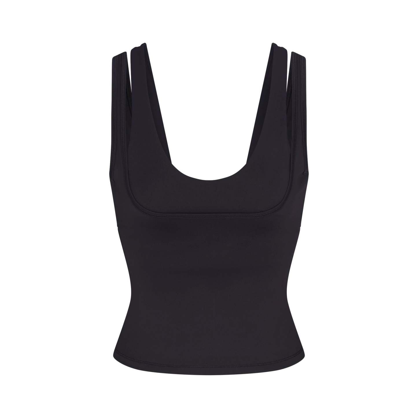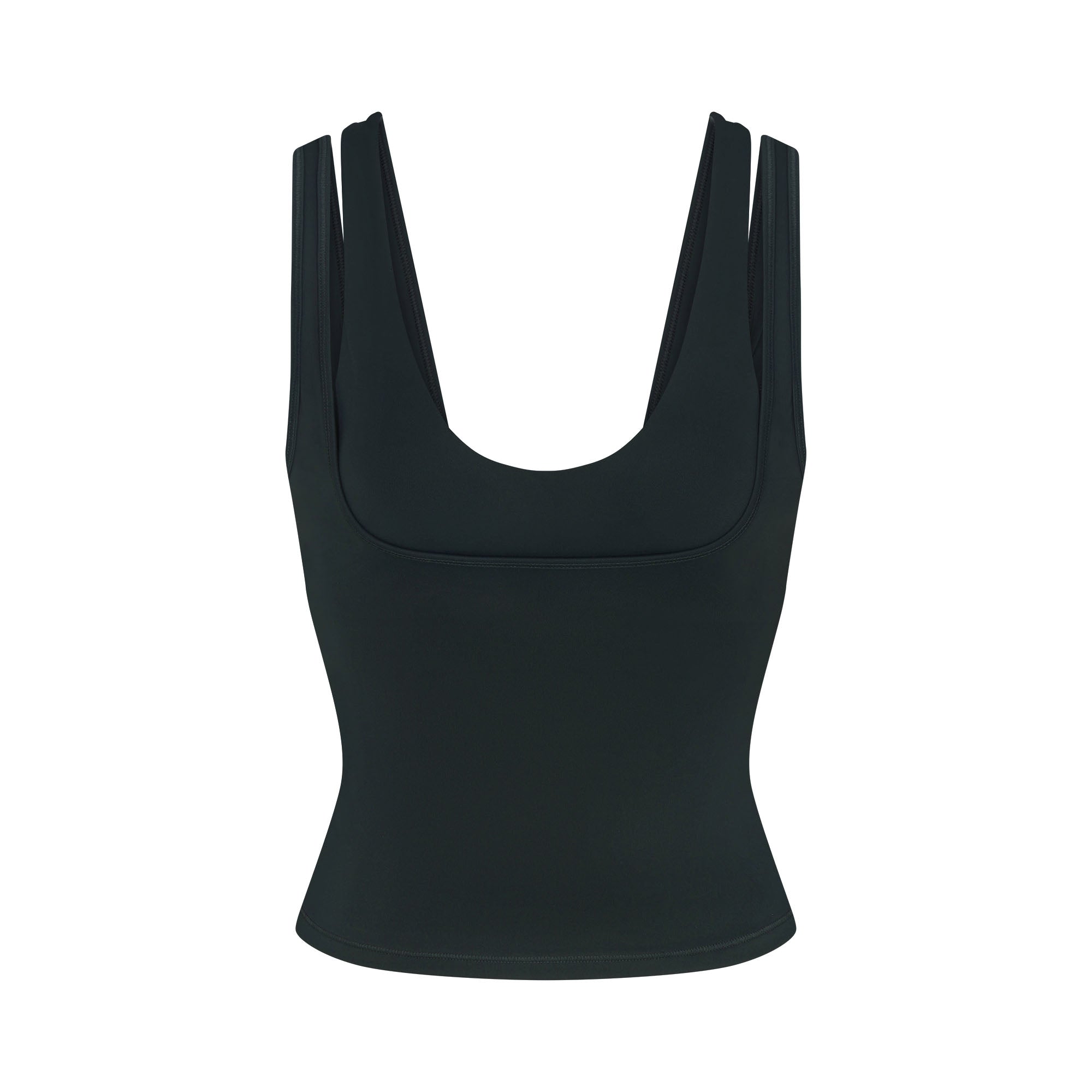 Scoop neck, Double layered strap detail, Underlayer shelf bra, Silicone matte logo at center back, Fits tight to body, Length: 18"