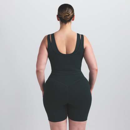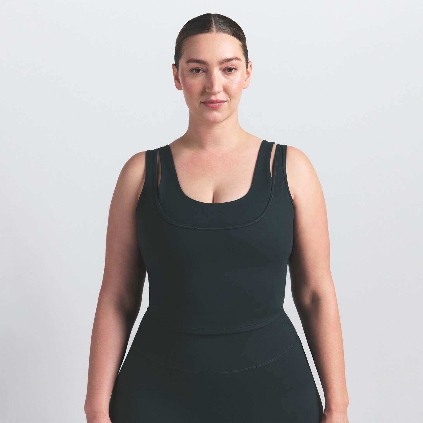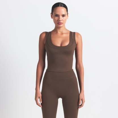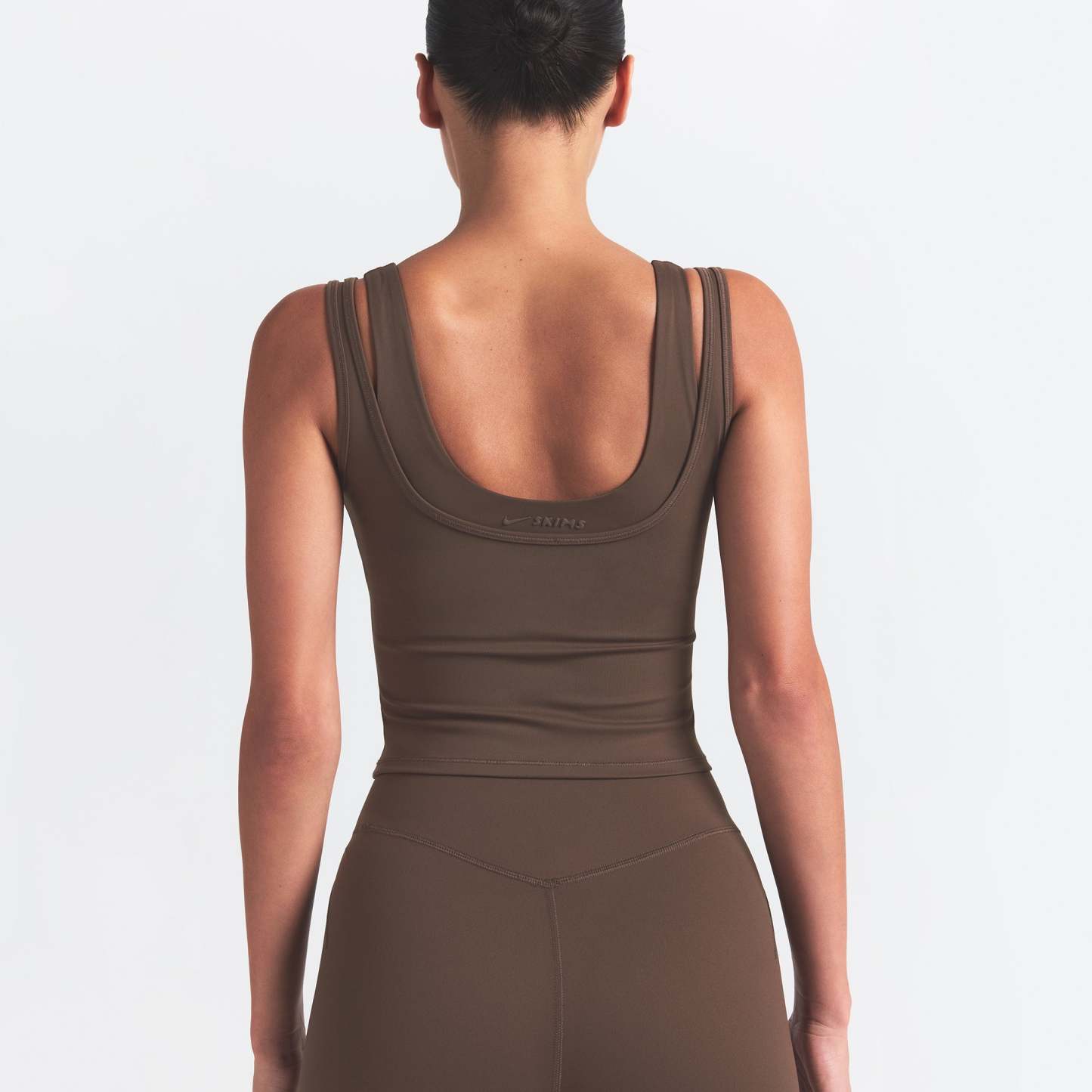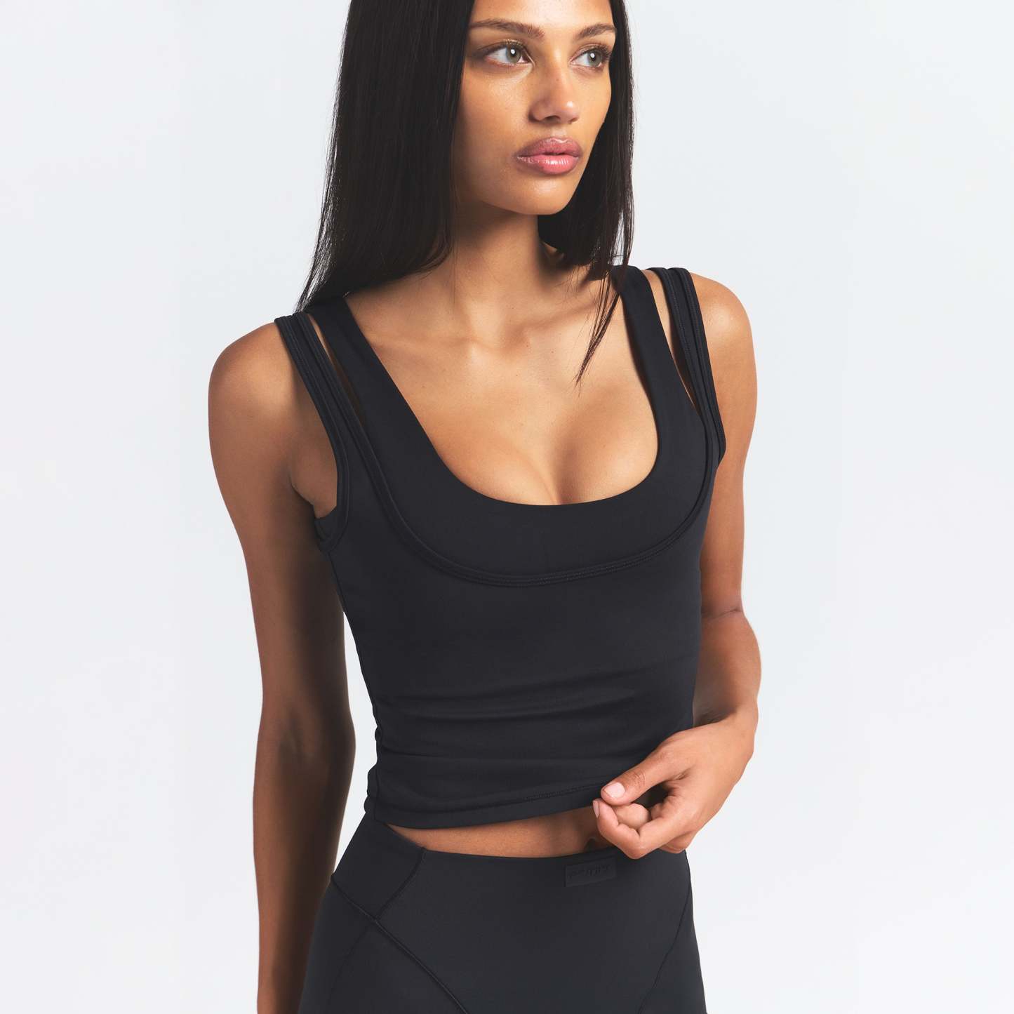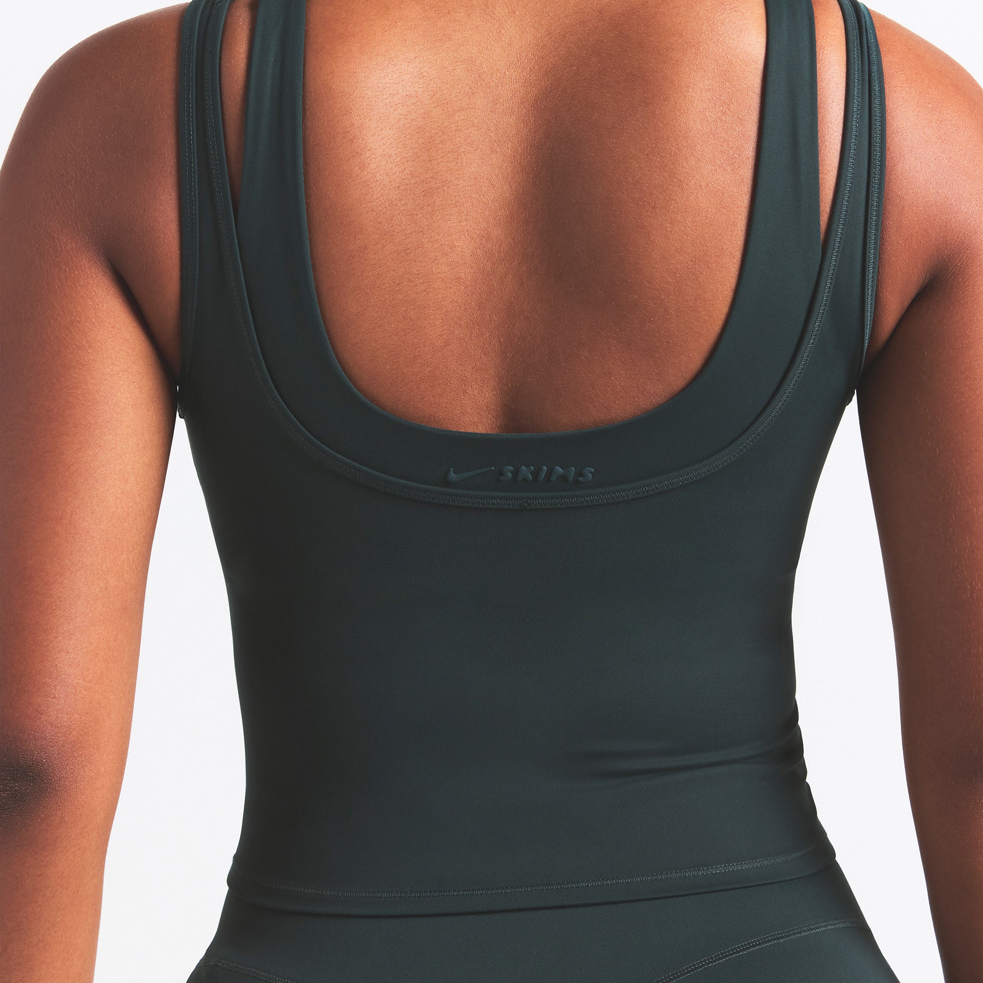 Scoop neck, Double layered strap detail, Underlayer shelf bra, Silicone matte logo at center back, Fits tight to body, Length: 18"