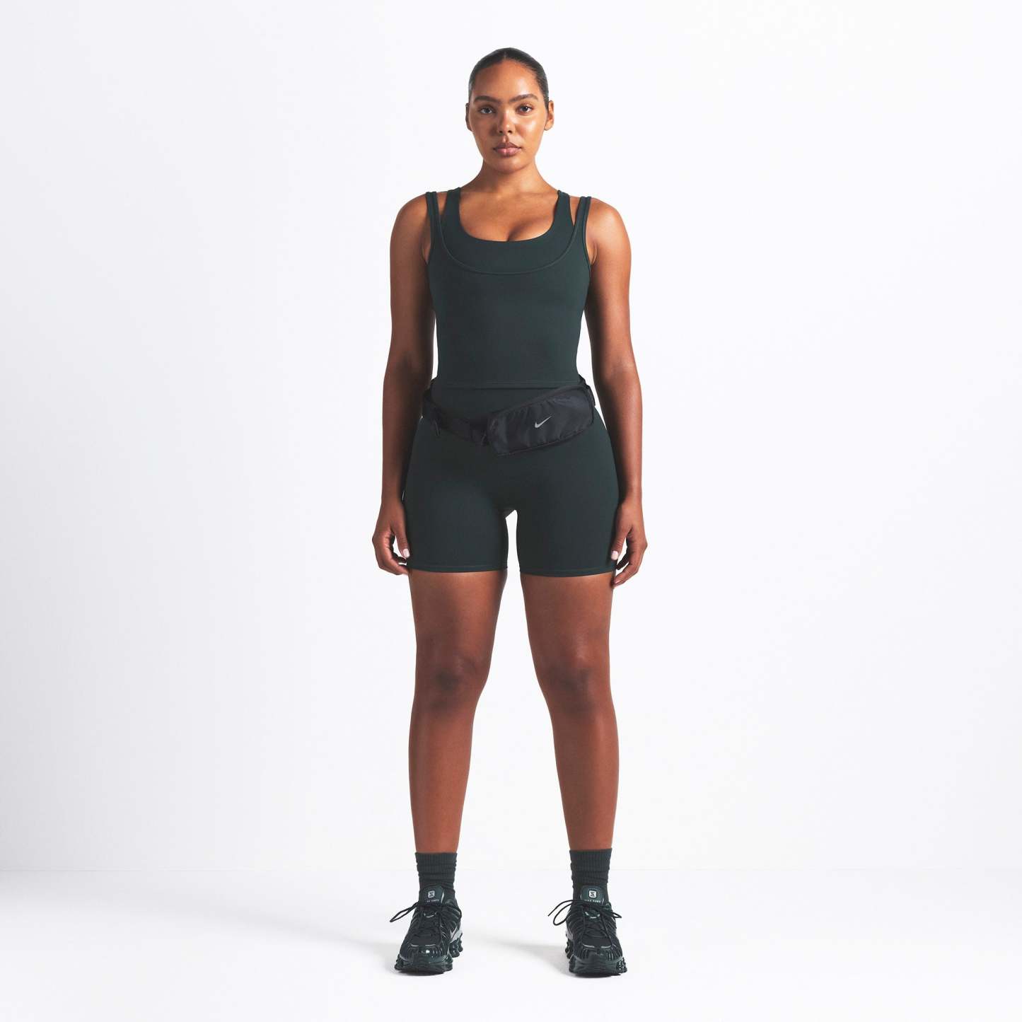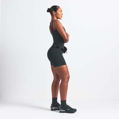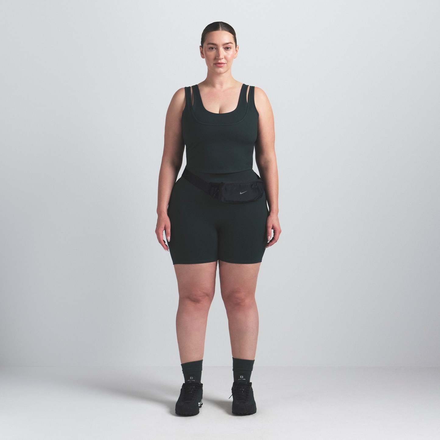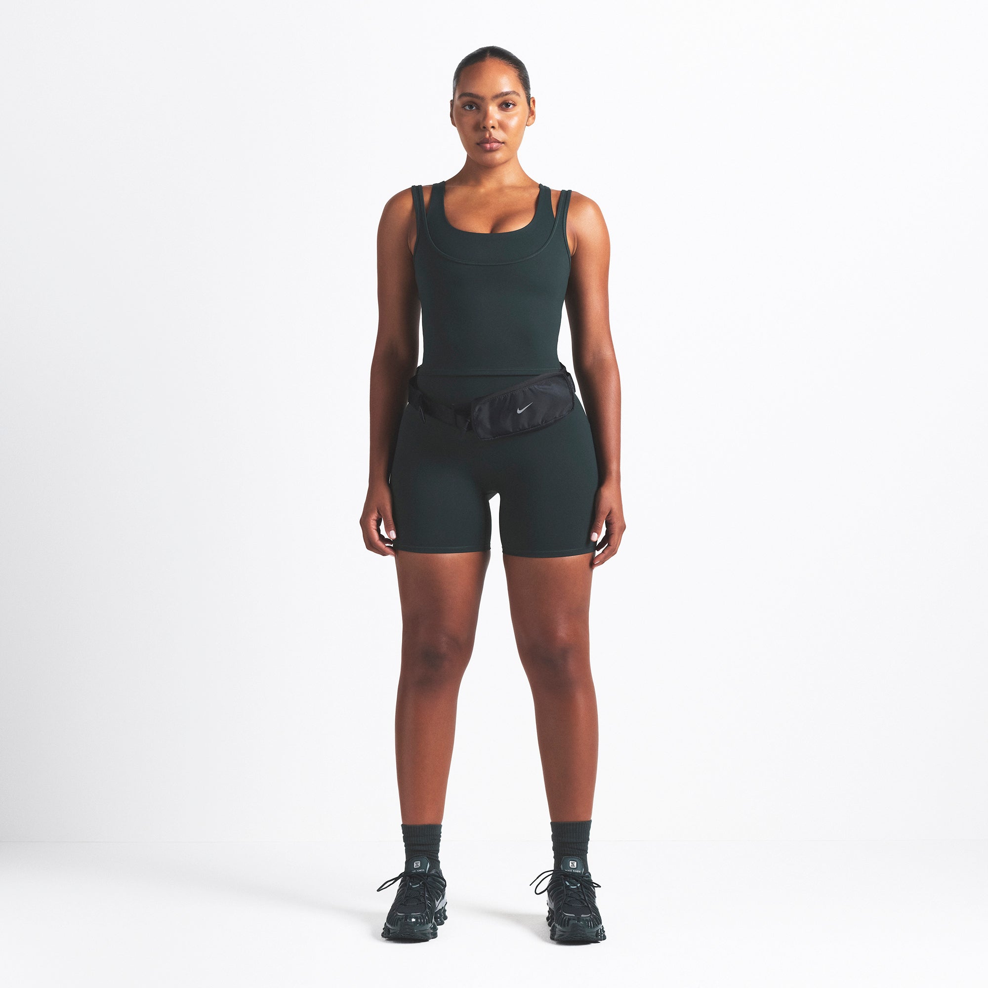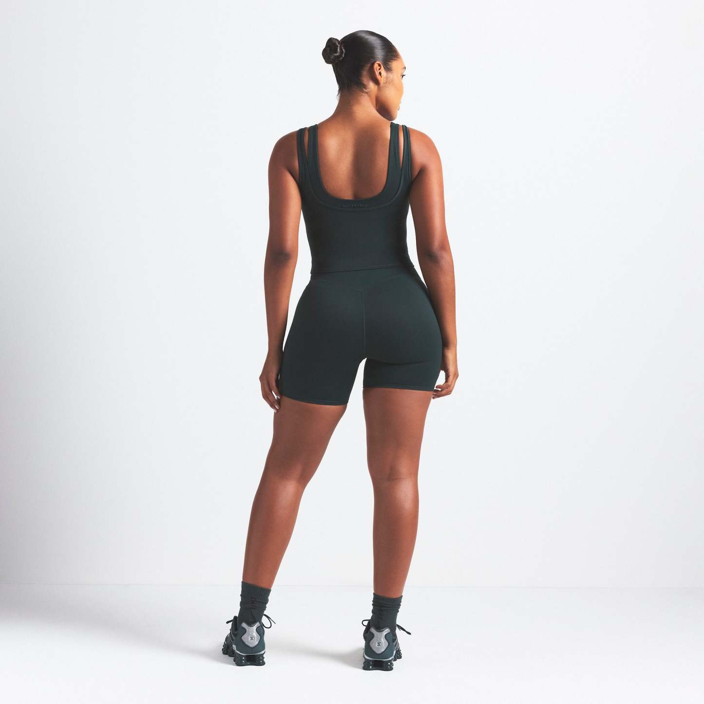 Scoop neck, Double layered strap detail, Underlayer shelf bra, Silicone matte logo at center back, Fits tight to body, Length: 18"