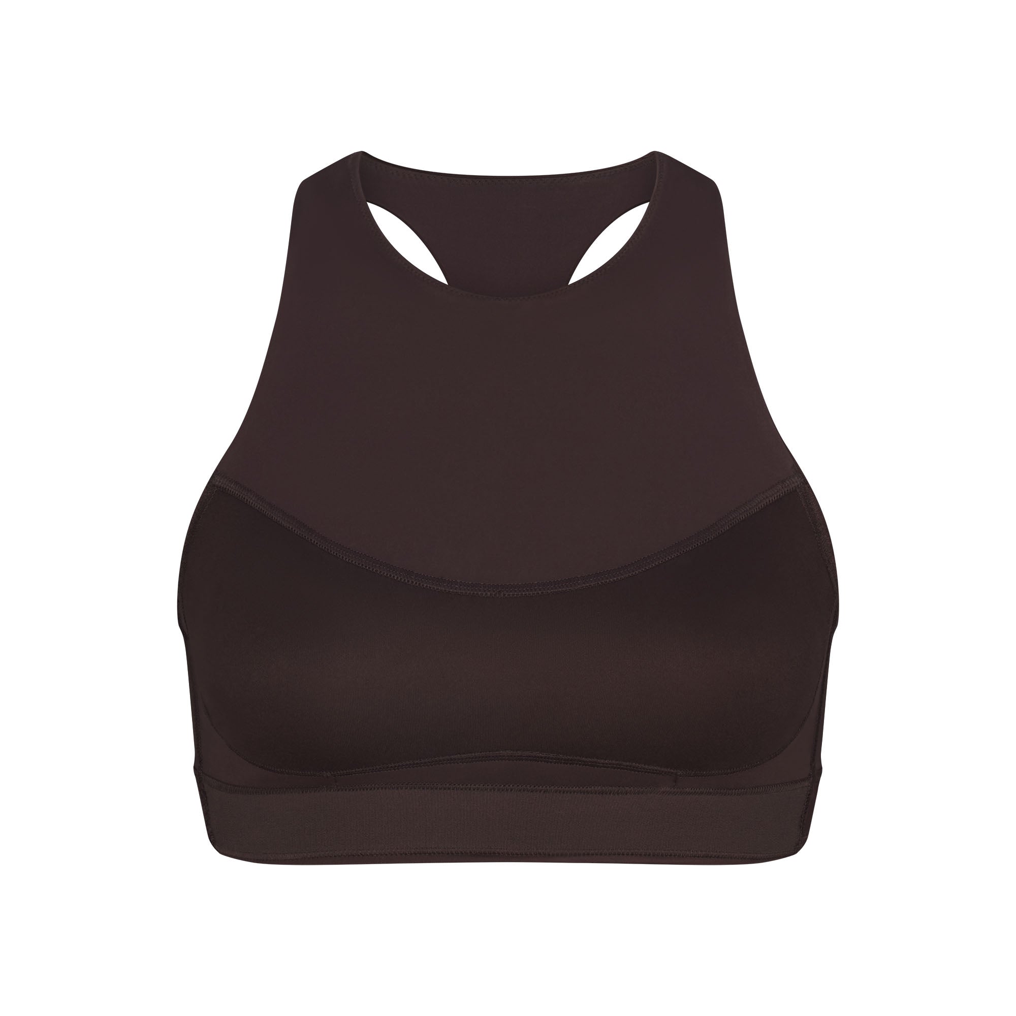 High-neck racerback bra with four-way stretch and built-in pads that mold to your bust and enhance your shape. Complete with power mesh lining, a back cut-out, and a hook and eye closure.