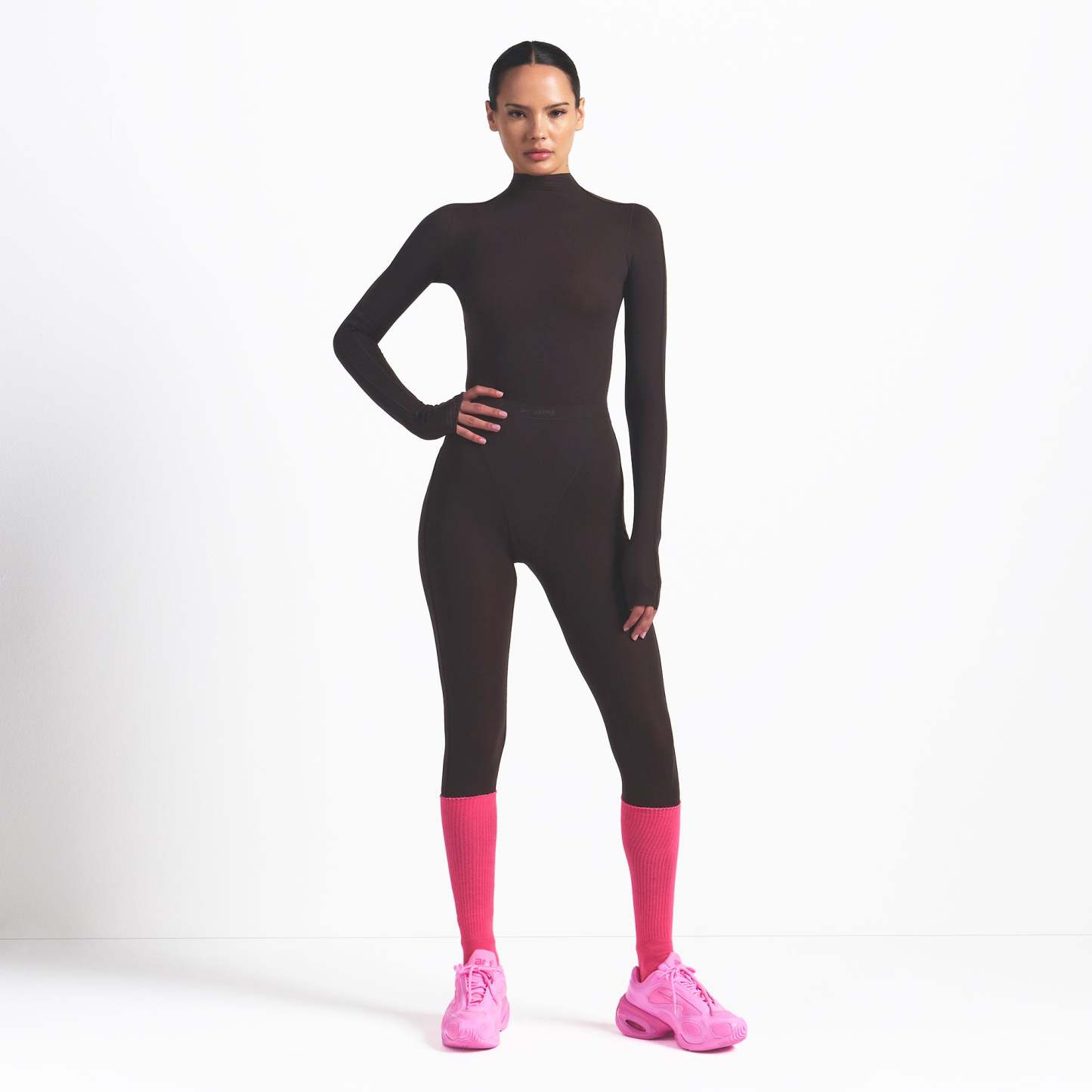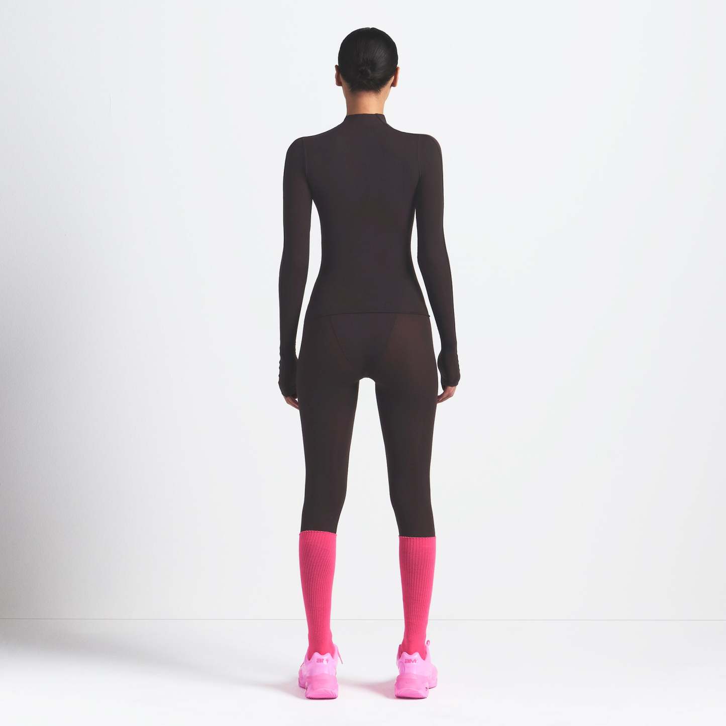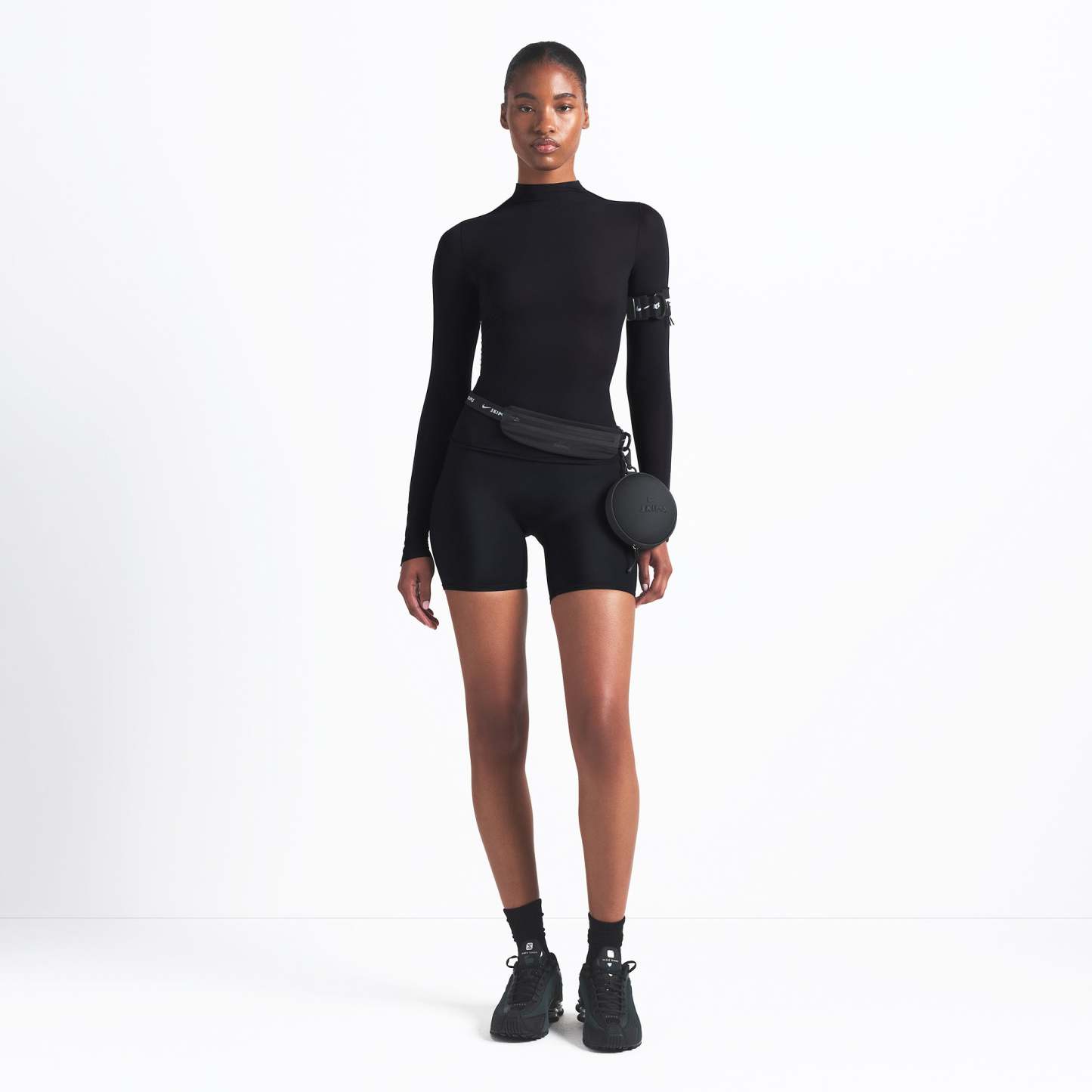 - Mock neck, Long sleeves, Reflective trim details on sleeves, Reflective logo on wearers left sleeve, Raw edge details, Fits tight to body