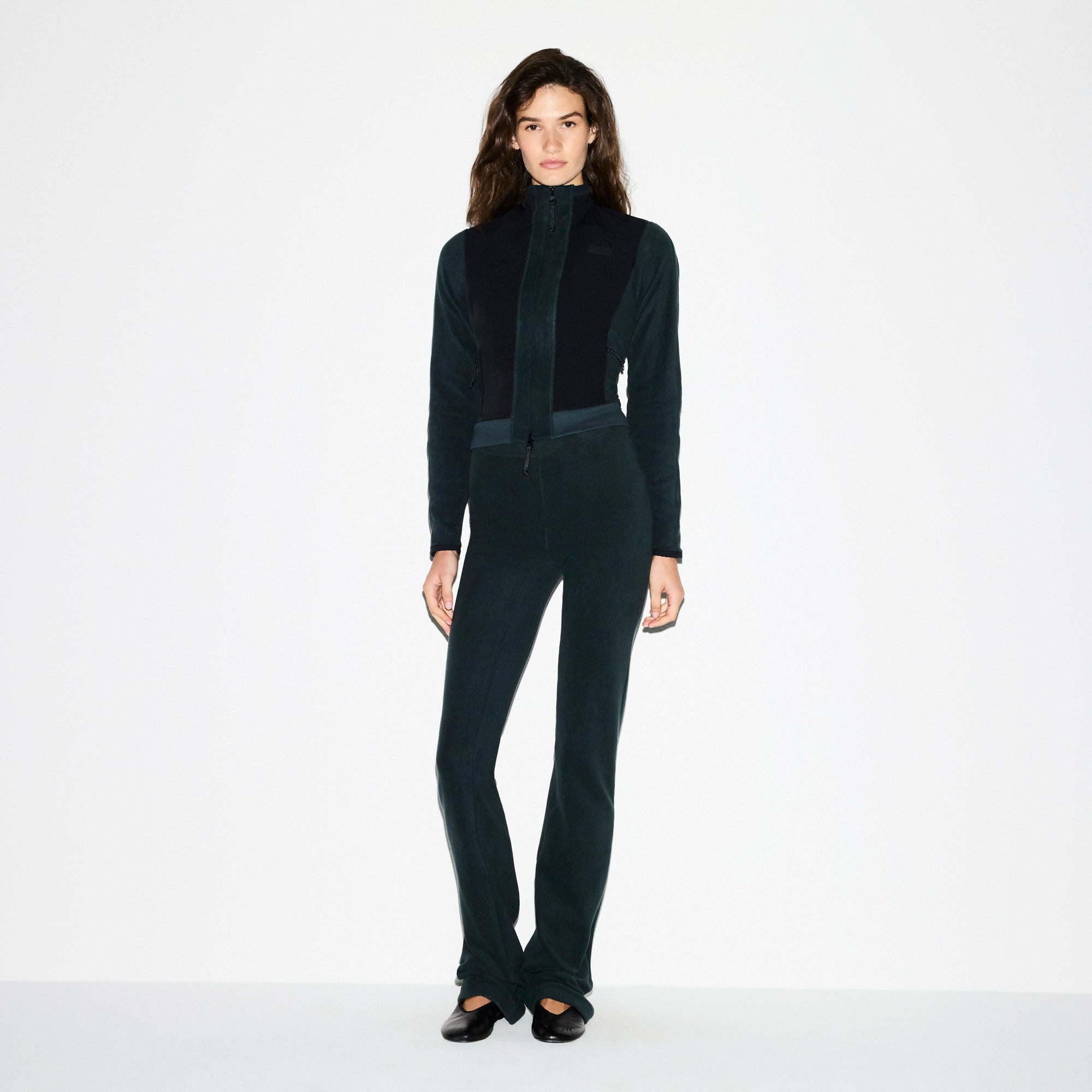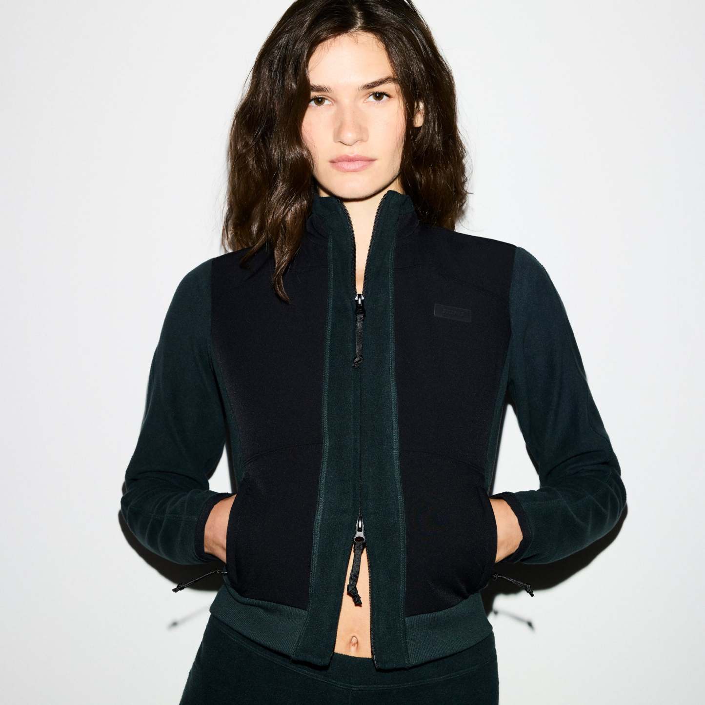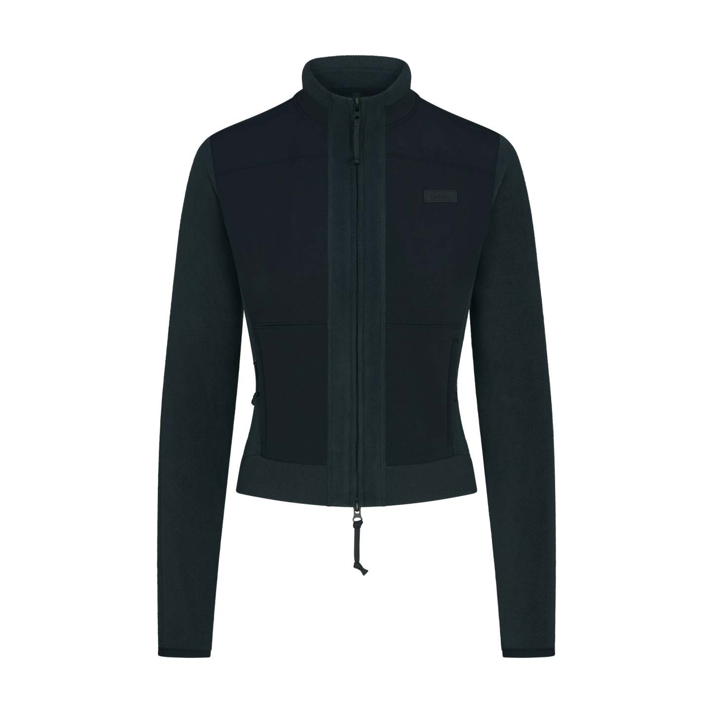 Cozy, cool, and collected. Featuring our midweight polar fleece and contrast panels, this fitted zip-up brings plush softness and sporty edge to your winter uniform. Features a sleek mock neck, relaxed sleeves, and cozy side pockets for ultimate comfort. Finished with a silicone SKIMS logo patch at the chest, this style hits below the natural waist and fits true to size.