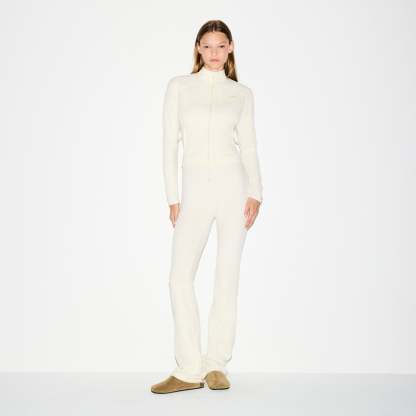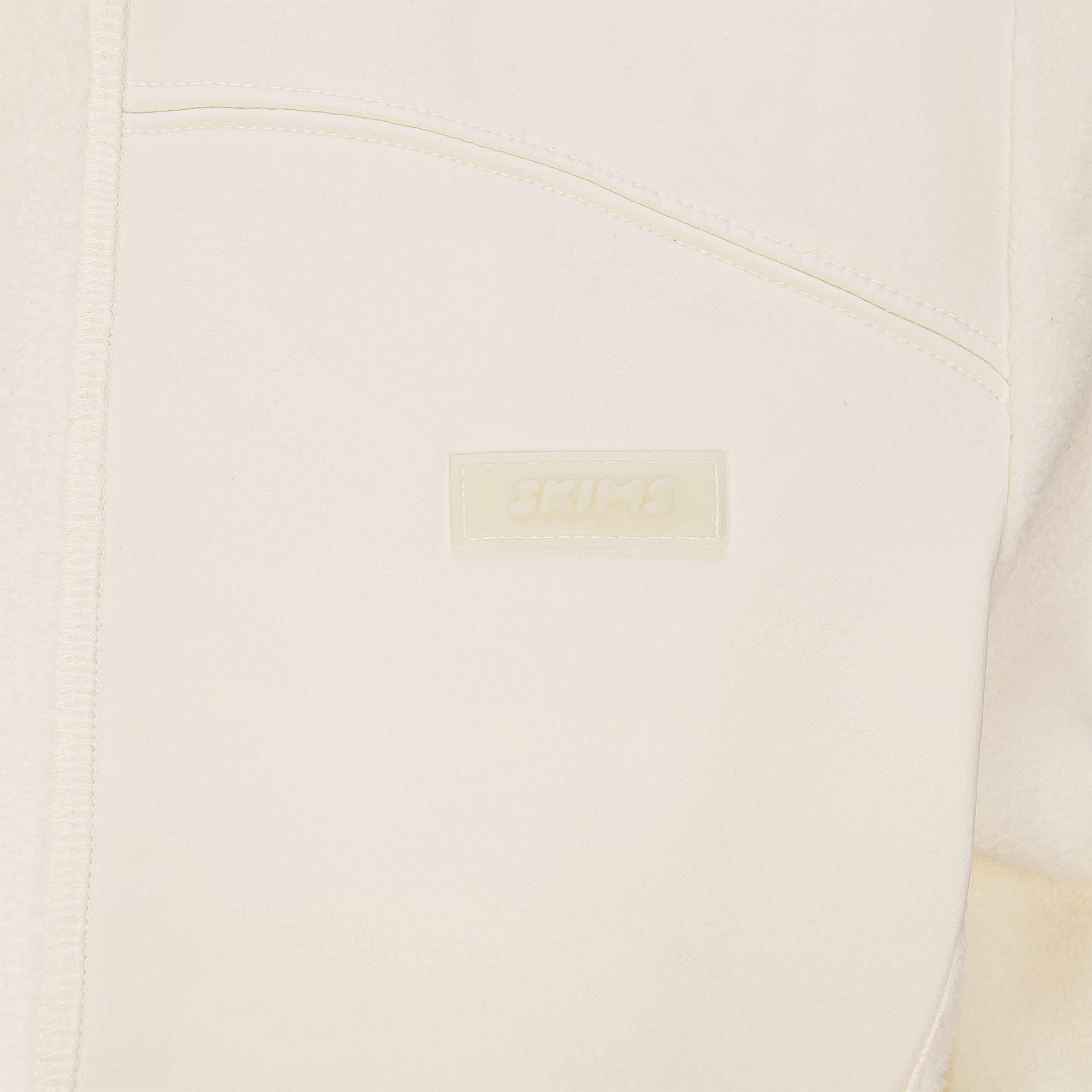 - Zip front, Mock neck, Contrast fabric front panels, Silicone SKIMS logo patch at wearers left side chest, Relaxed fit sleeves, Hits below natural waist
