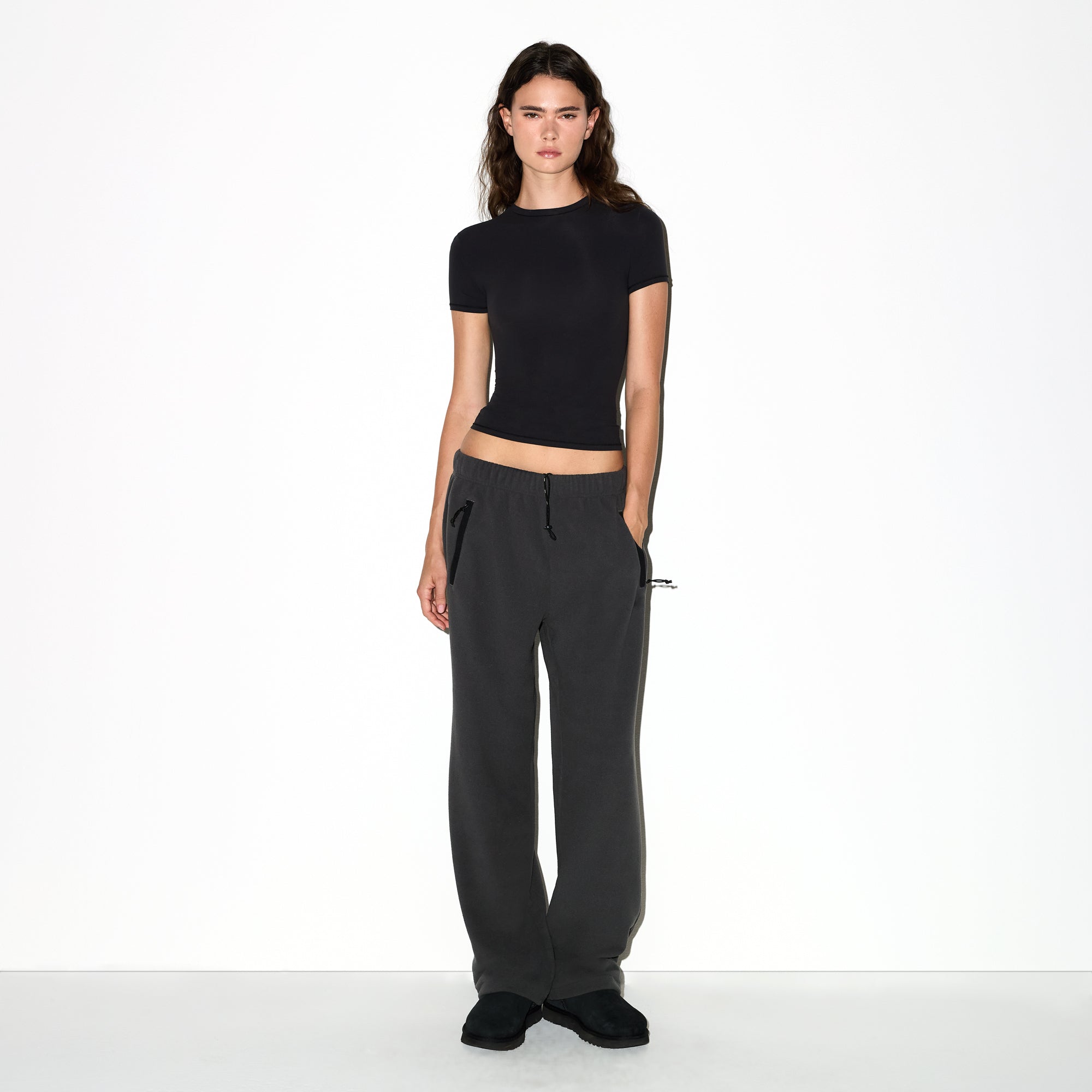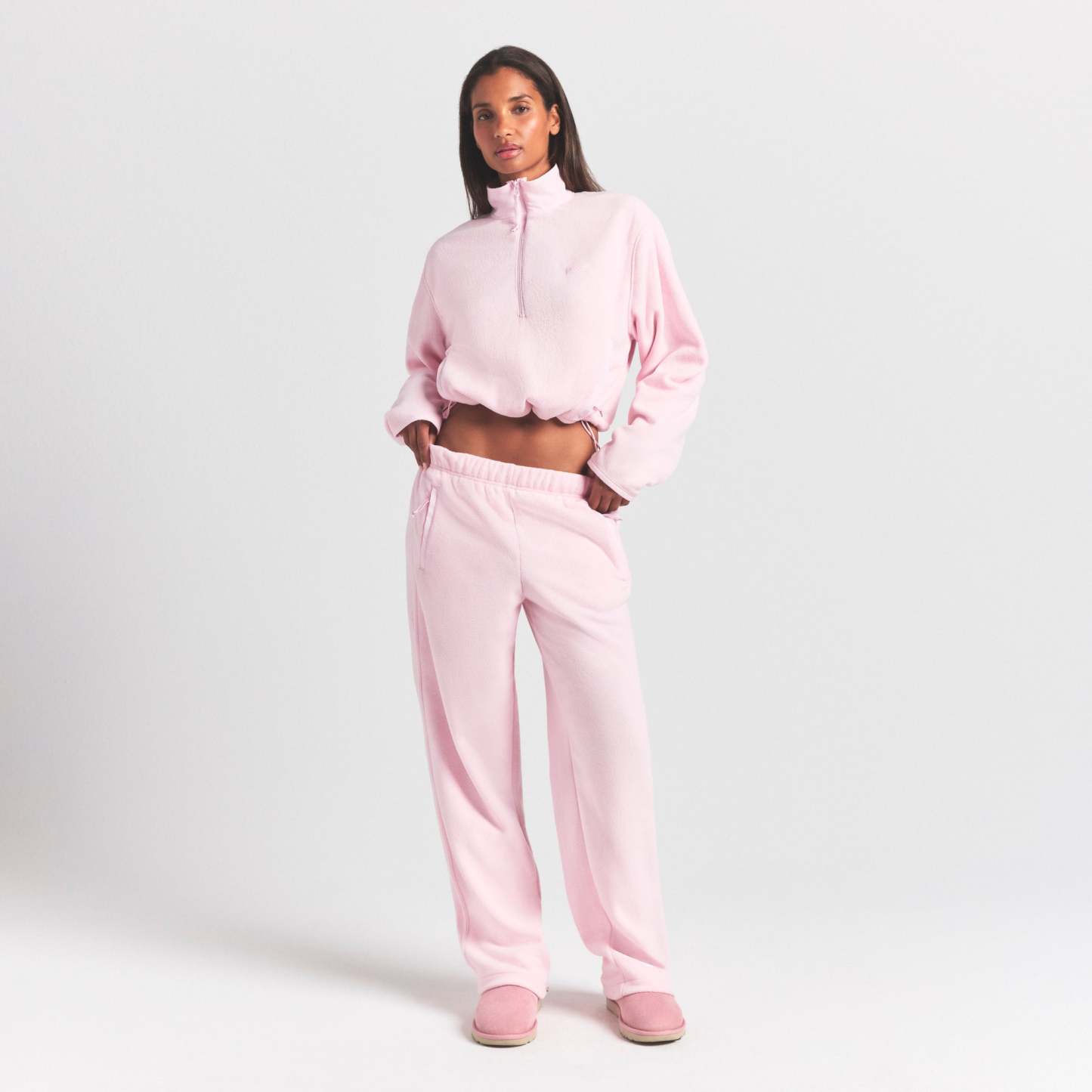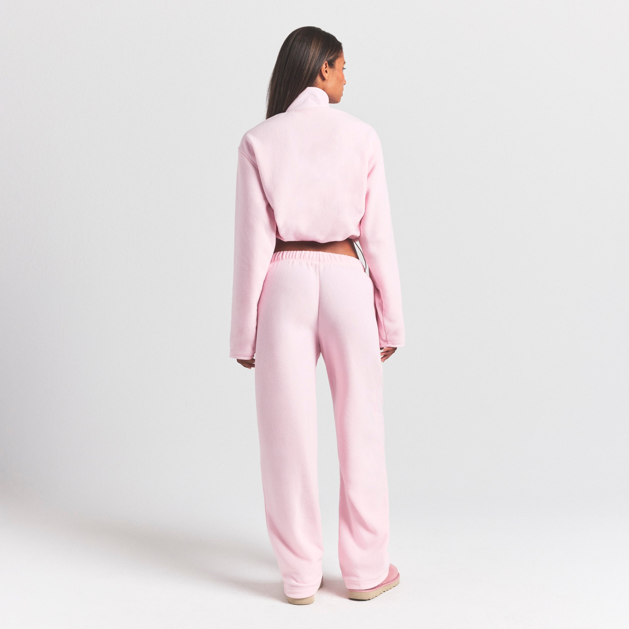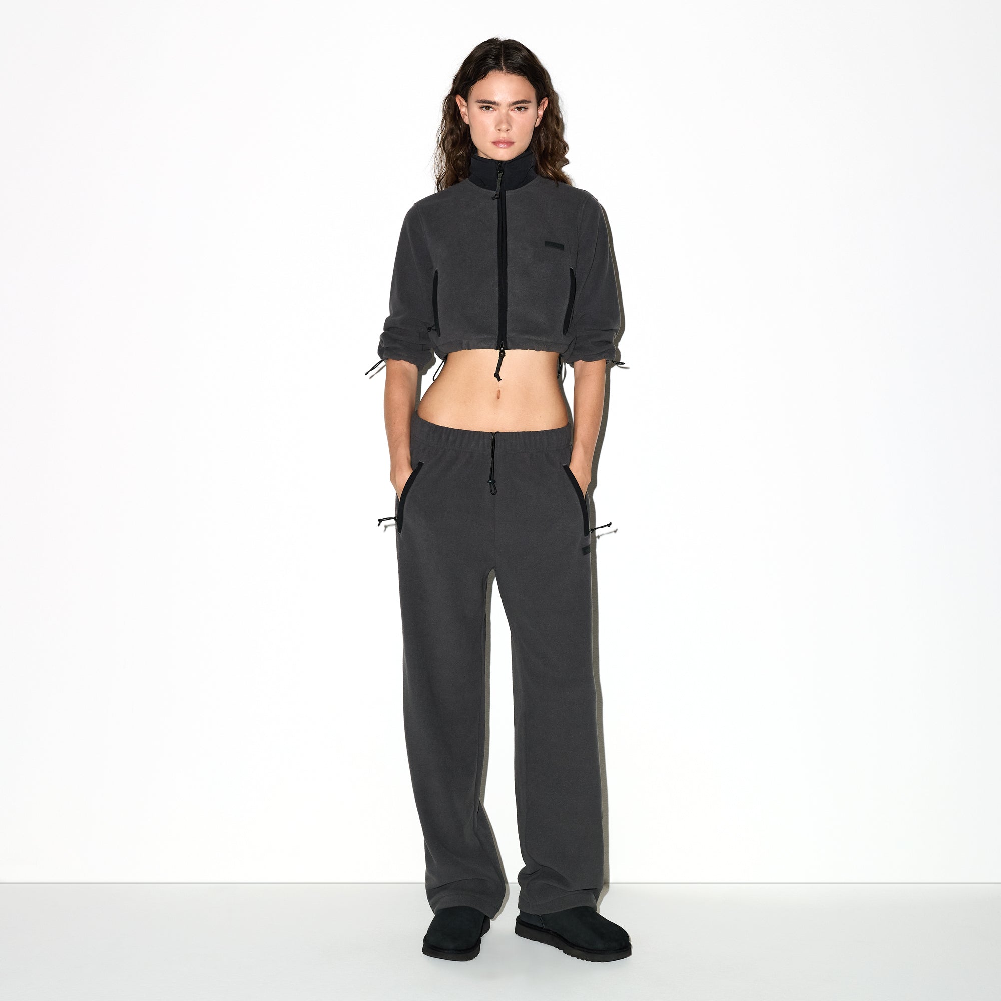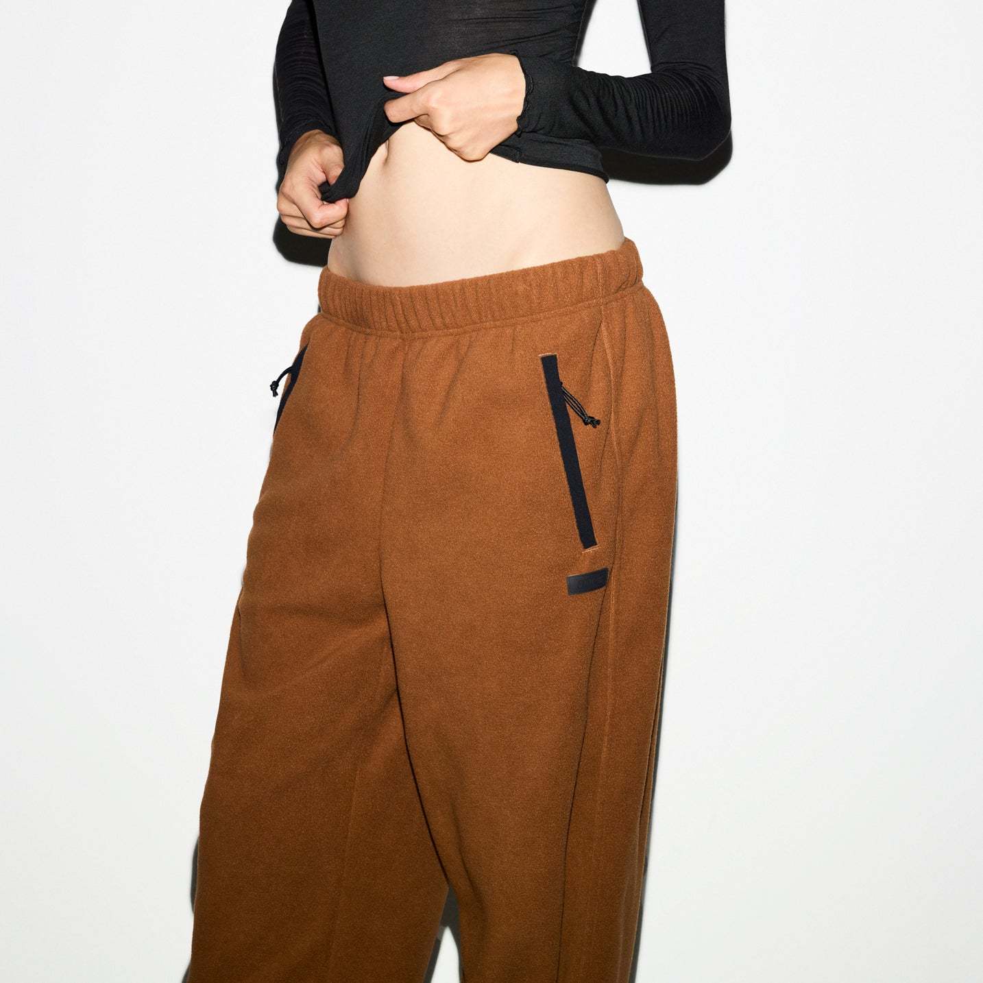 Warm up your cold-weather wardrobe with this chic straight leg pant, designed in our plush, mid-weight polar fleece. Features side zipper pockets, contrast detailing, and an interior bungee cord for an adjustable fit. Fits true to size.