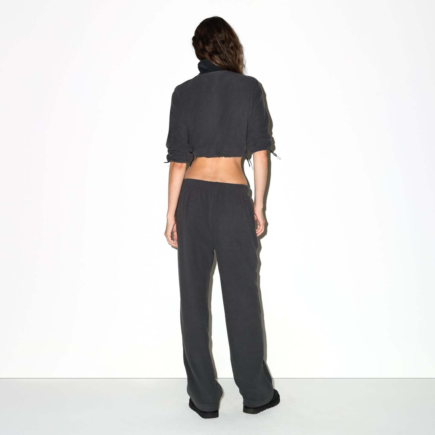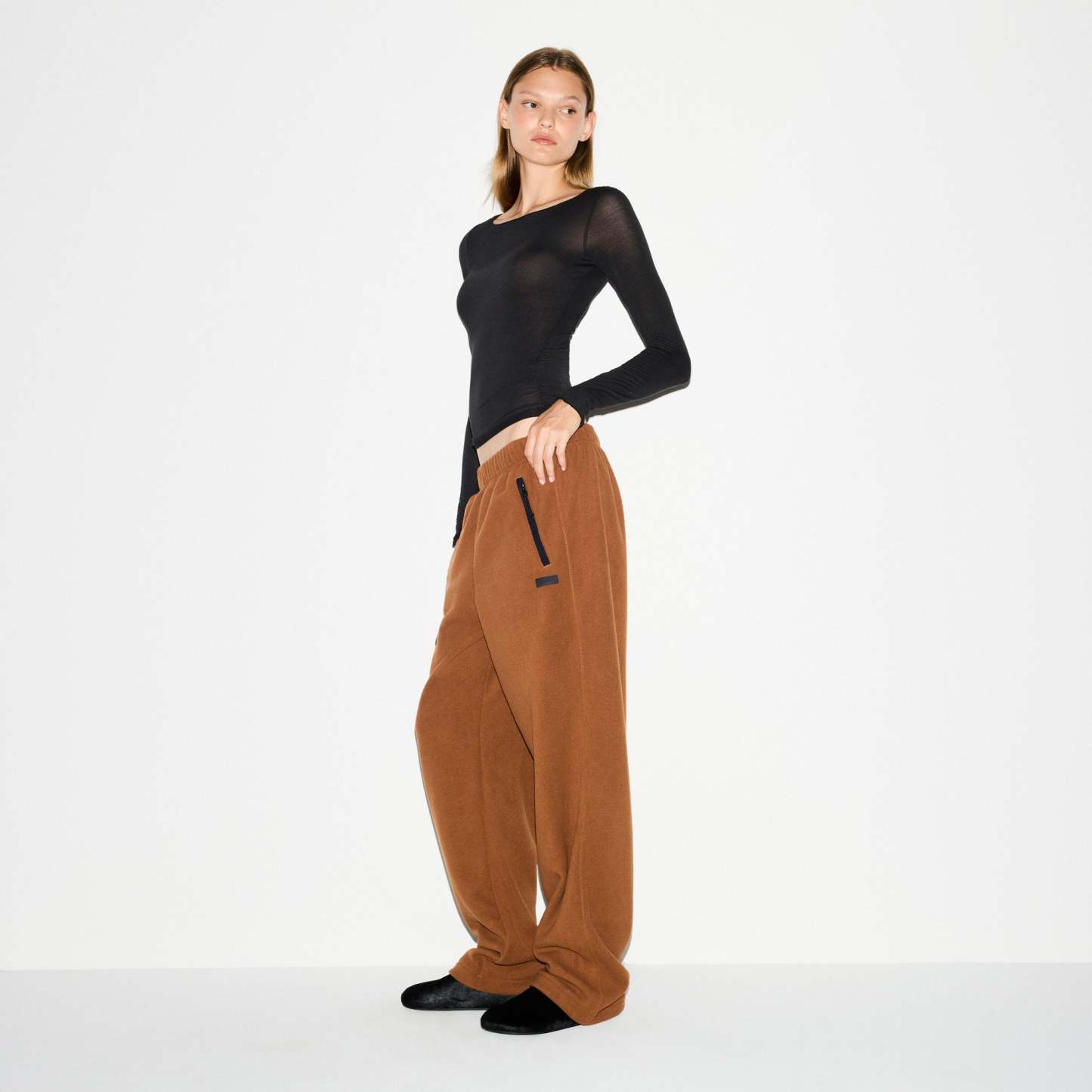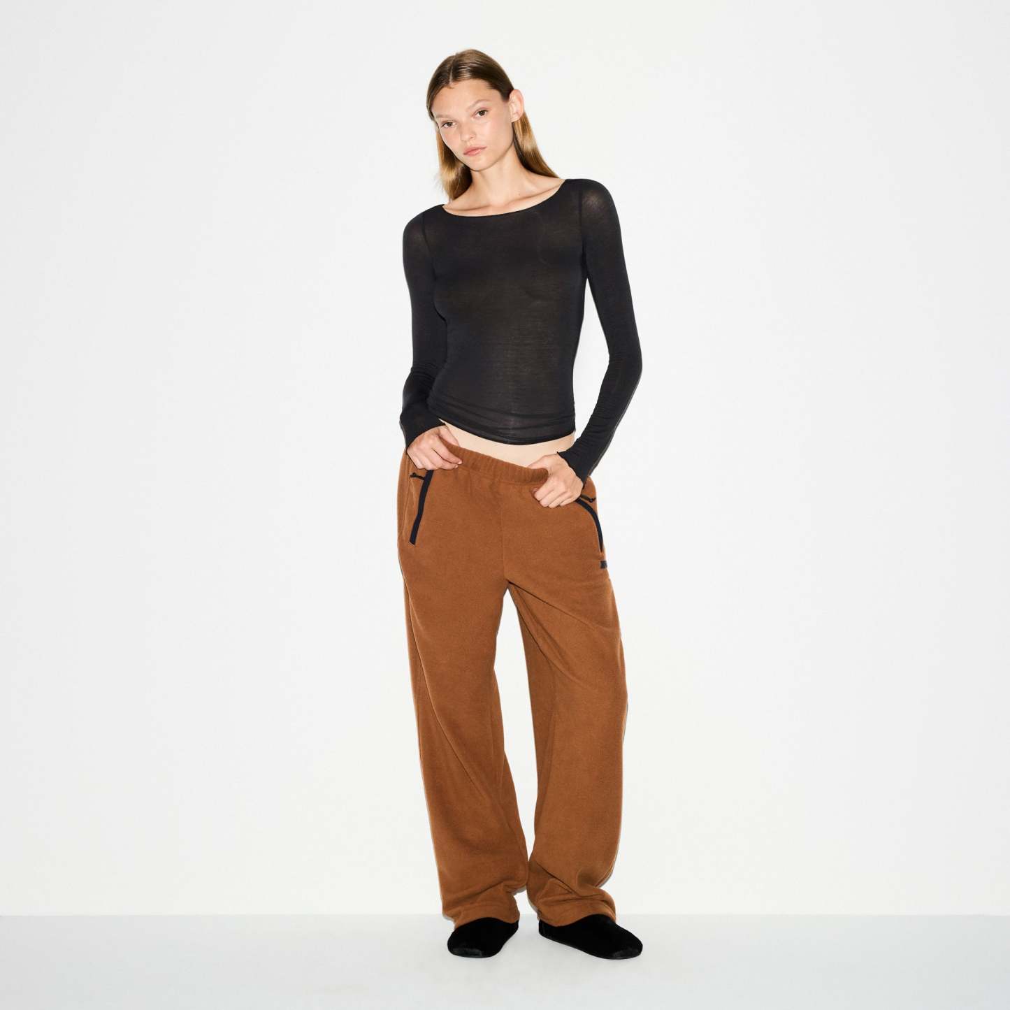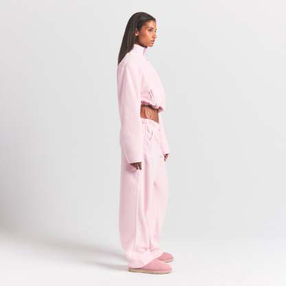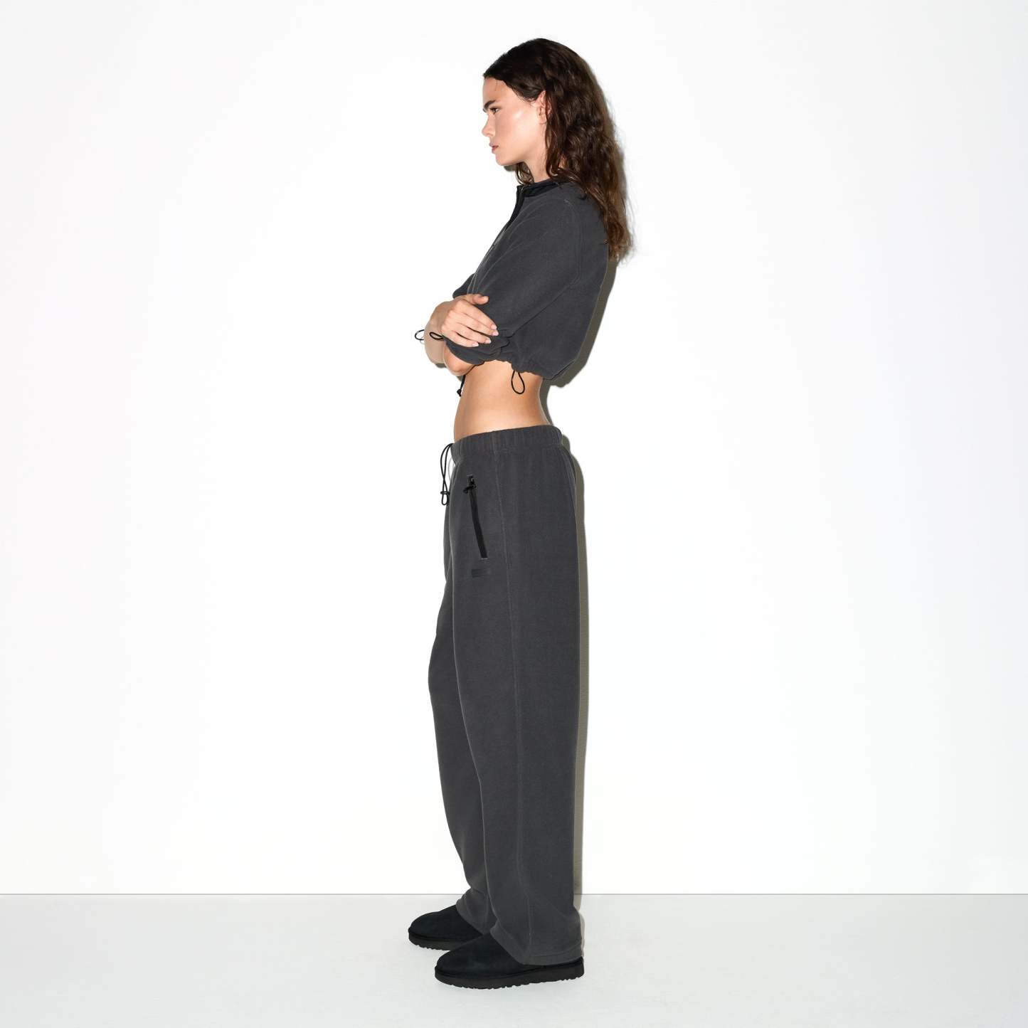 Warm up your cold-weather wardrobe with this chic straight leg pant, designed in our plush, mid-weight polar fleece. Features side zipper pockets, contrast detailing, and an interior bungee cord for an adjustable fit. Fits true to size.