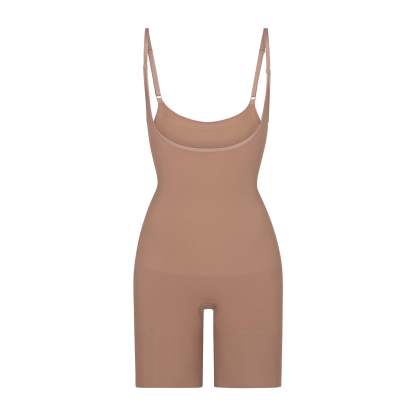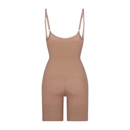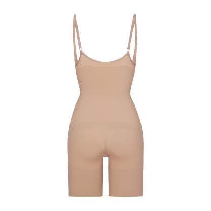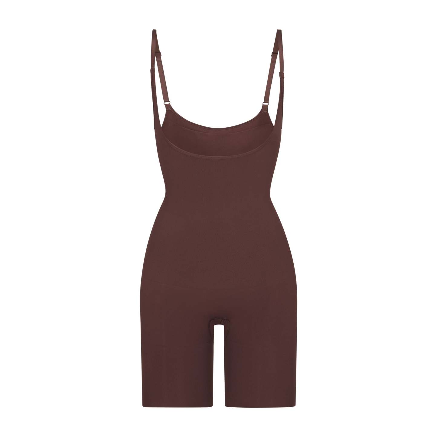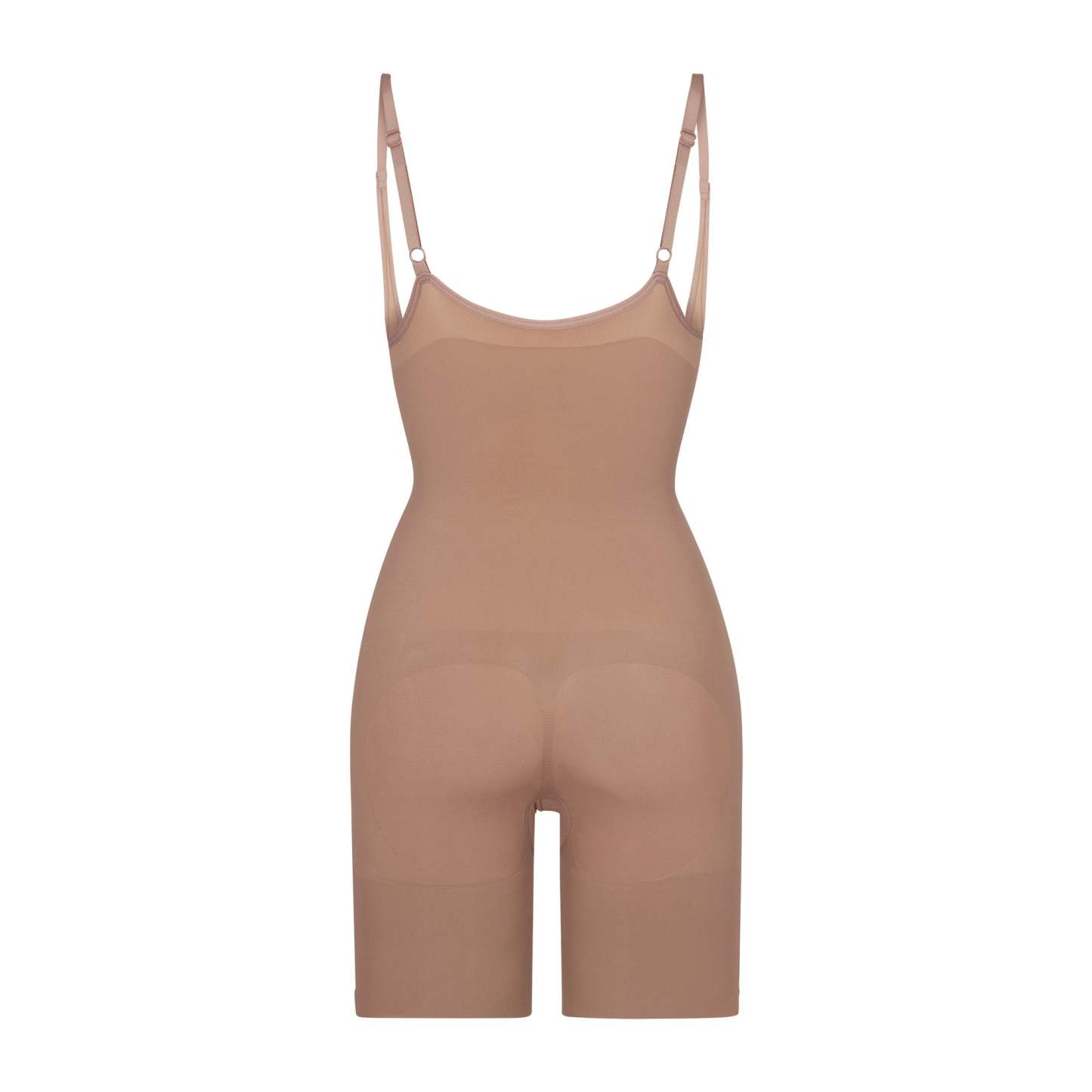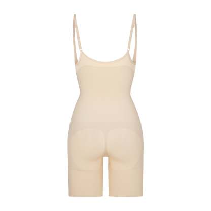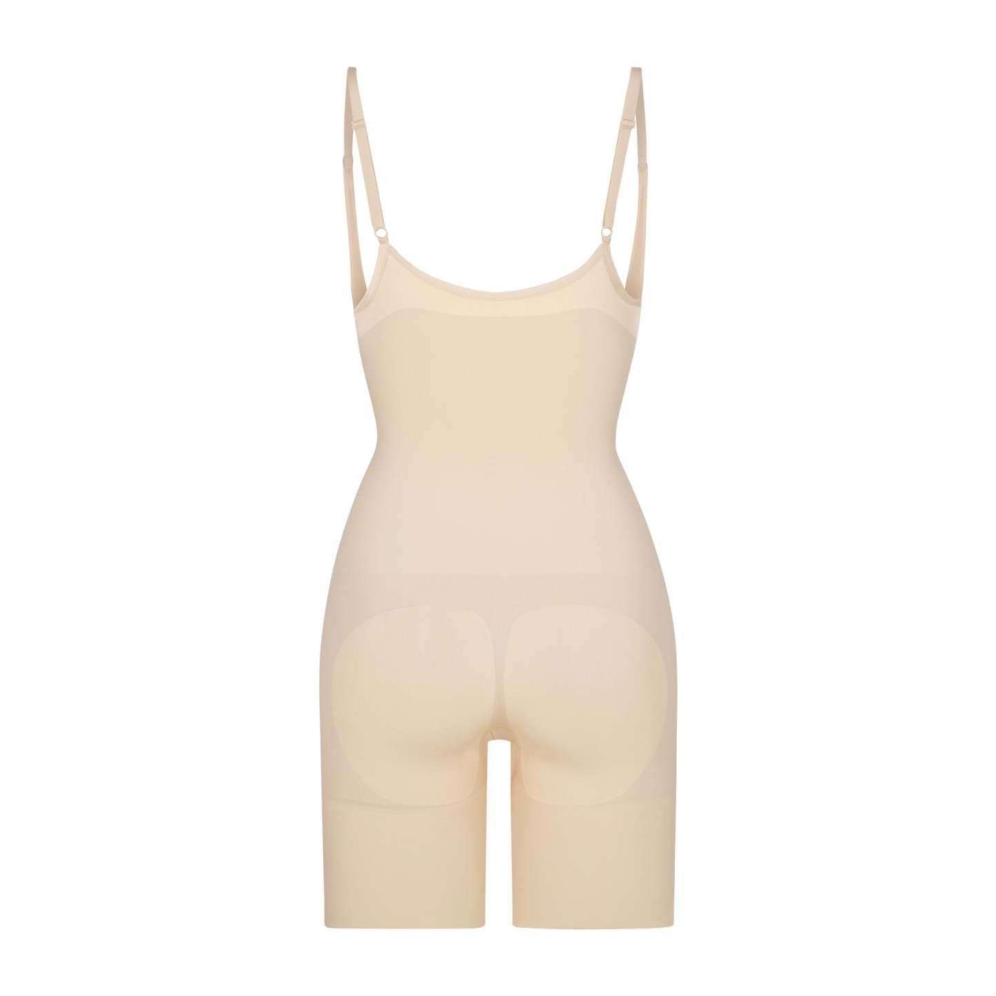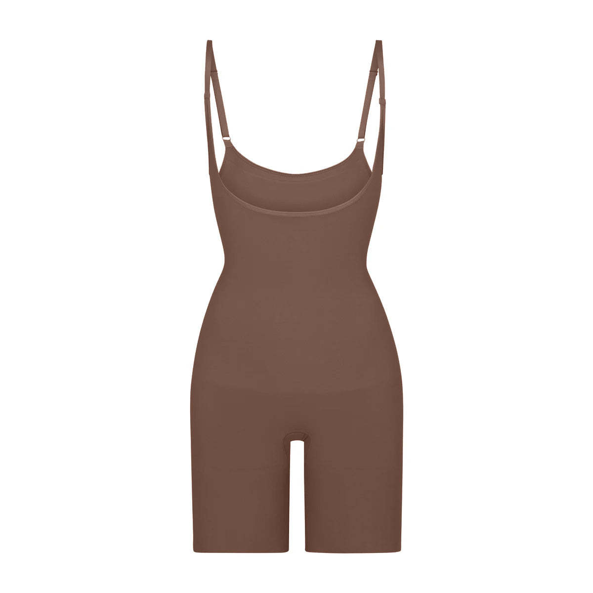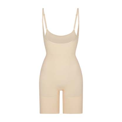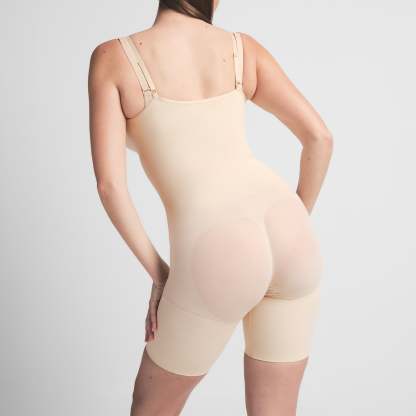Butt lifting open bust bodysuit that offers support and control, Open bust scoop neckline to wear with the bra of your choice, Elastic adjustable straps, Double ply compression on thigh, Mid level compression along core and waist, Light butt support to help encentuate and enhance figure, Hits at mid thigh, Open gusset
