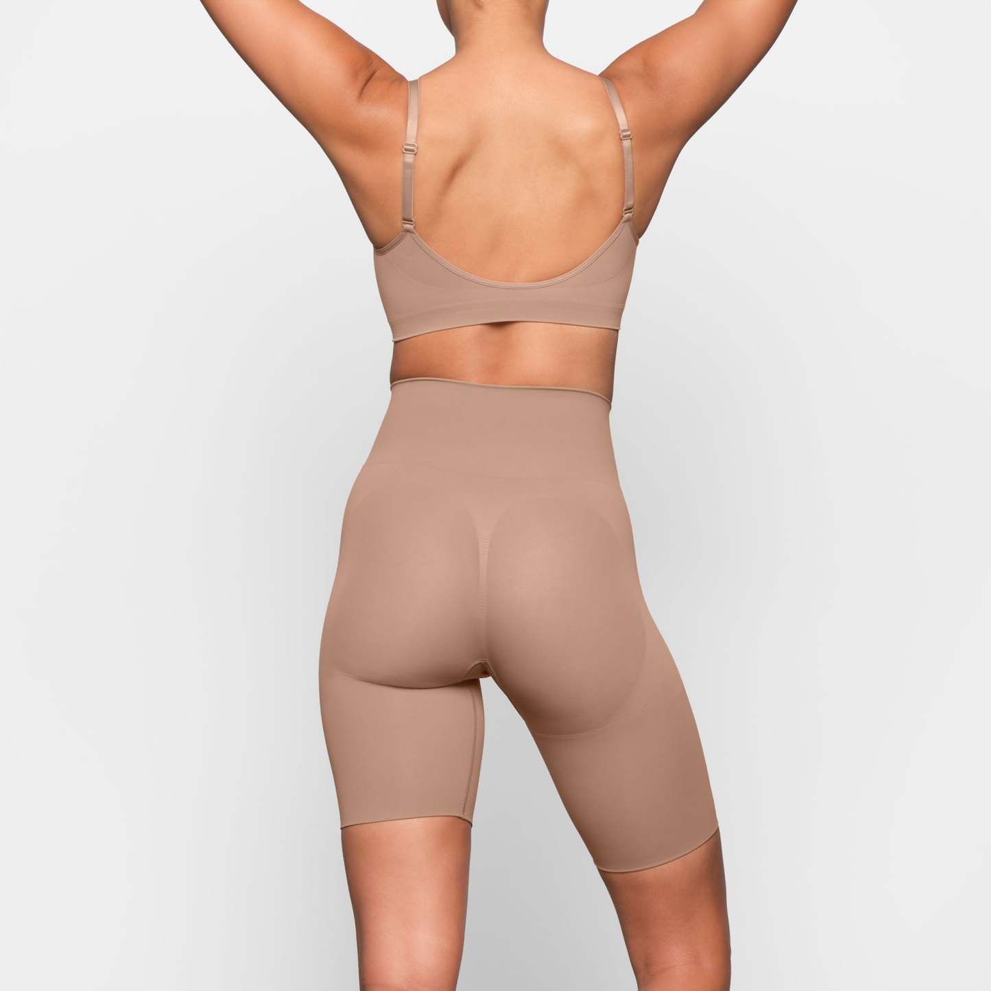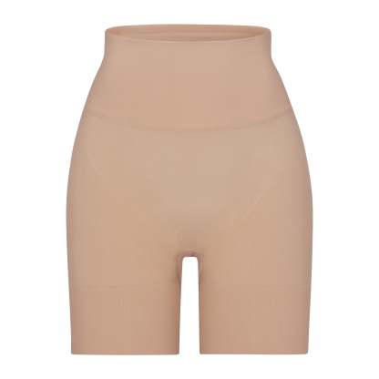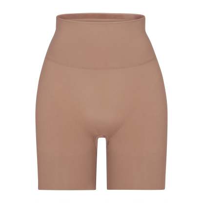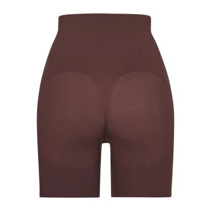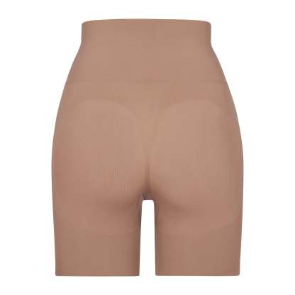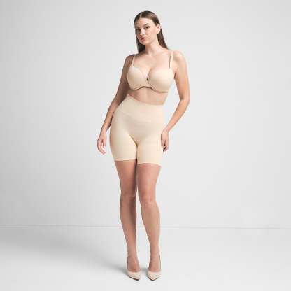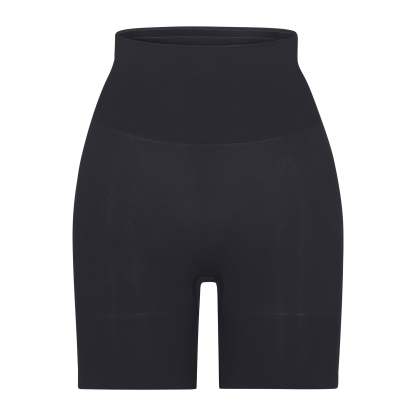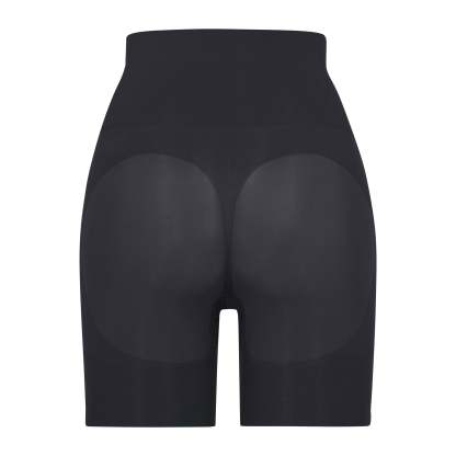 Butt lifting short that offers support and control, Sits at natural waist, Grip along waistband to help, Stay in place, Double ply compression around the thigh and waist, Light butt support to help encentuate and enhance figure, Hits at mid thigh, Open gusset