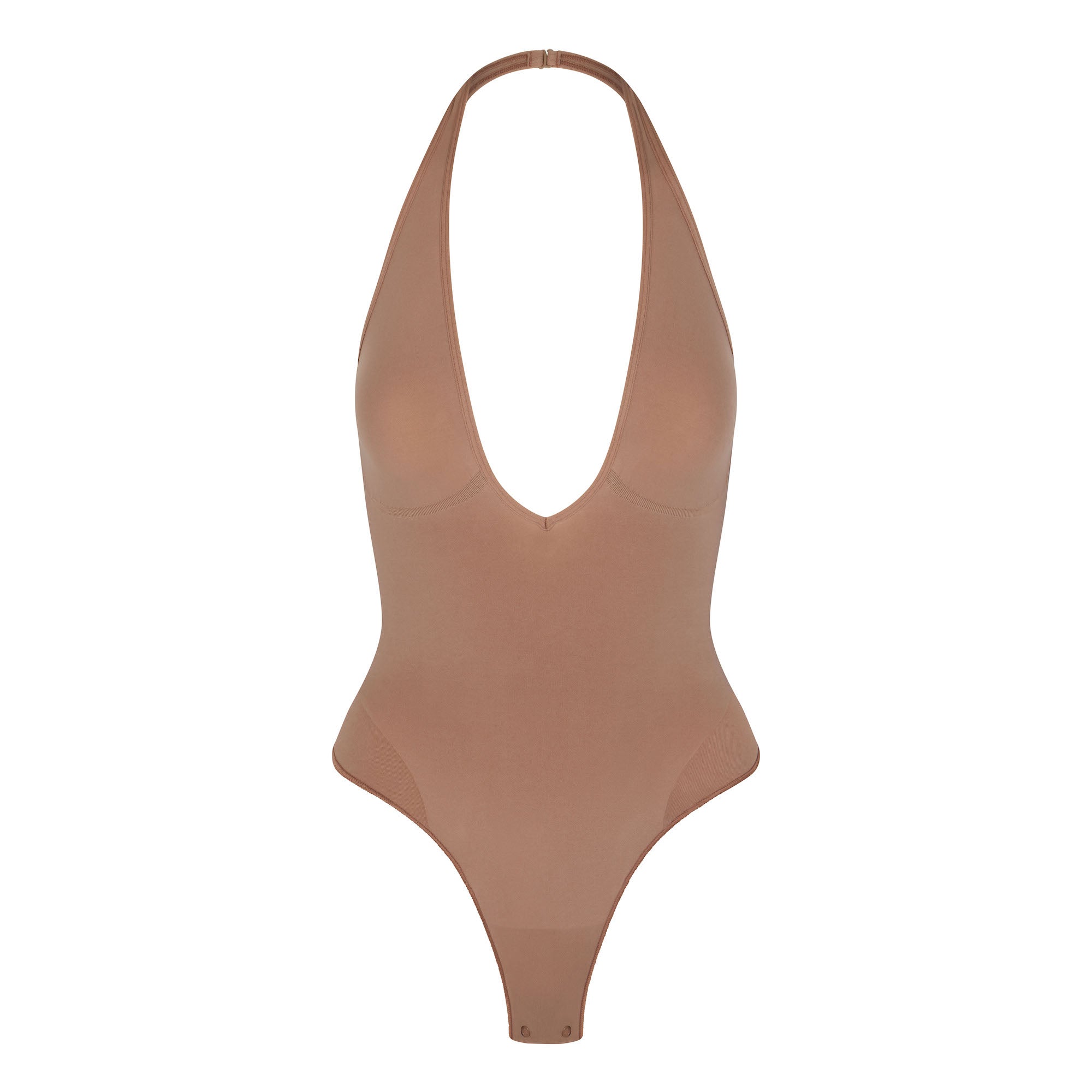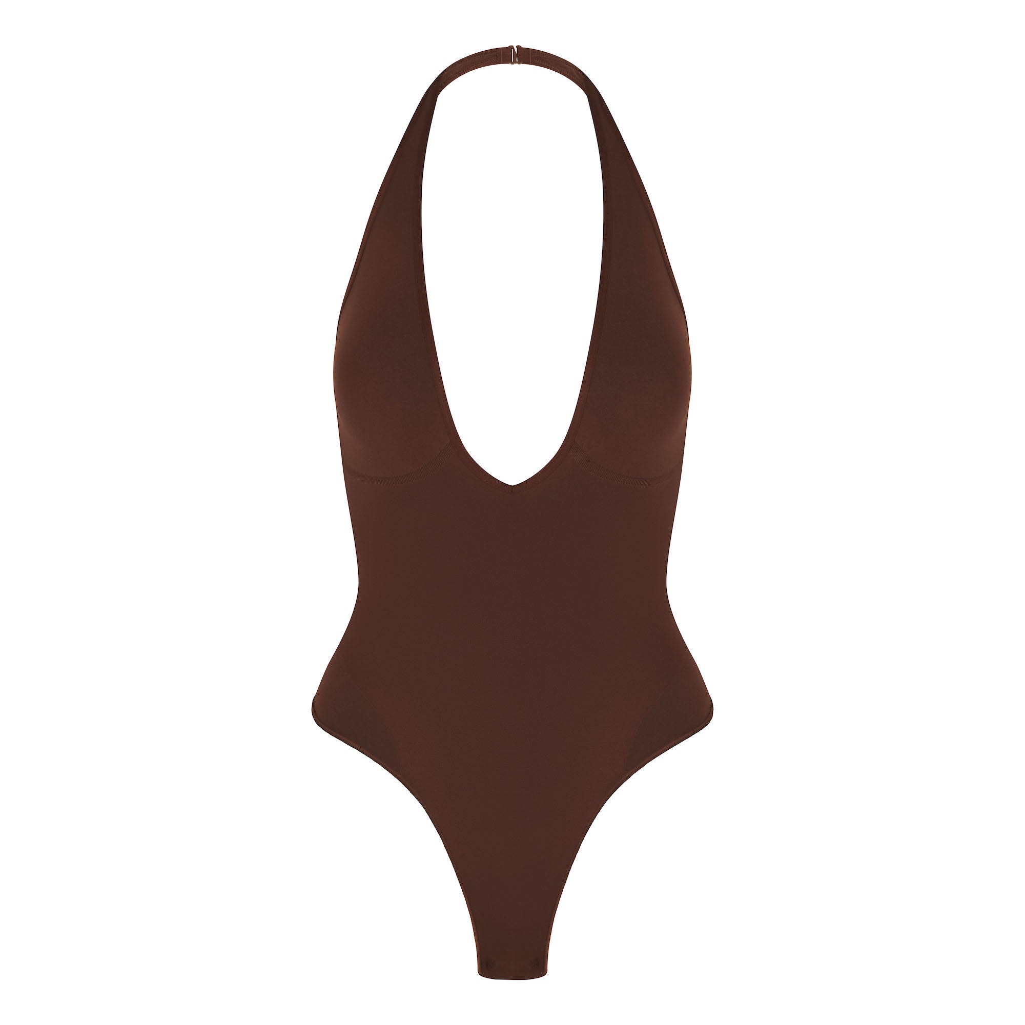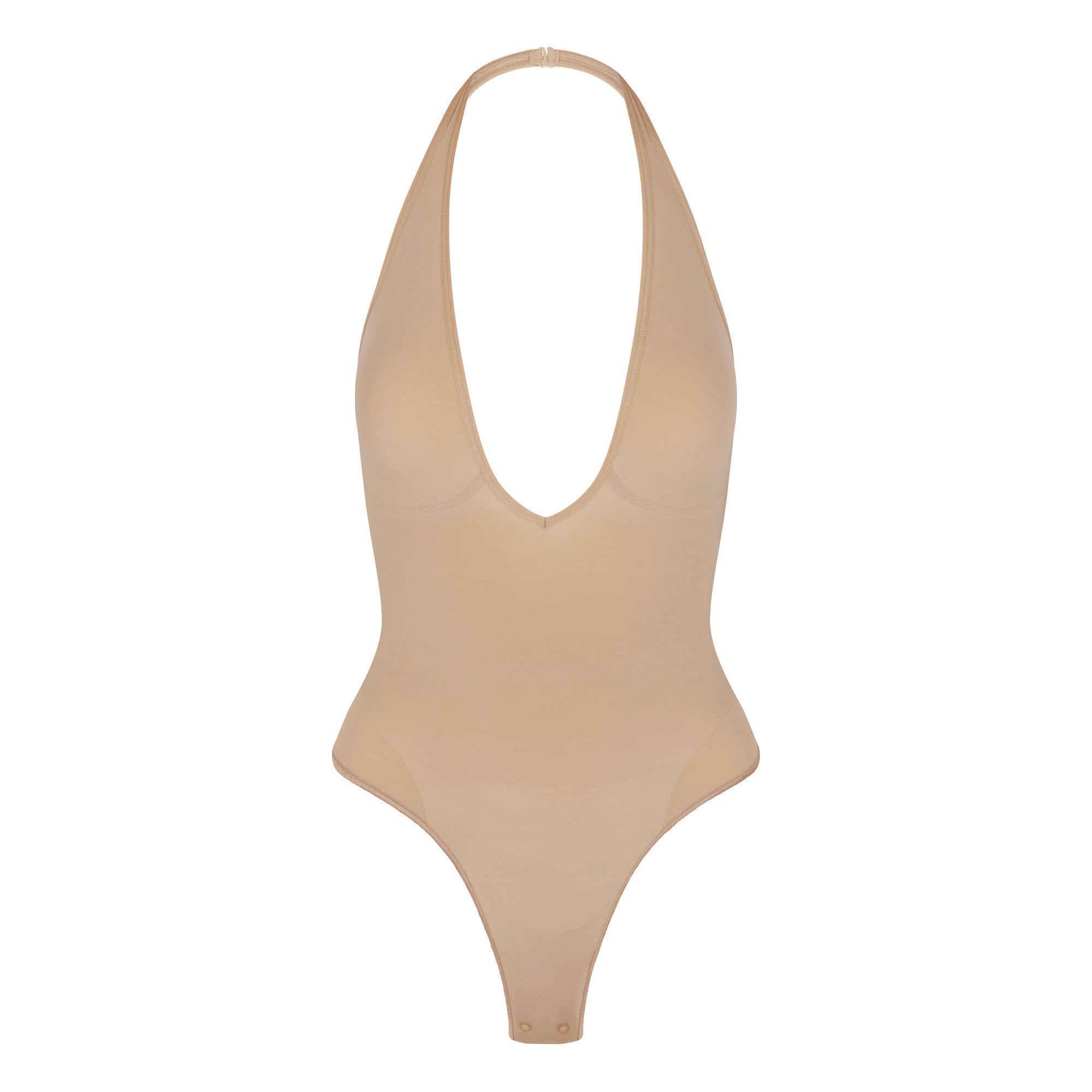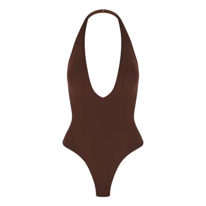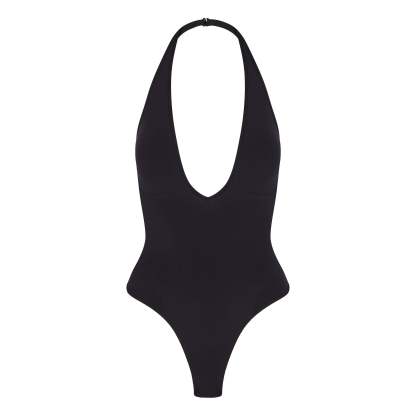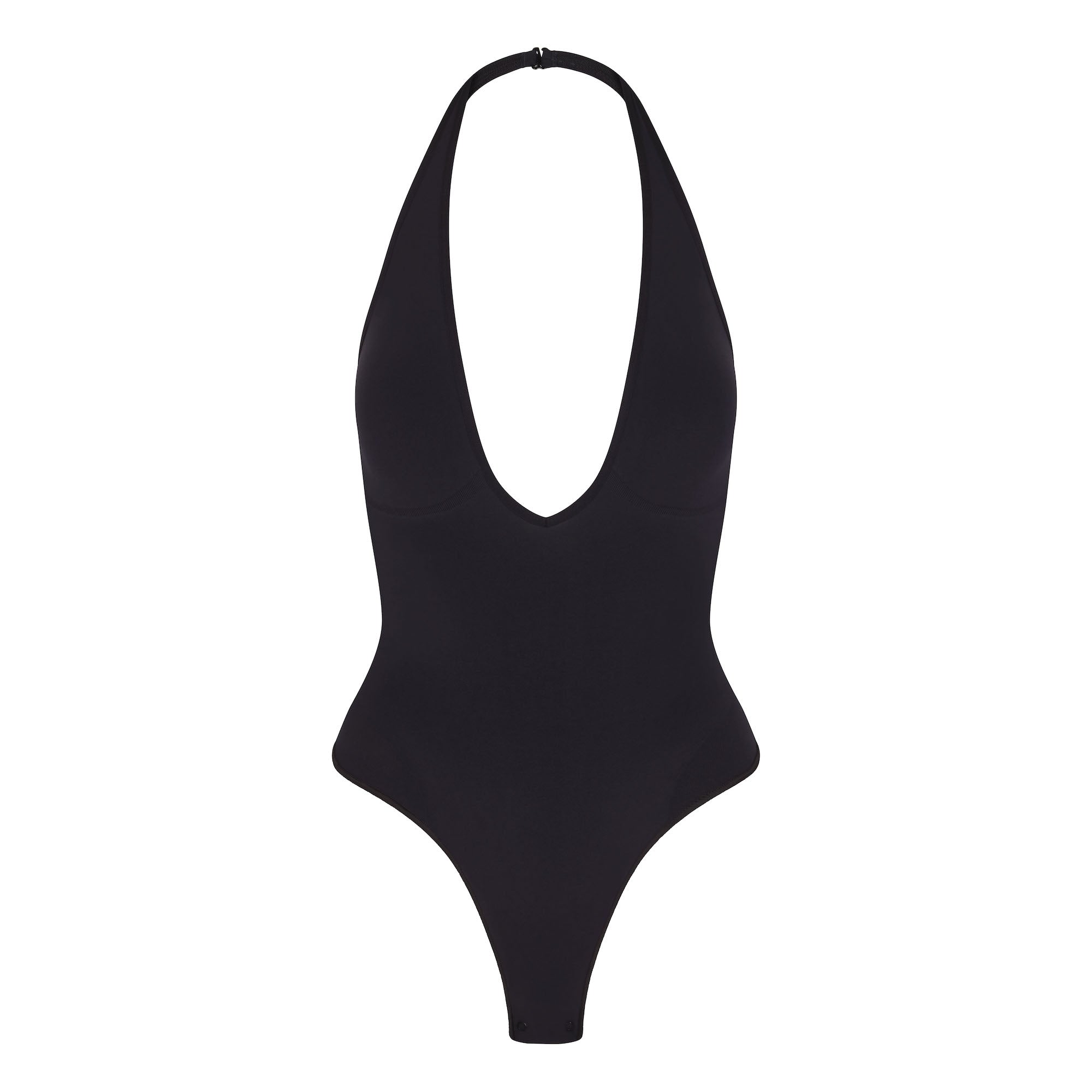 Deep plunge neckline, Single layered cups, Removeable/adjustable multi-way straps with hook closure, Straps can be worn as halter, shoulder, or cross-back, Low back, Open gusset, Targeted compression at tummy and waist, Inseam: S: 5 ½”, 2X: 6 ½”