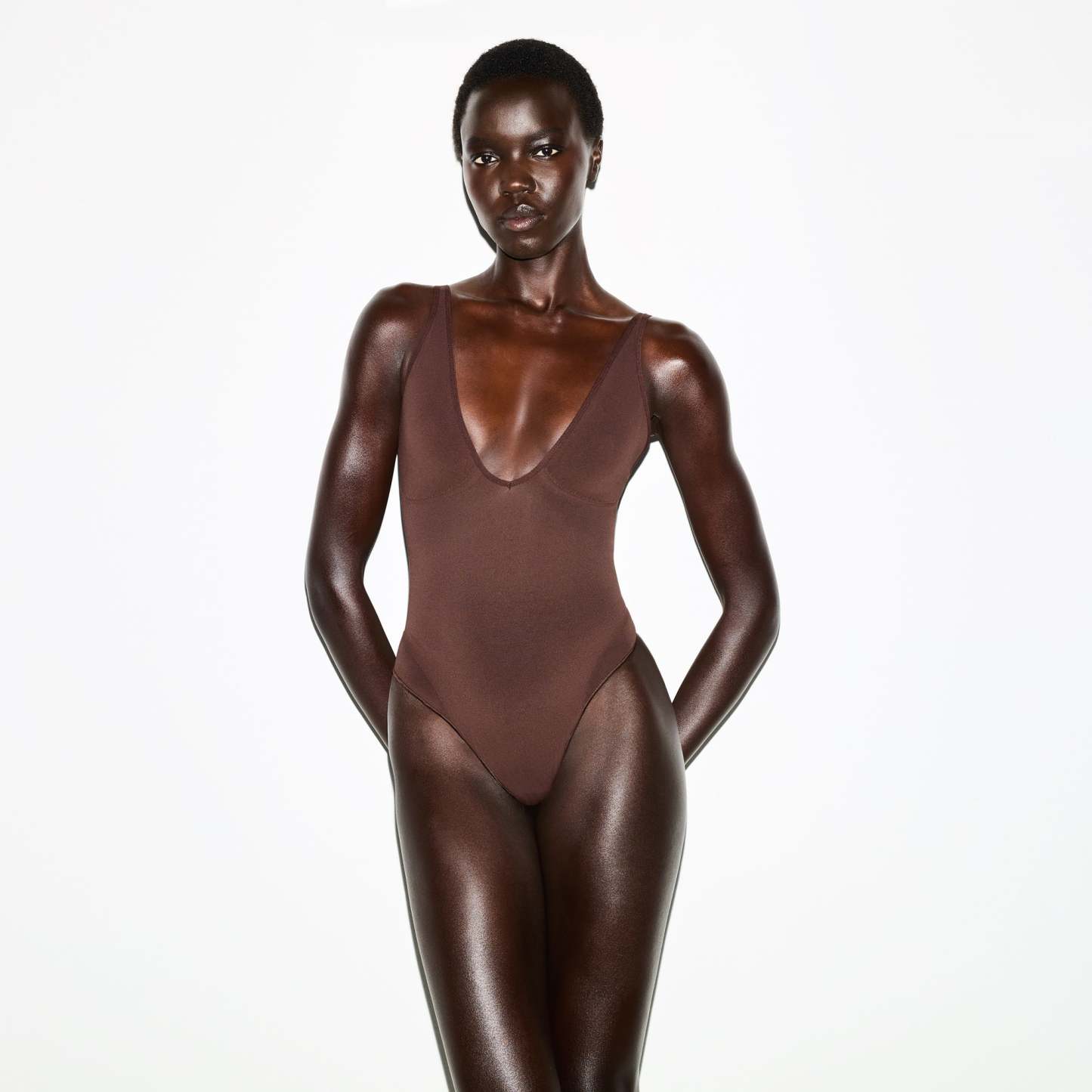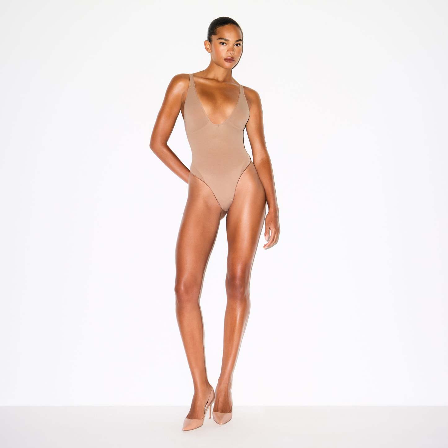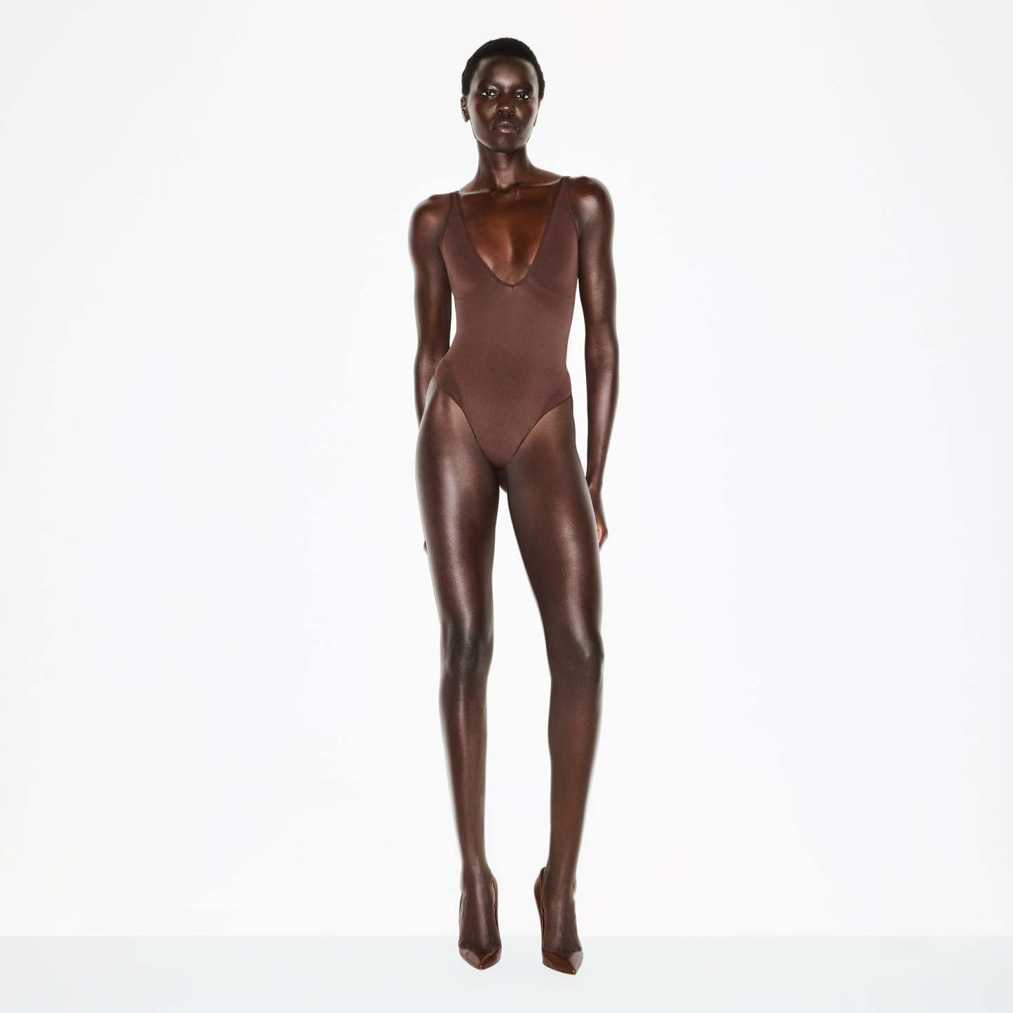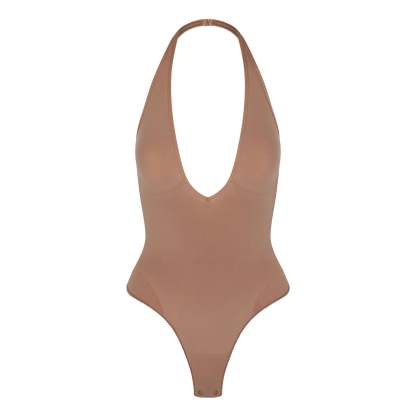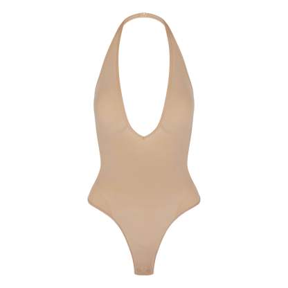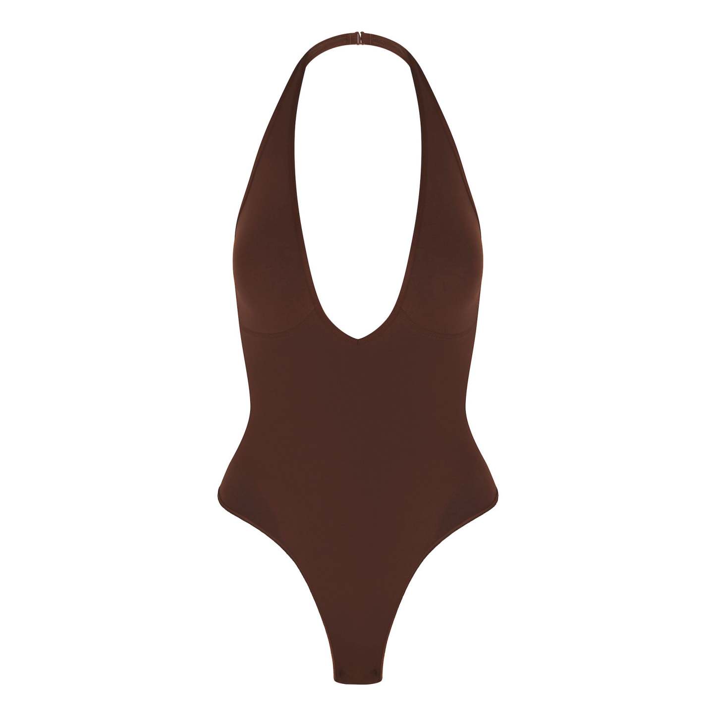 Deep plunge neckline, Single layered cups, Removeable/adjustable multi-way straps with hook closure, Straps can be worn as halter, shoulder, or cross-back, Low back, Open gusset, Targeted compression at tummy and waist, Inseam: S: 5 ½”, 2X: 6 ½”
