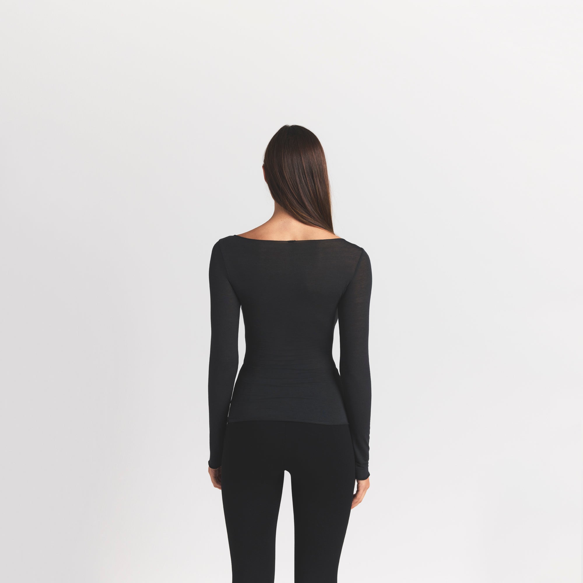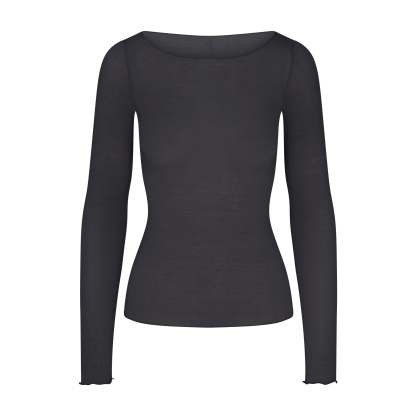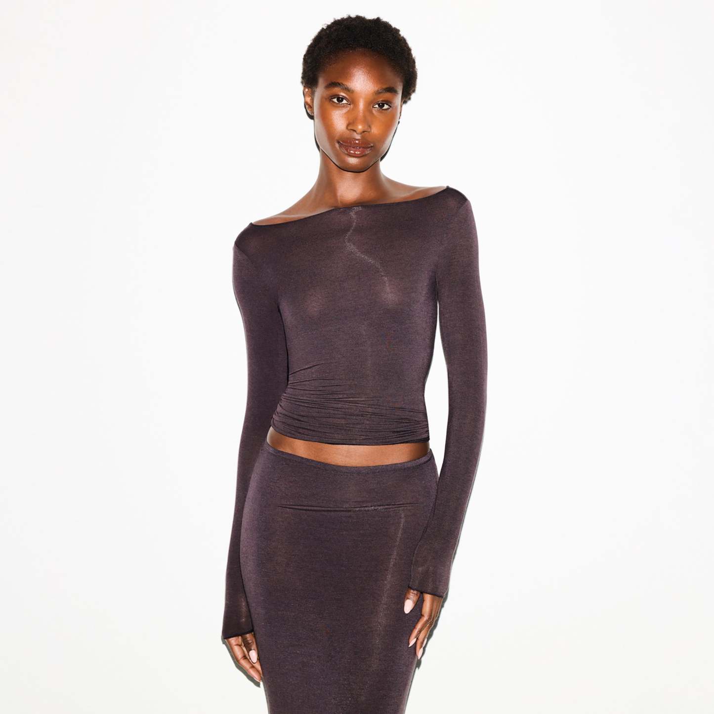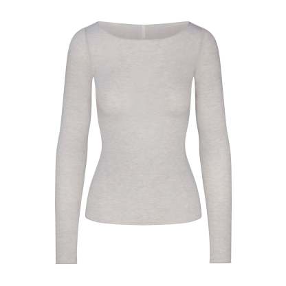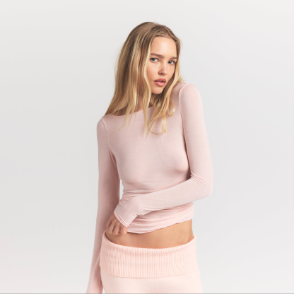 Your most elevated lounge top. Sheer with a fitted silhouette, this chic style keeps you comfortable with its incredibly soft and stretchy modal-cashmere fabric. Elevated with a wide boat neck and extra long sleeves. Wear with the Sheer Modal Straight Leg Pant to complete the set. Hits below the natural waist and fits true to size.
