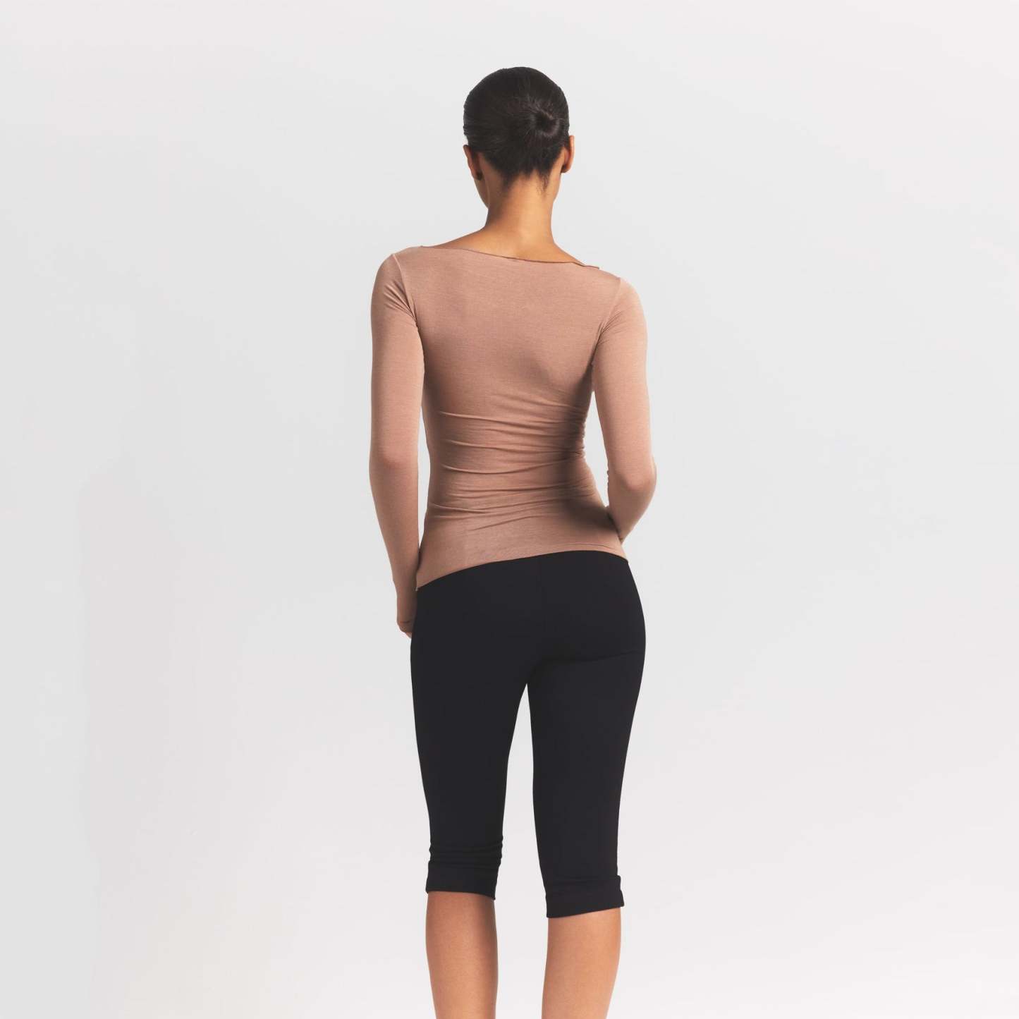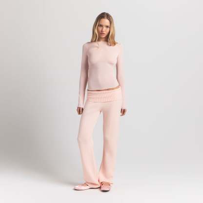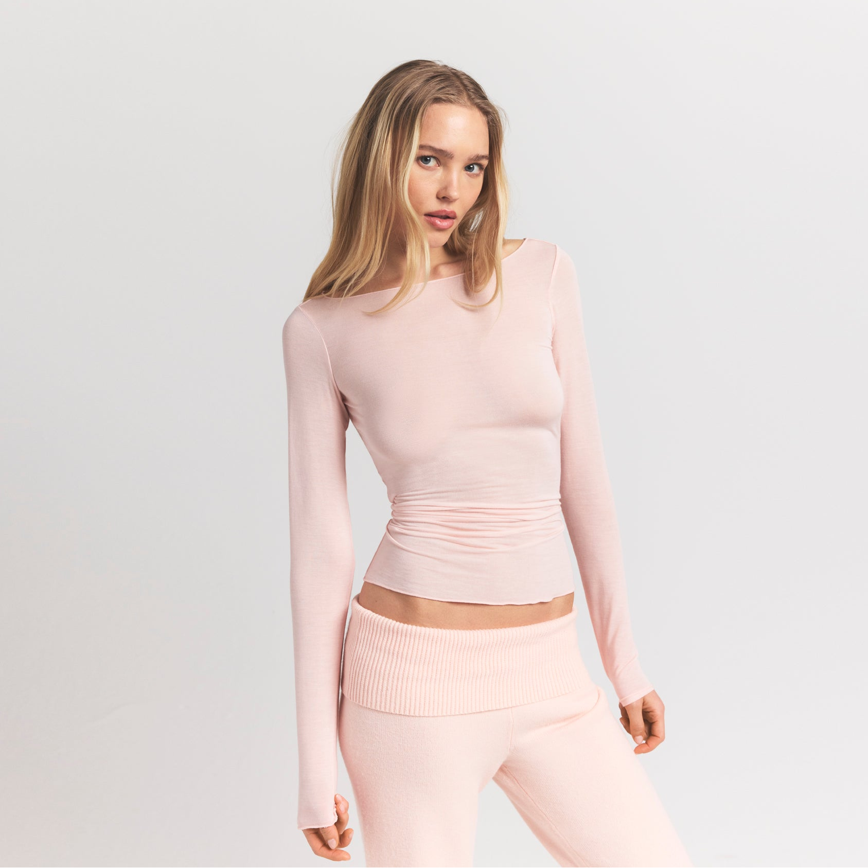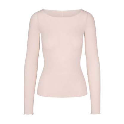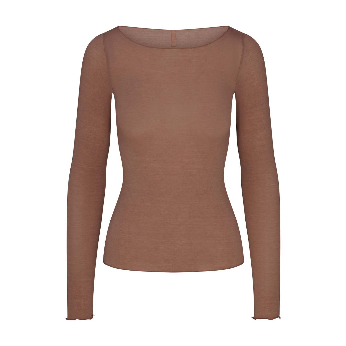 Your most elevated lounge top. Sheer with a fitted silhouette, this chic style keeps you comfortable with its incredibly soft and stretchy modal-cashmere fabric. Elevated with a wide boat neck and extra long sleeves. Wear with the Sheer Modal Straight Leg Pant to complete the set. Hits below the natural waist and fits true to size.