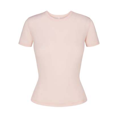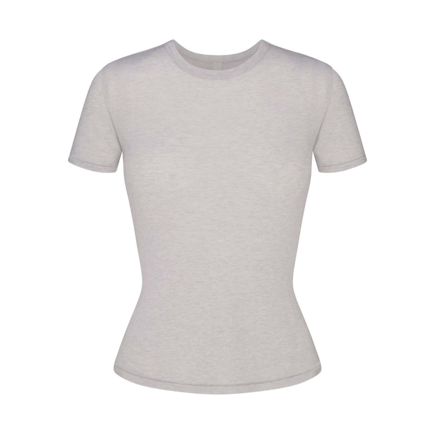Crew neckline, Short sleeves, Fits tight to body, Long length