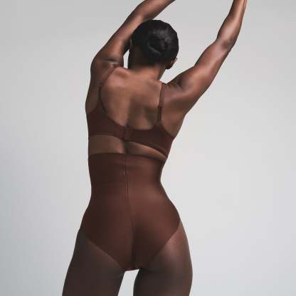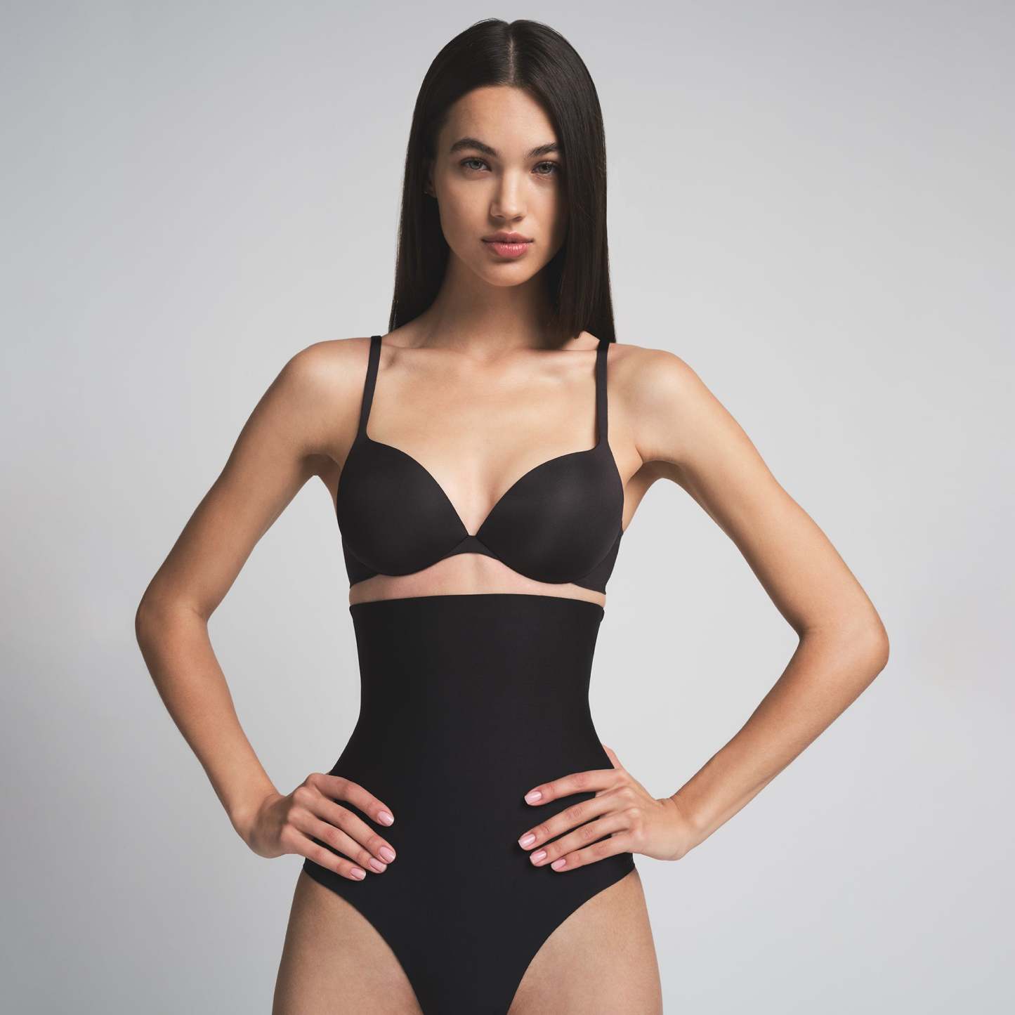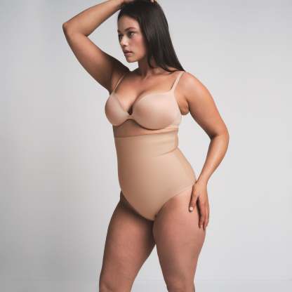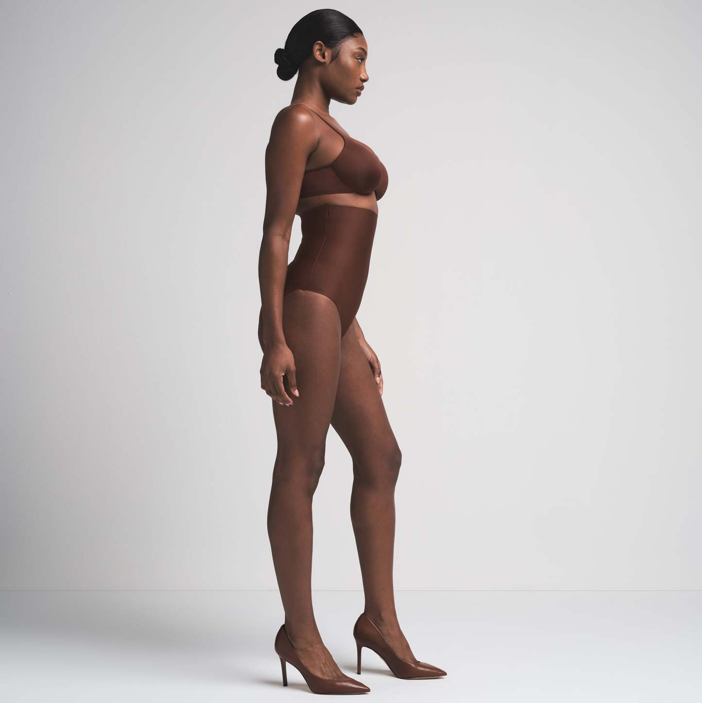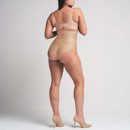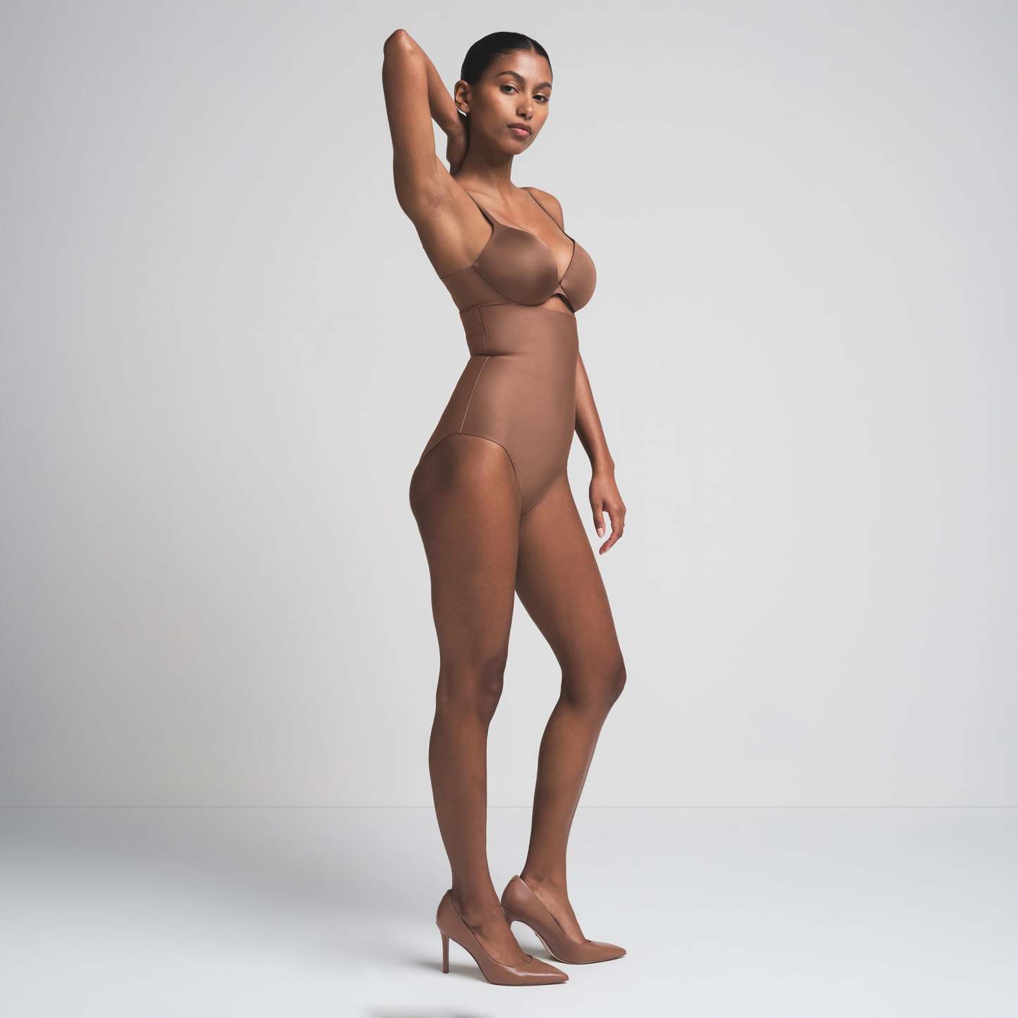 High-waisted, Bonded targeted core compression, Brief back coverage, Raw cut leg opening