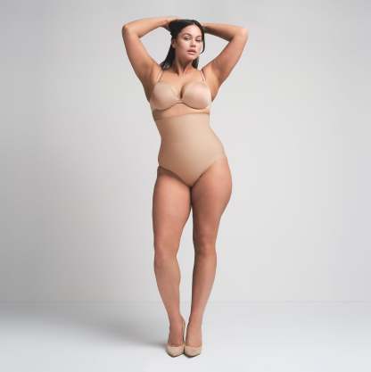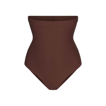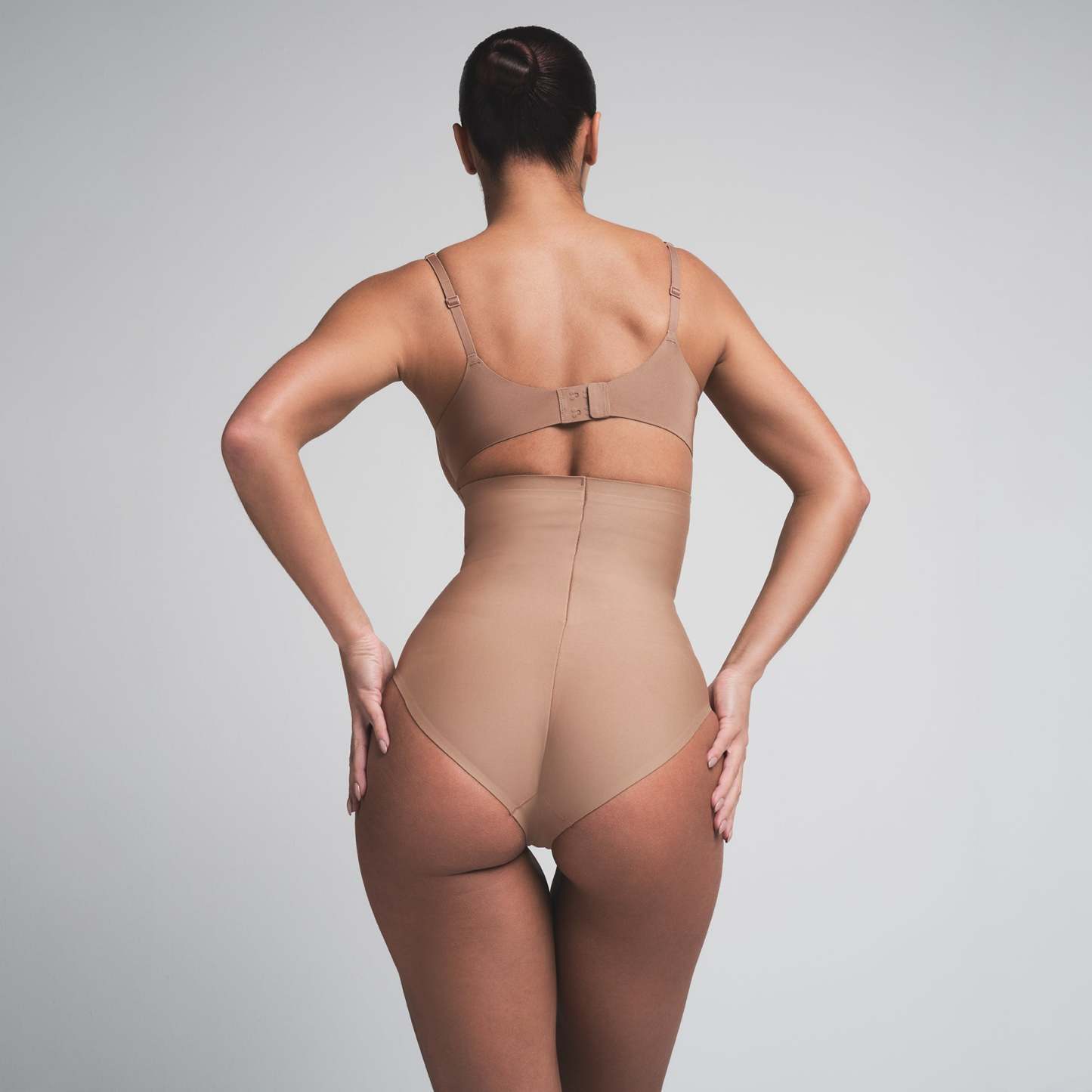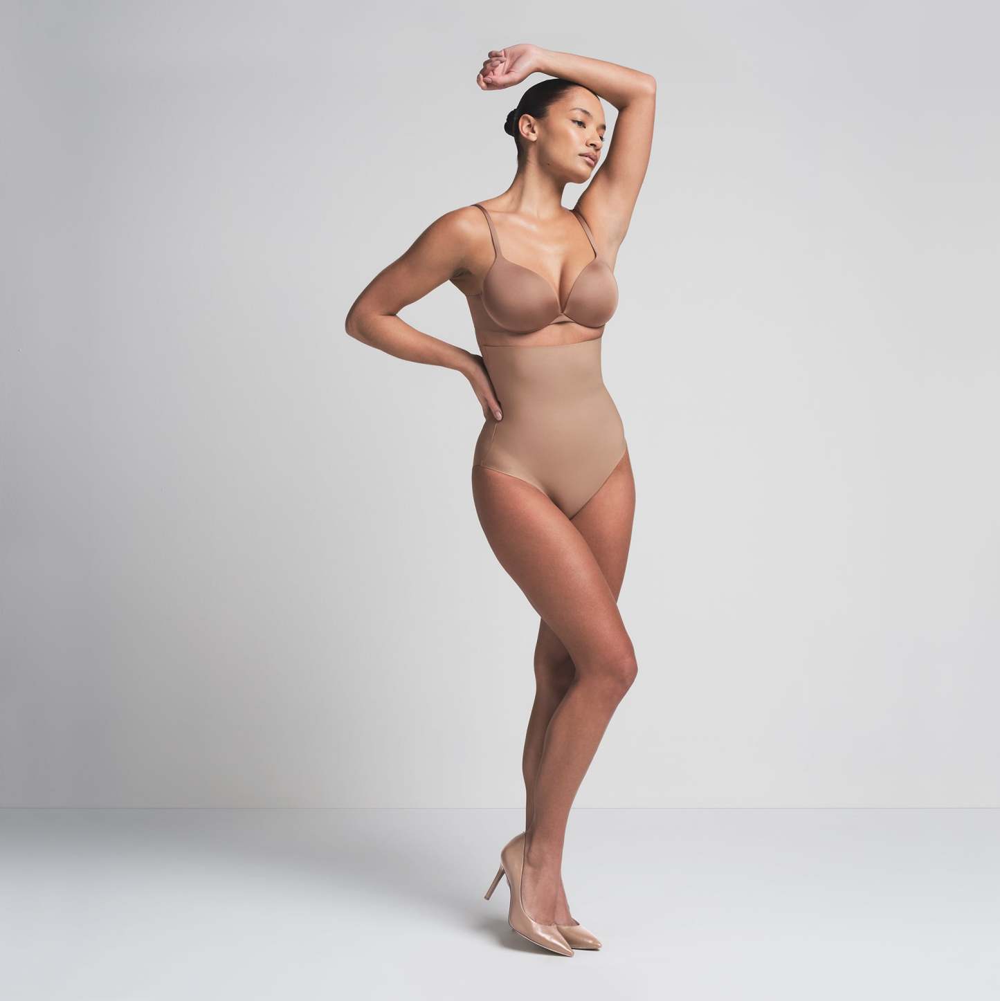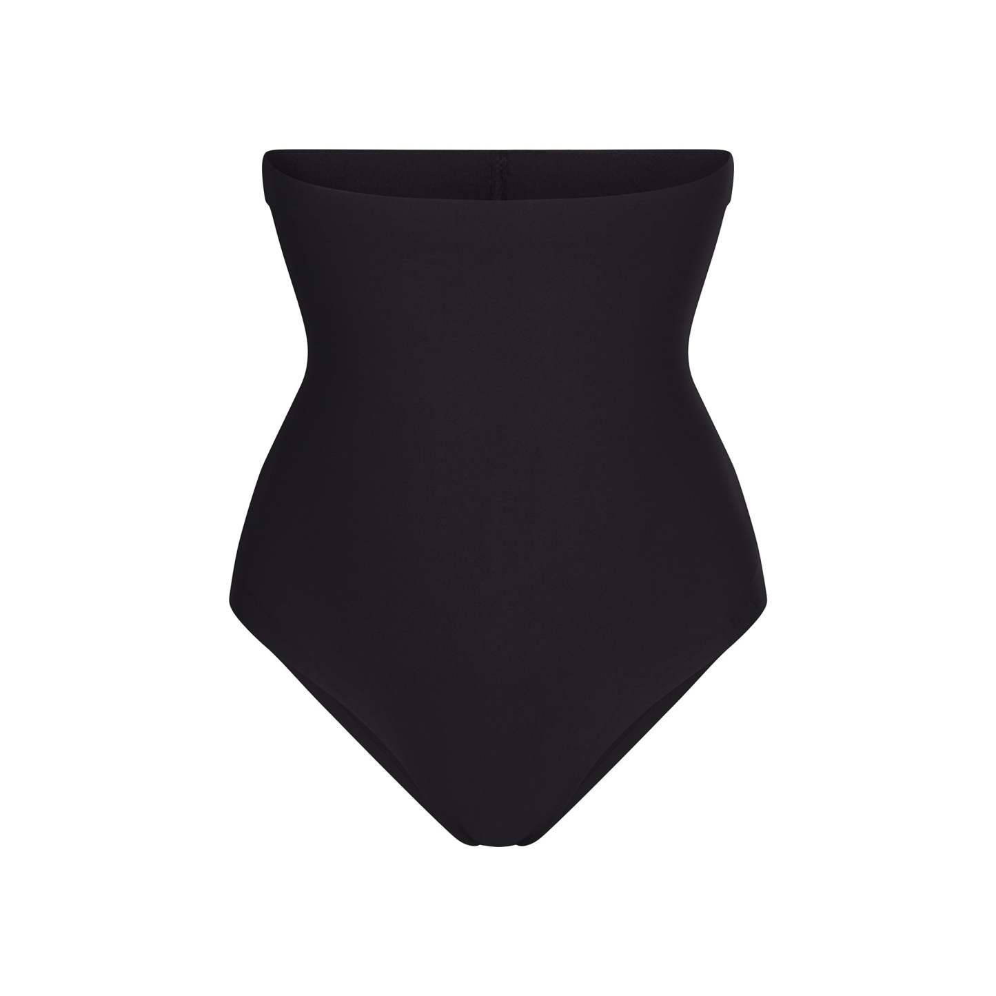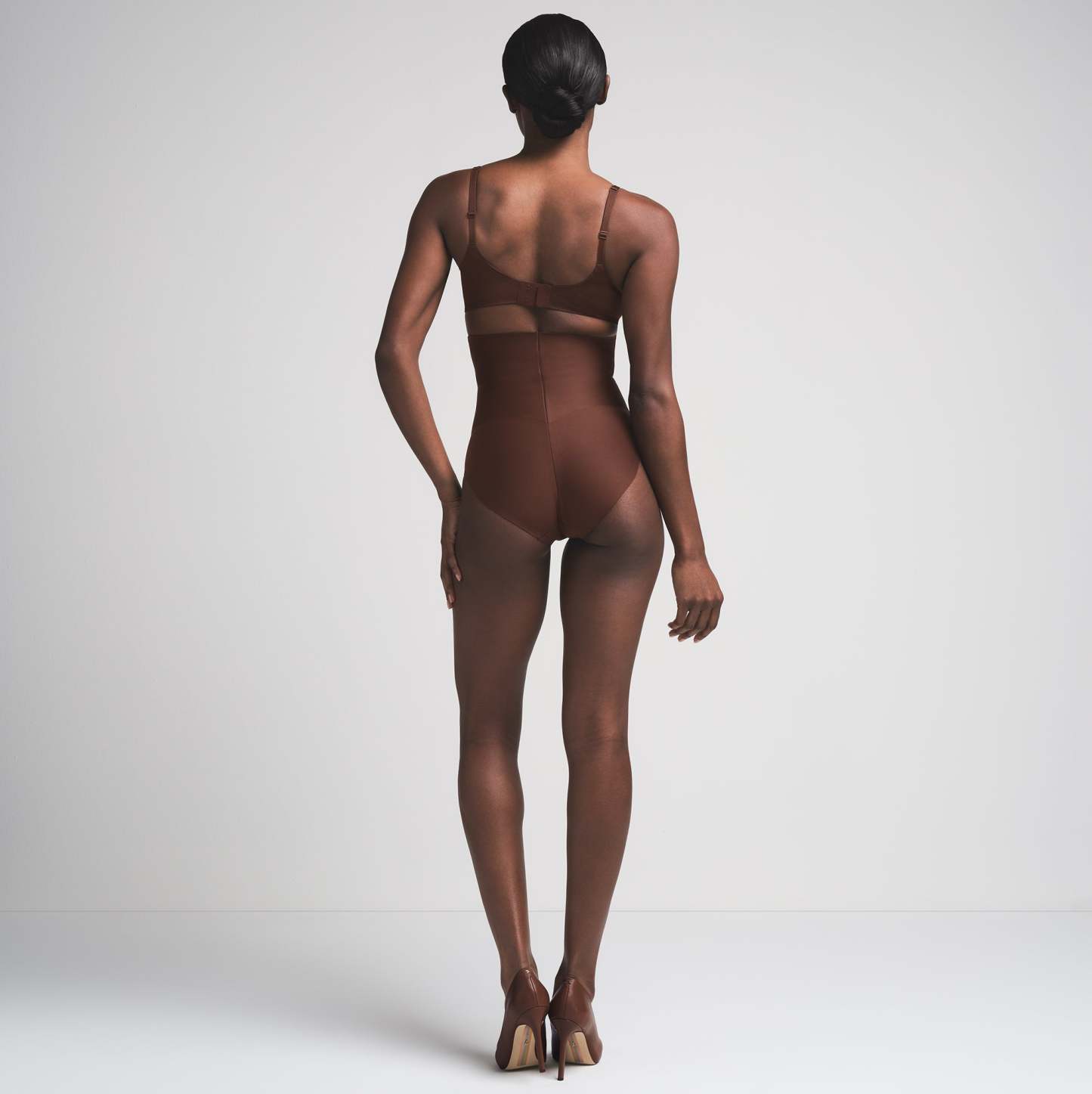 High-waisted, Bonded targeted core compression, Brief back coverage, Raw cut leg opening