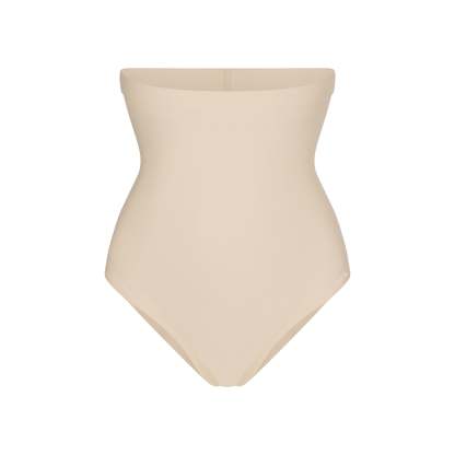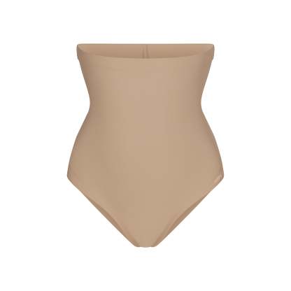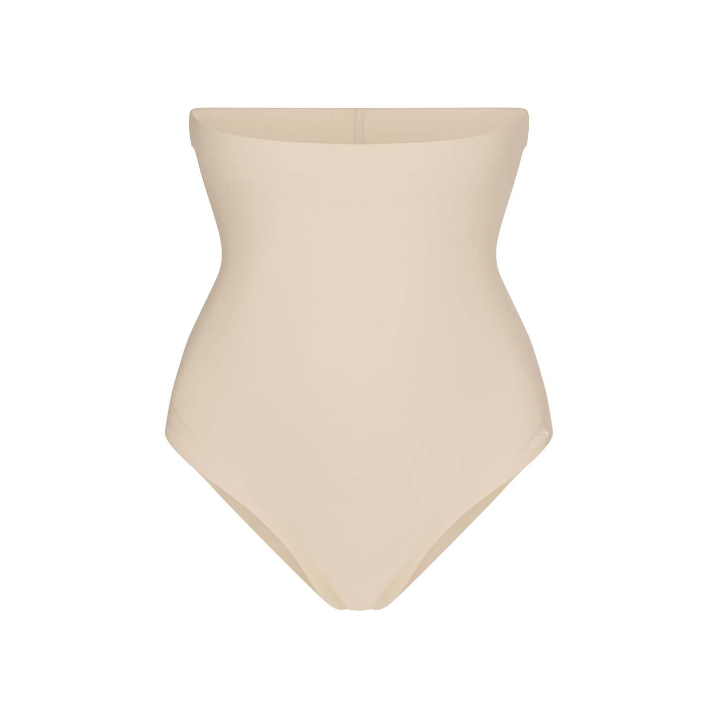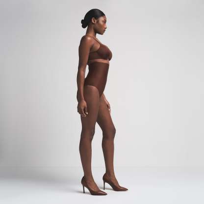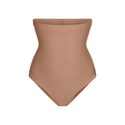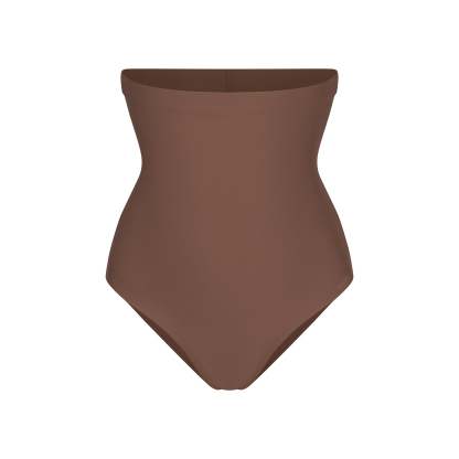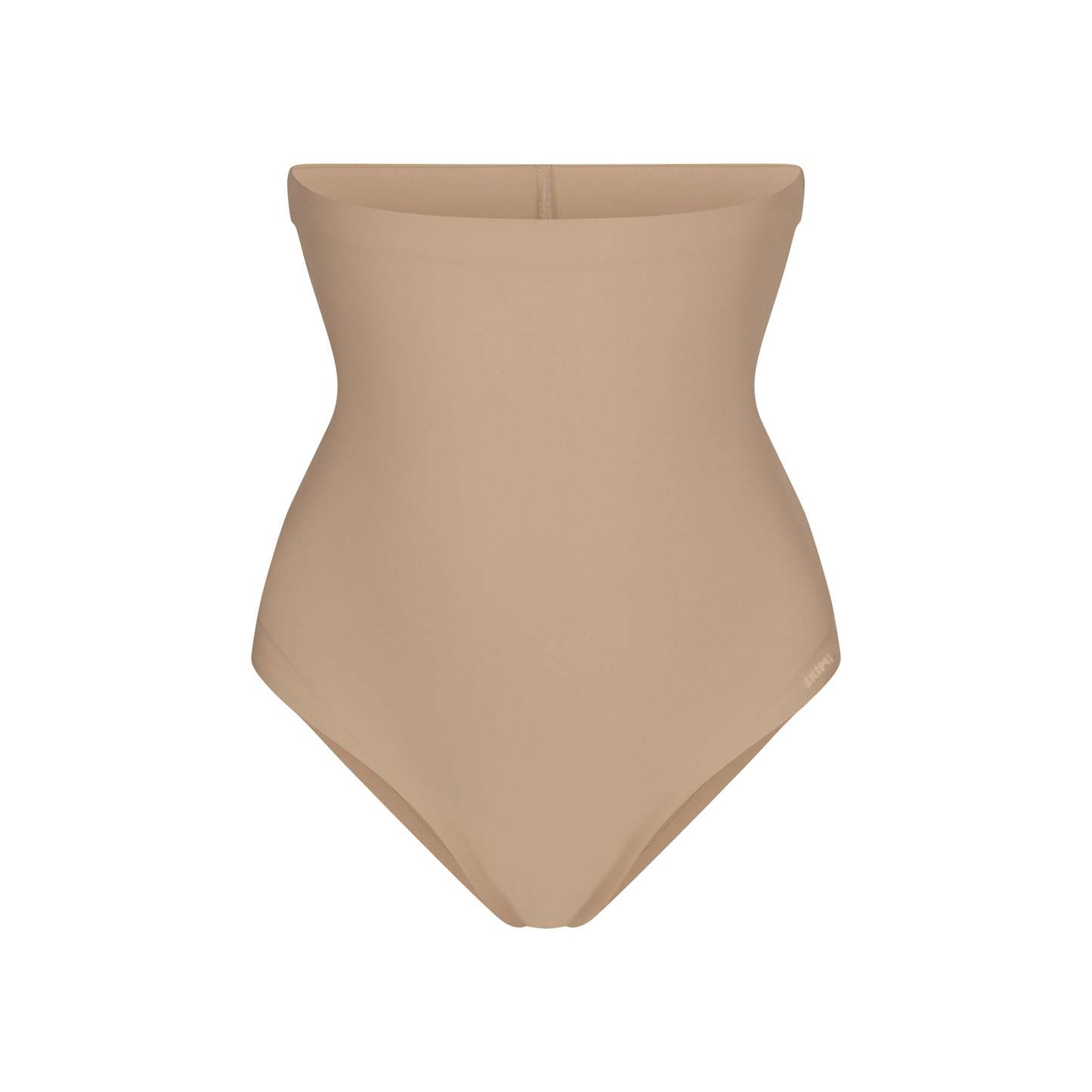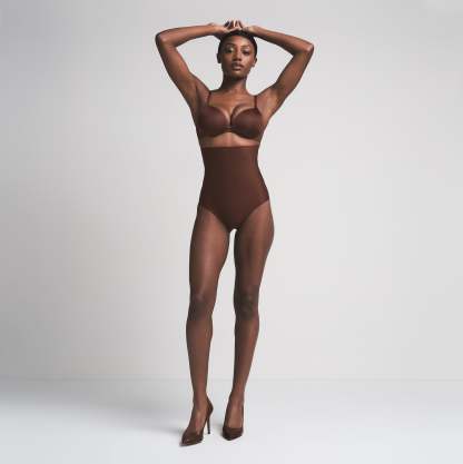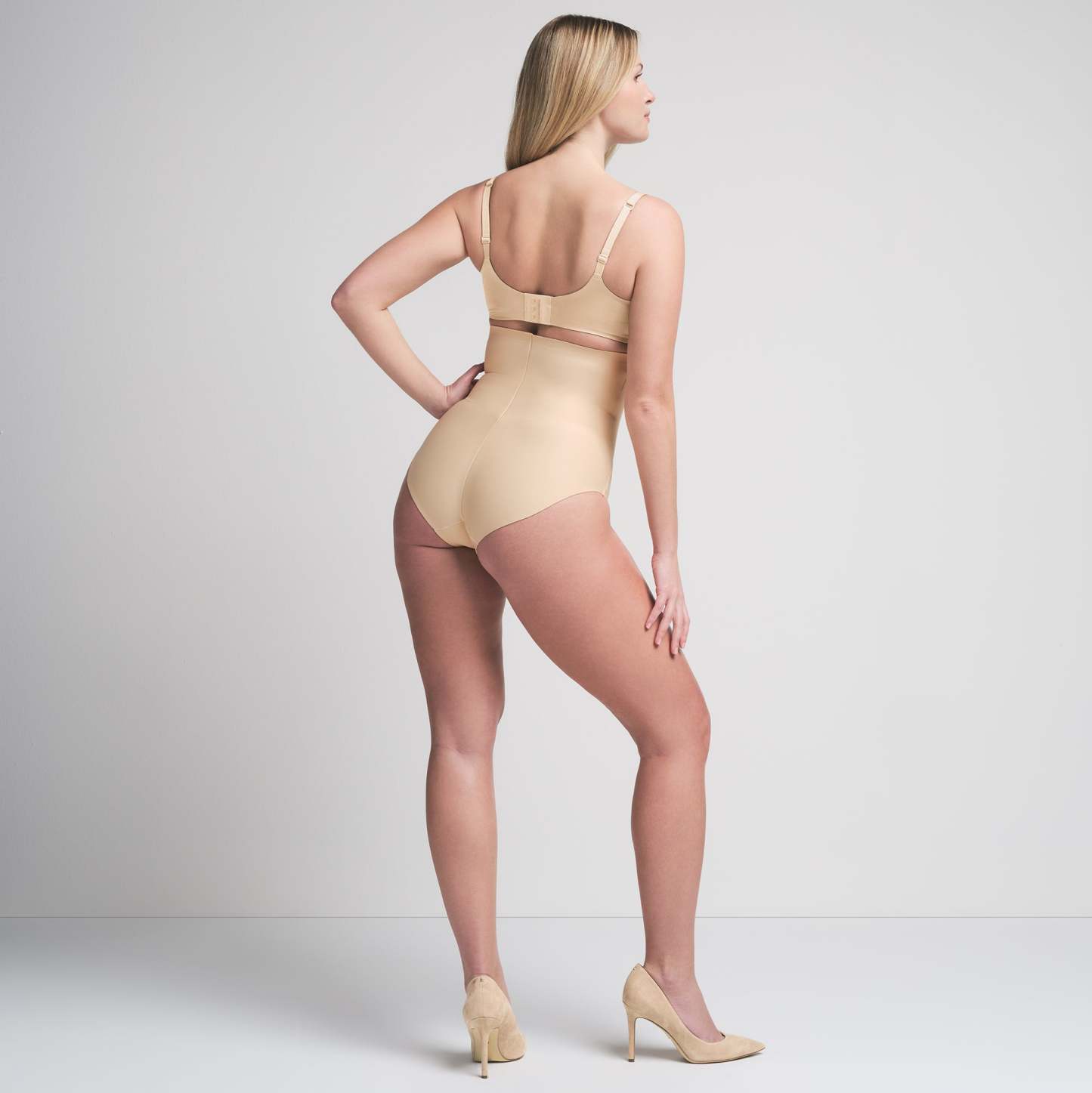 High-waisted, Bonded targeted core compression, Brief back coverage, Raw cut leg opening