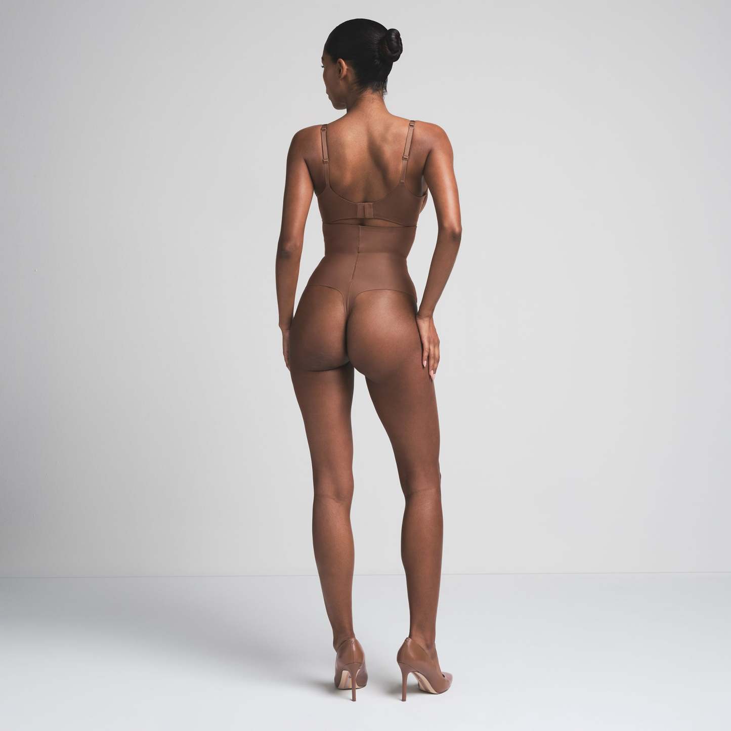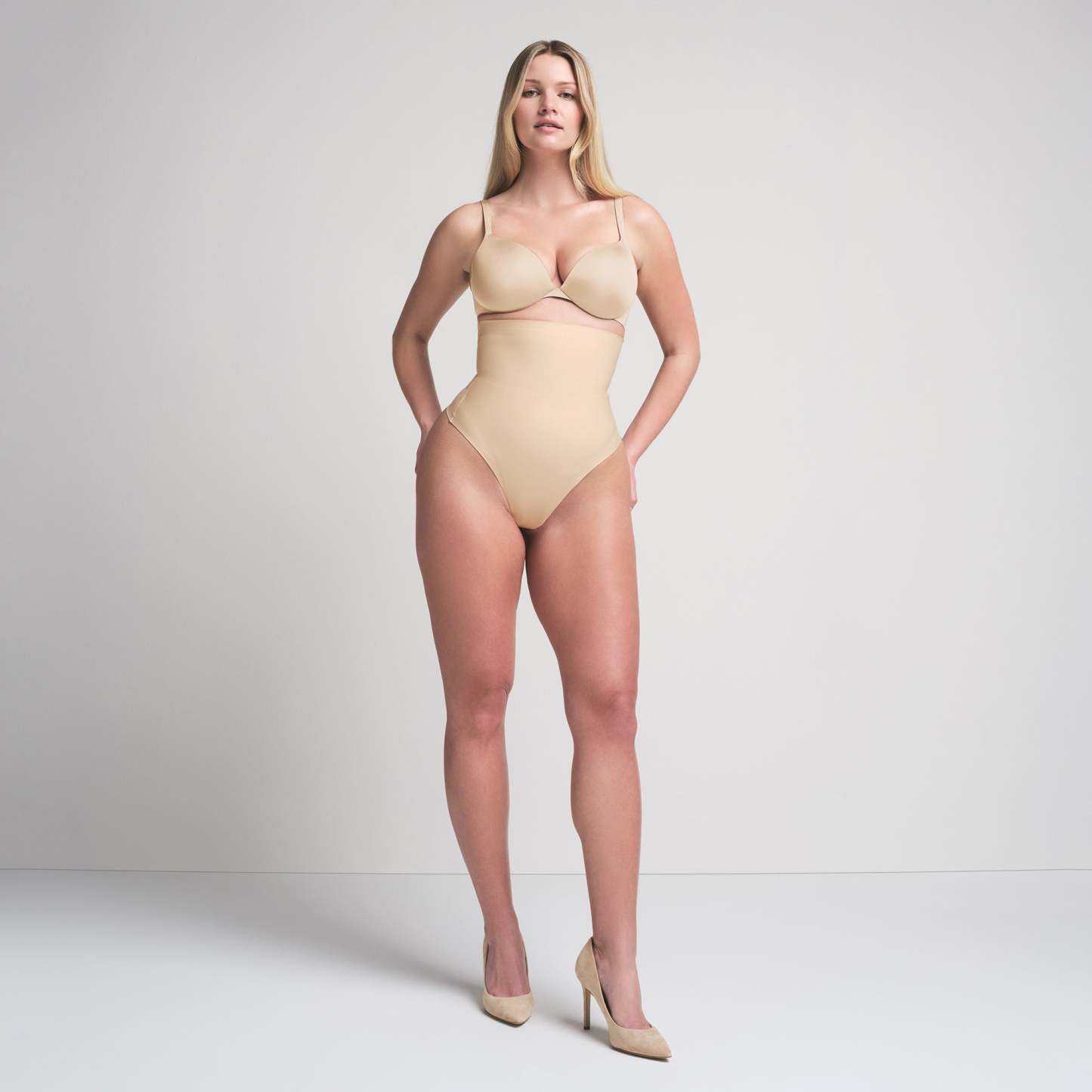 High-waisted, Bonded targeted core compression, Thong back coverage, Raw cut leg opening