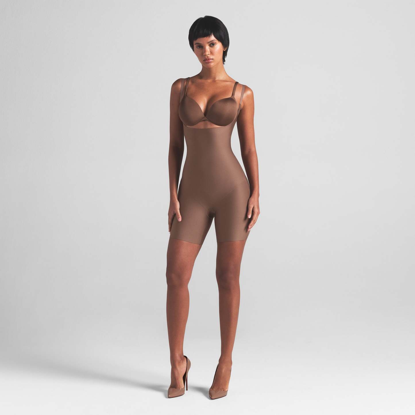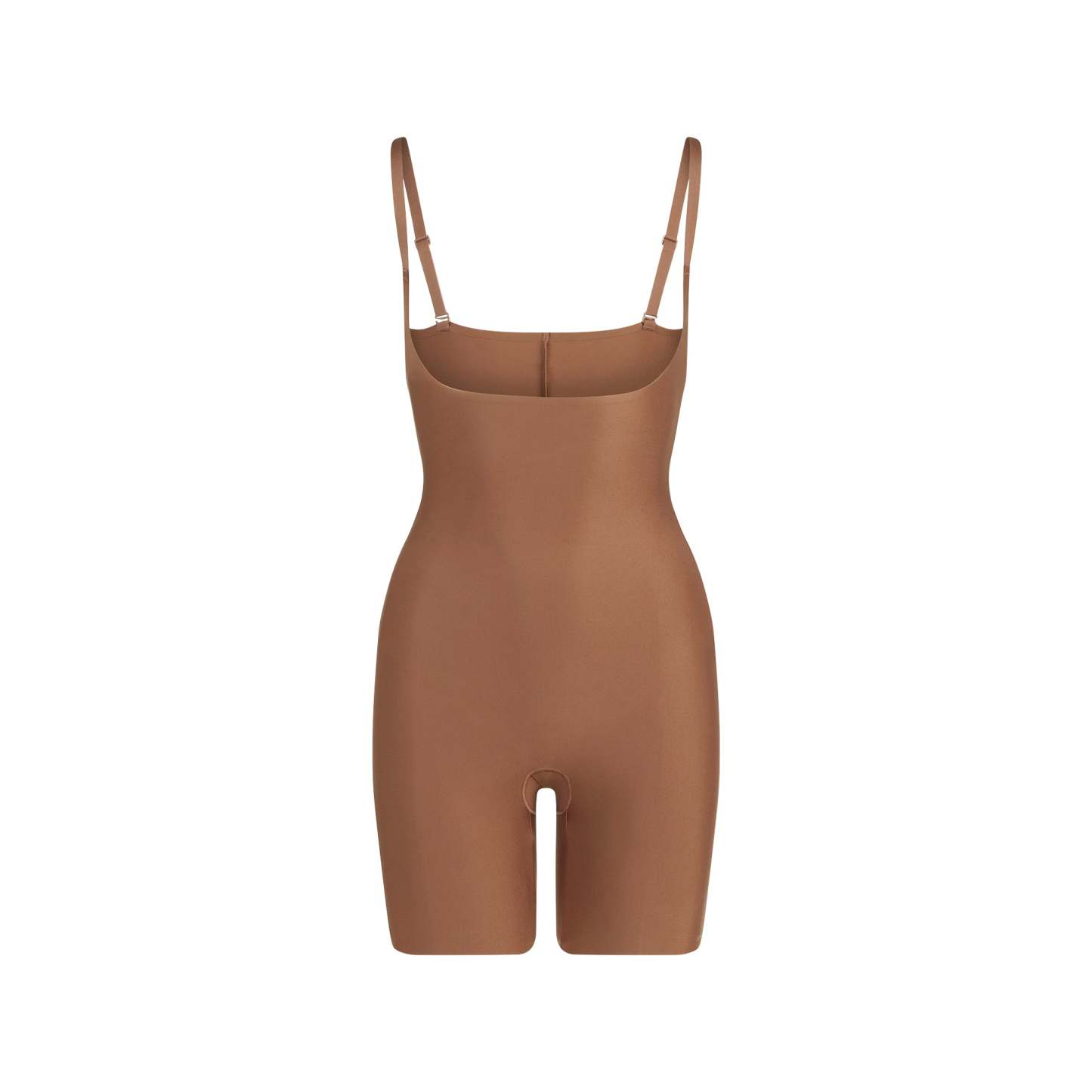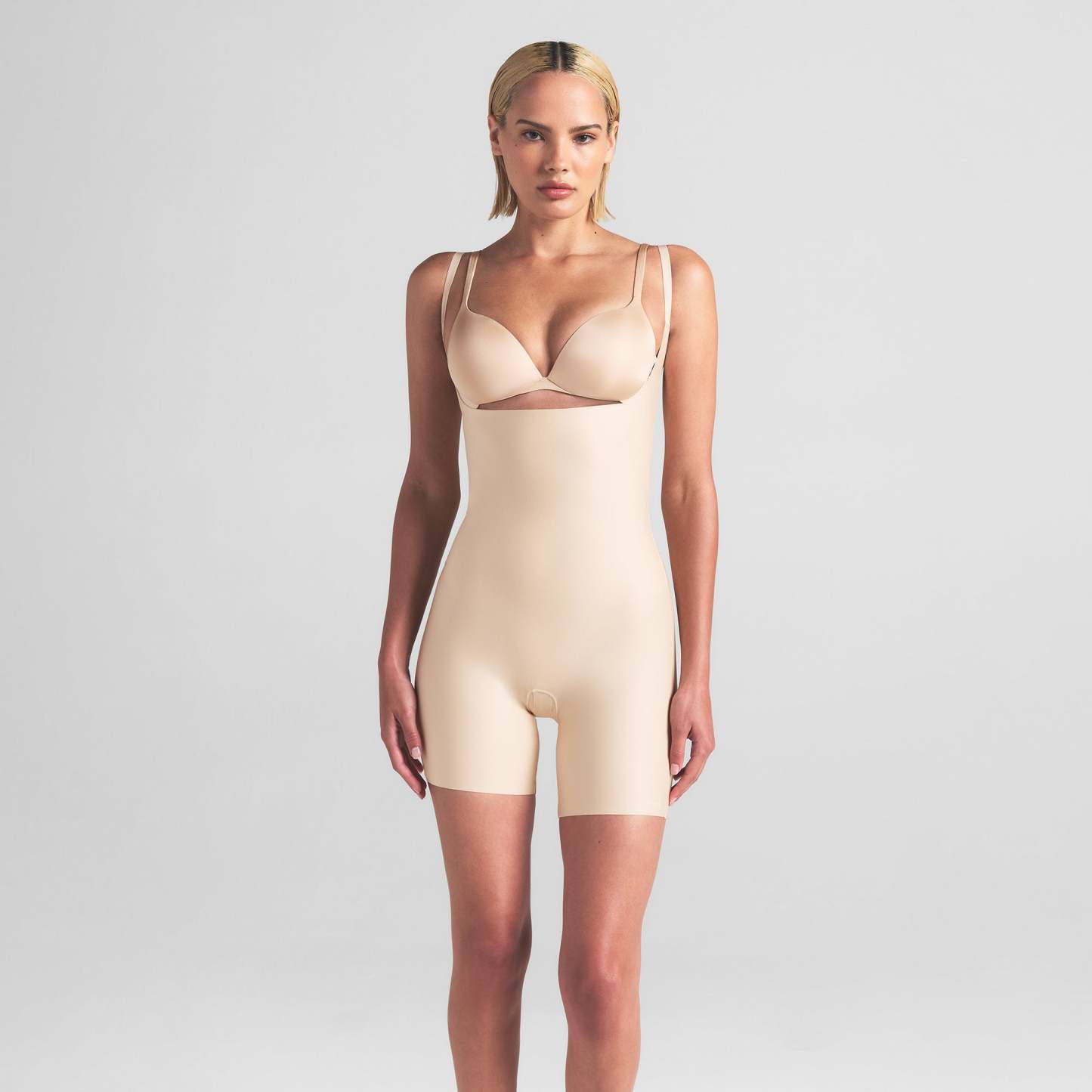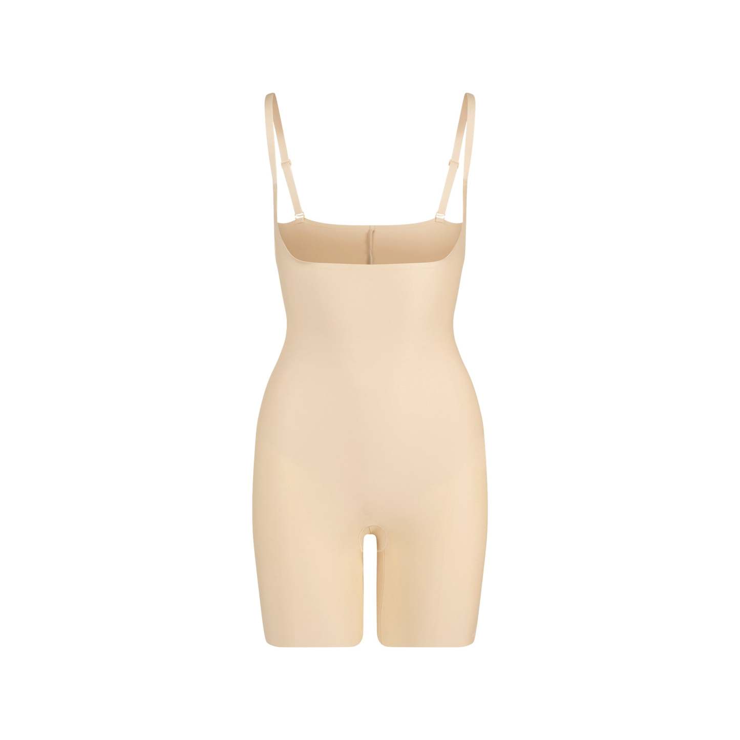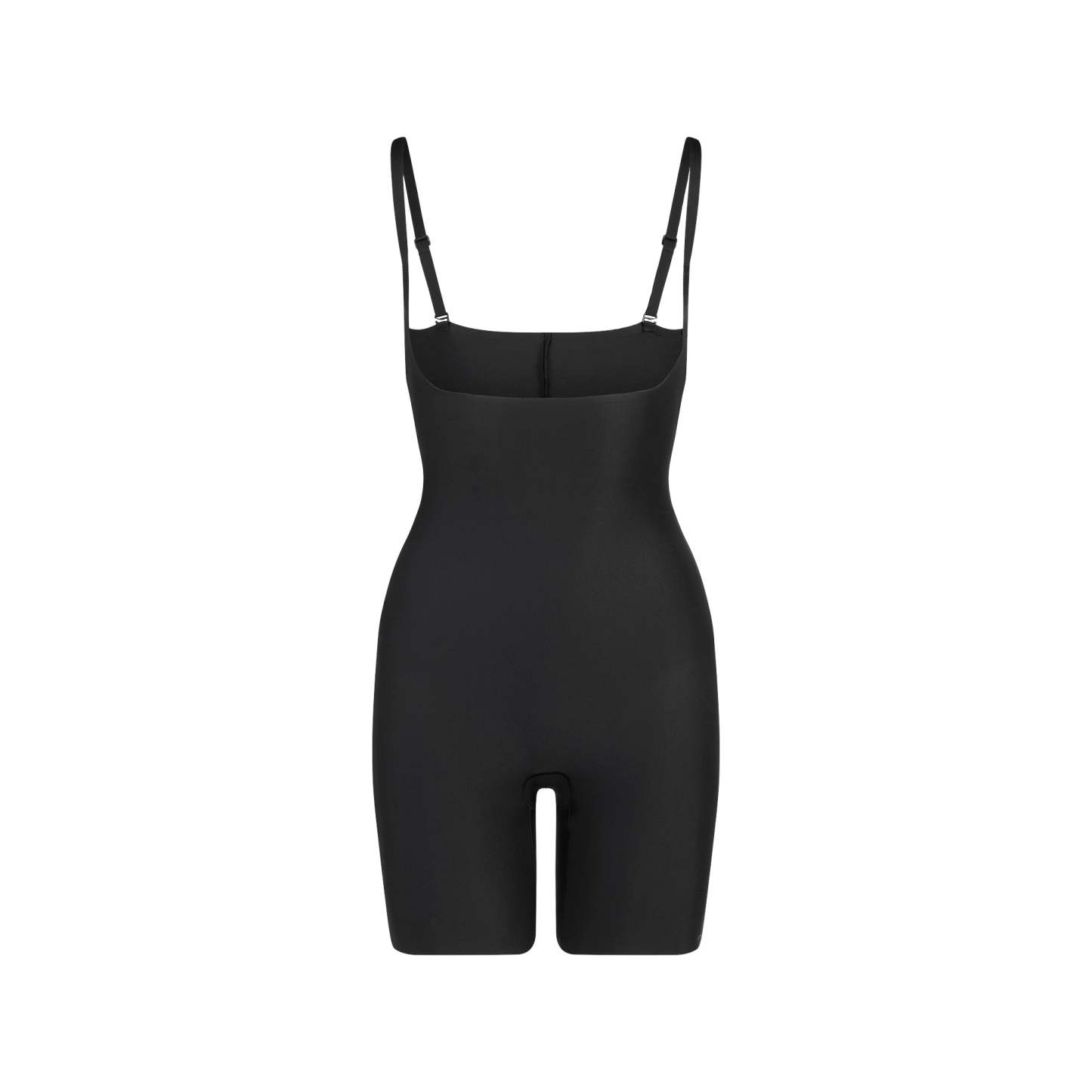Open bust neckline, Convertible, Adjustable straps, Open gusset, Mid-Thigh length, Raw cut leg opening, Bonded targeted core compression
