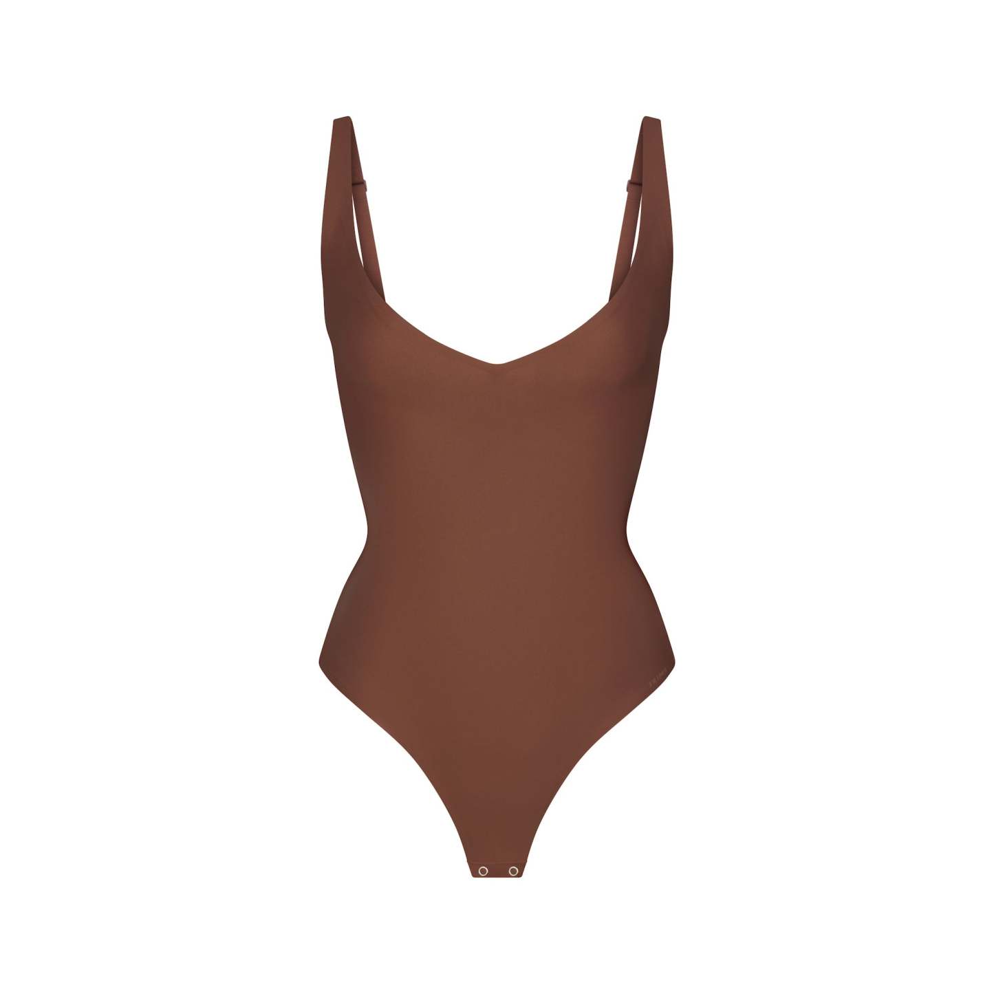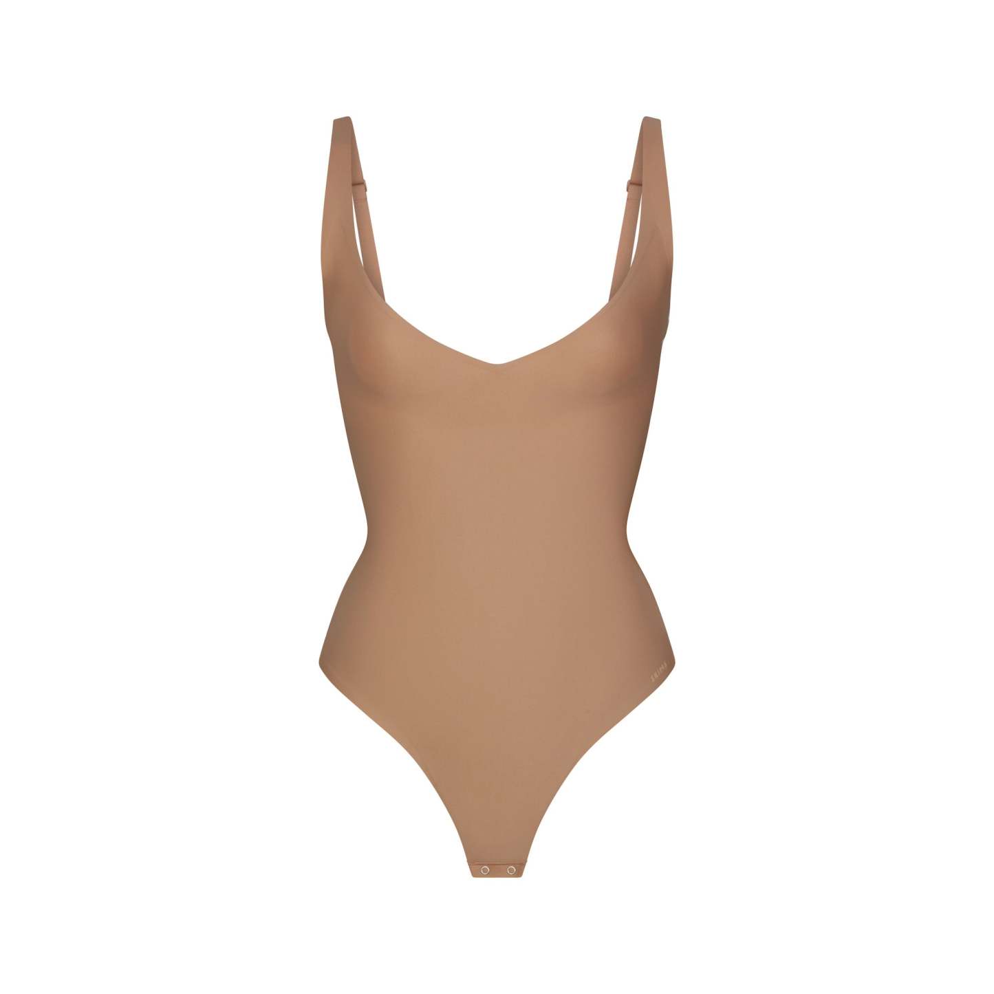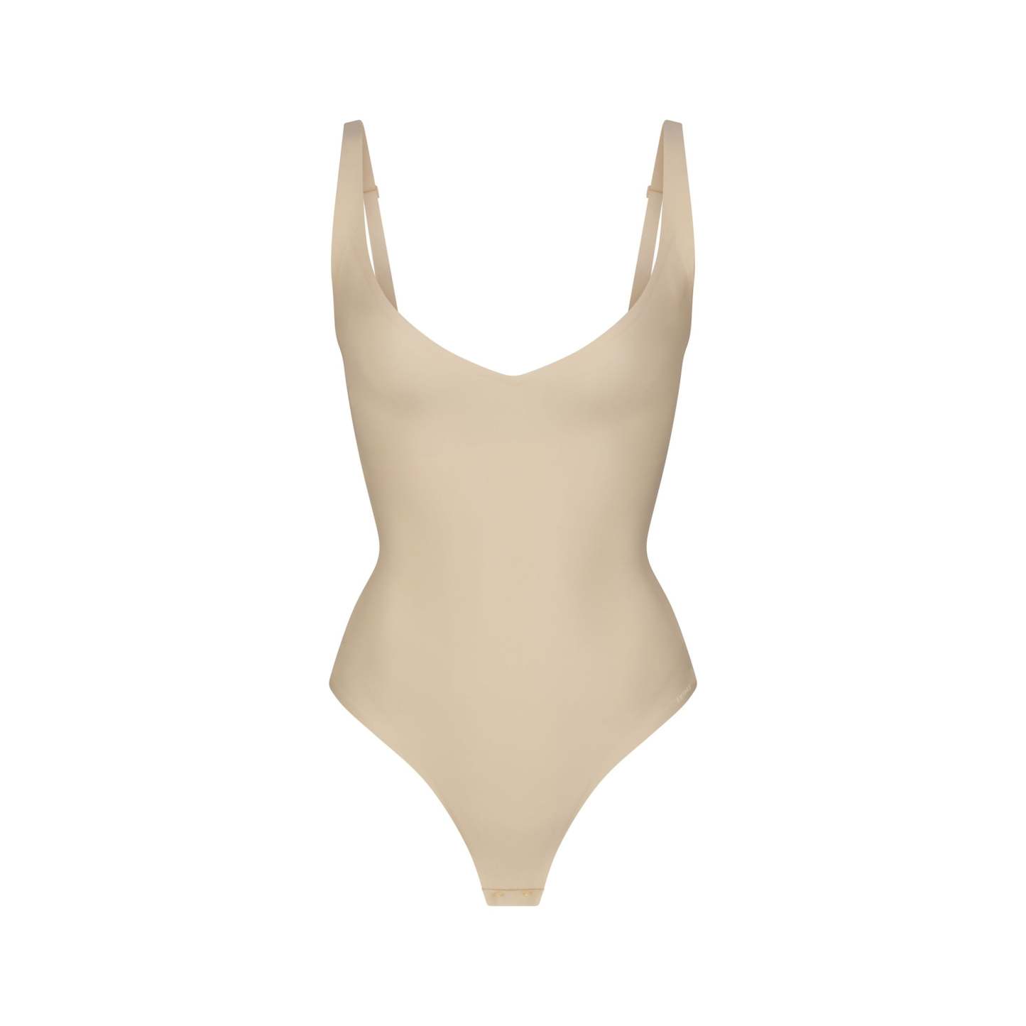 Plunge neckline, Unlined cups, Adjustable straps, Thong back, Gusset with snap, Targeted core compression