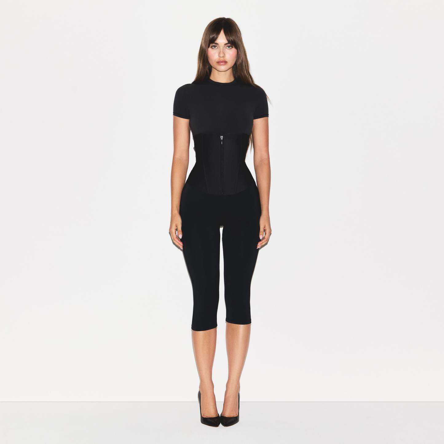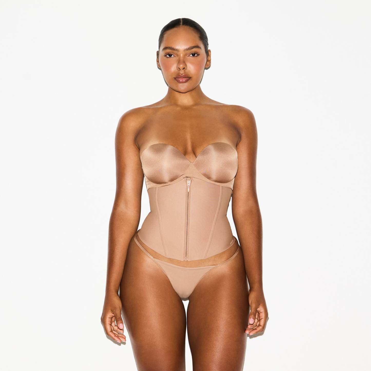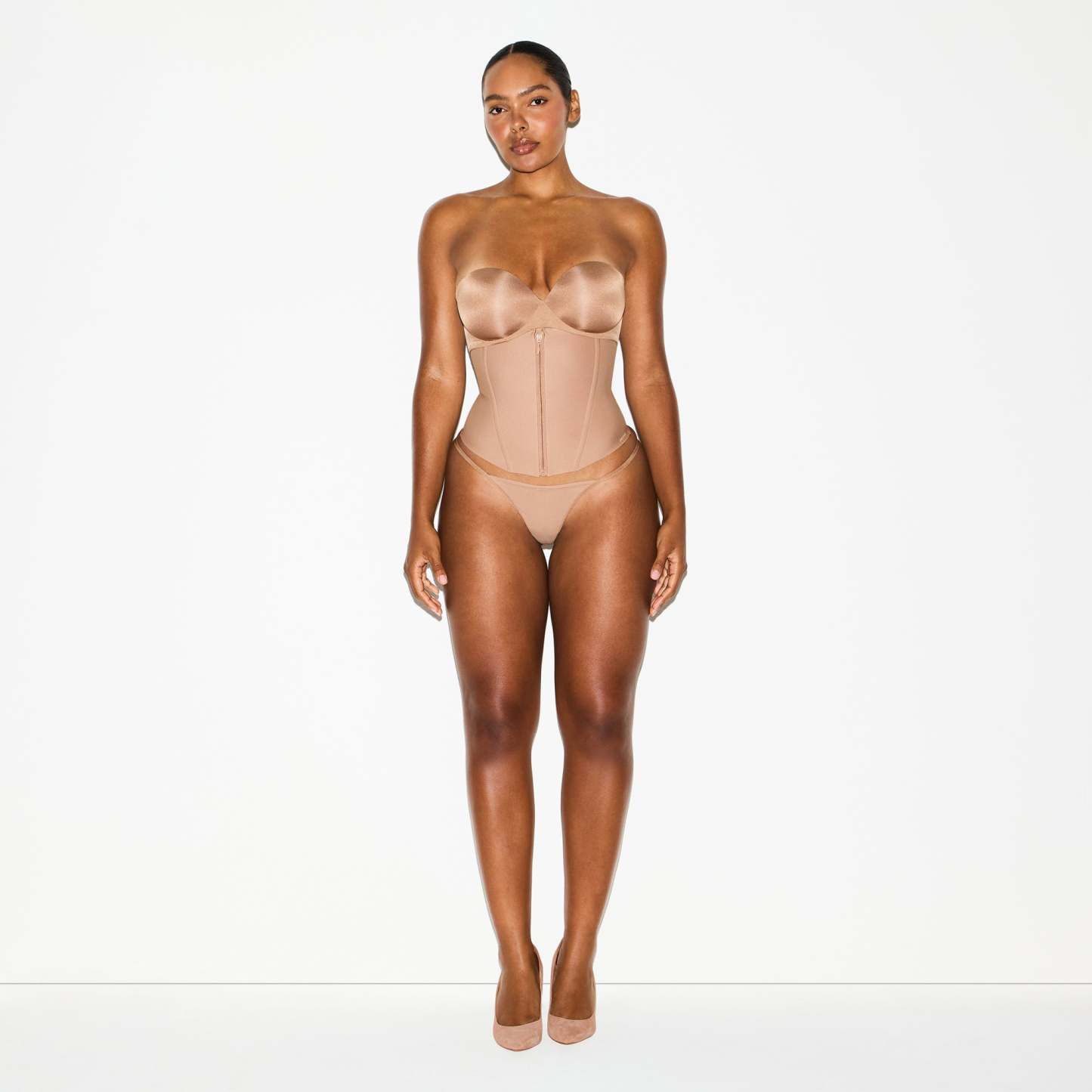 High-waisted, Adjustable removable straps, Invisible zipper at center front, Spiral steel boning at front and back, Logo at left hem,