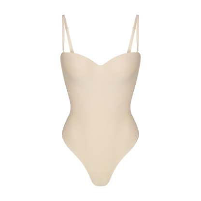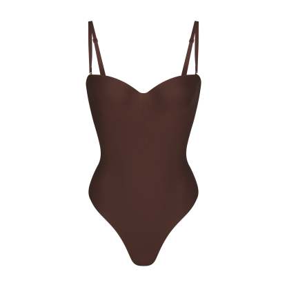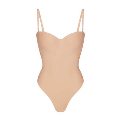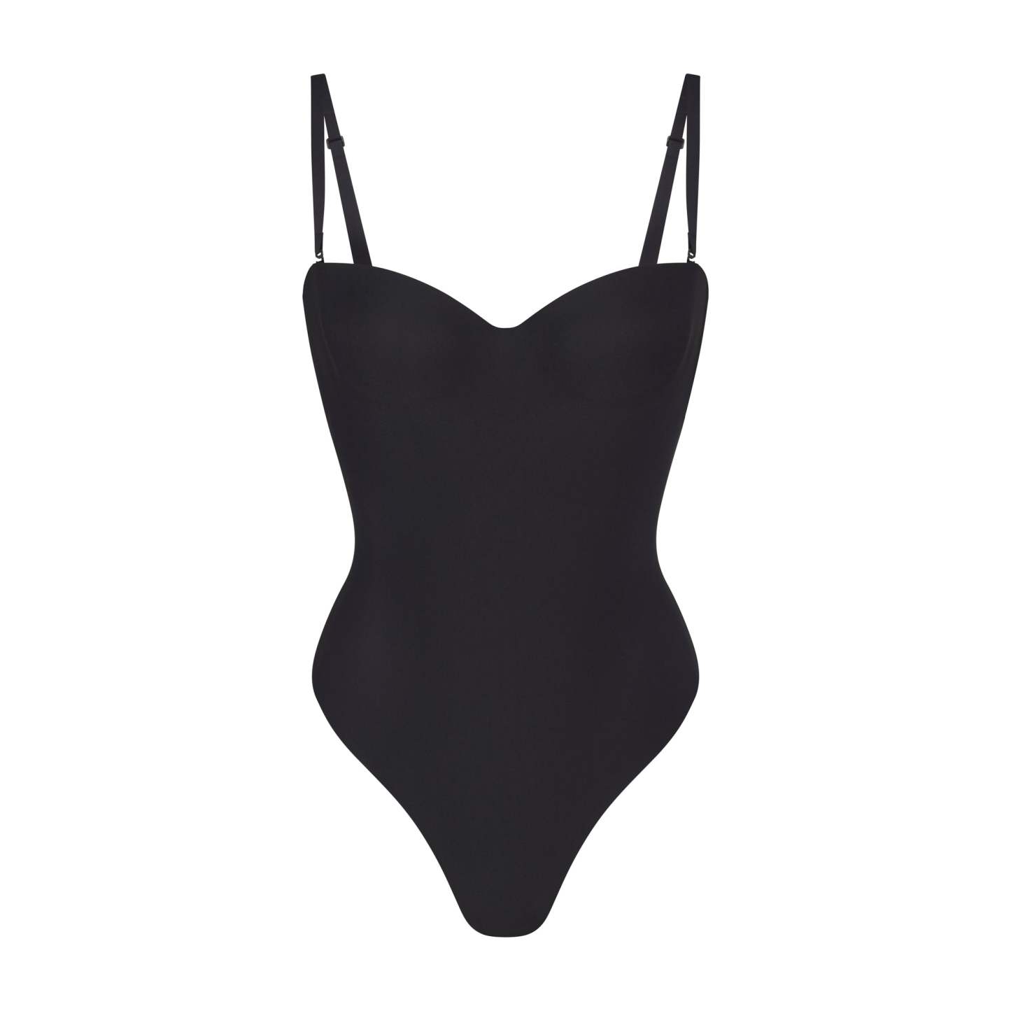 Molded lightly lined cups, Underwire for support, Removable straps with adjustability, Back keyhole detail with hook and eye closure, Thong back, Gusset with snap closure