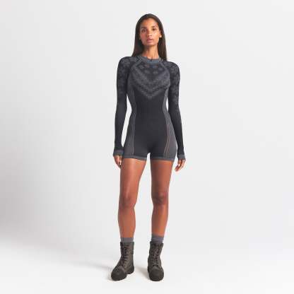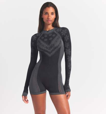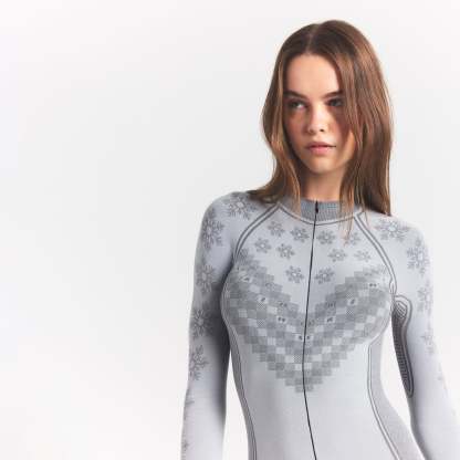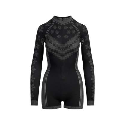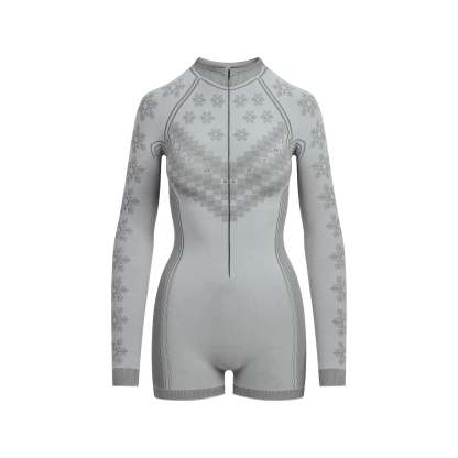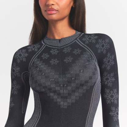 Warm up to a stylish foundation. In a classic fair isle print, this essential base layer is guaranteed to keep you cozy and dry, with style lines to flatter curves in all the right places. Features a sporty half zip, and a sleek, seamless construction with quick-drying and thermoregulating tech.