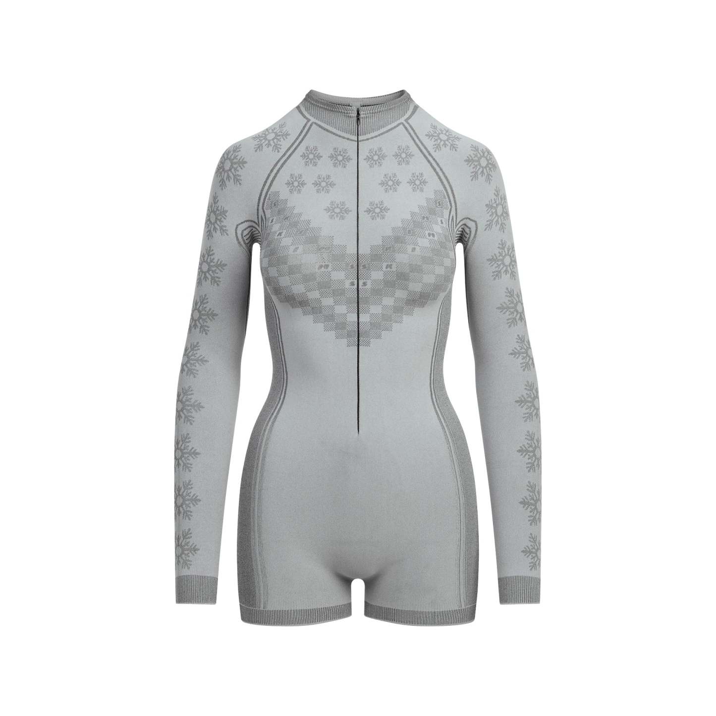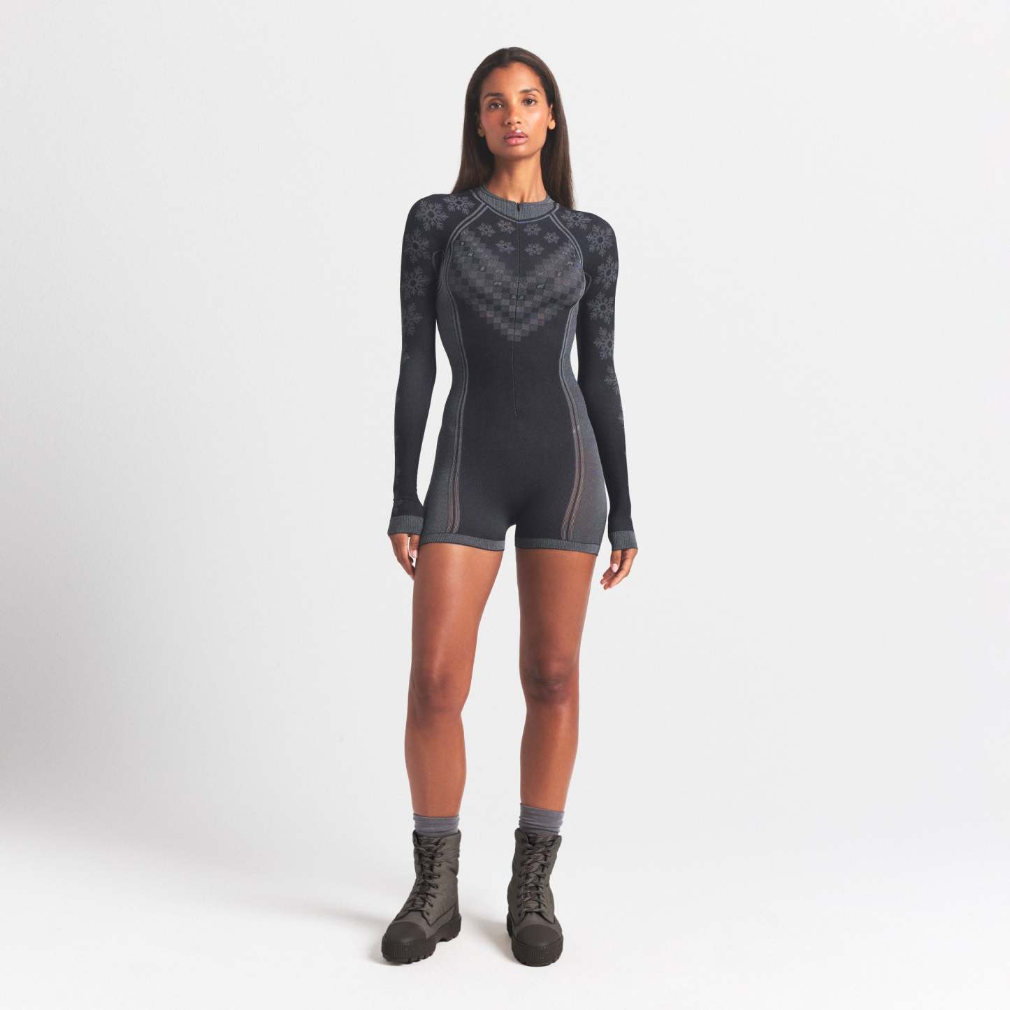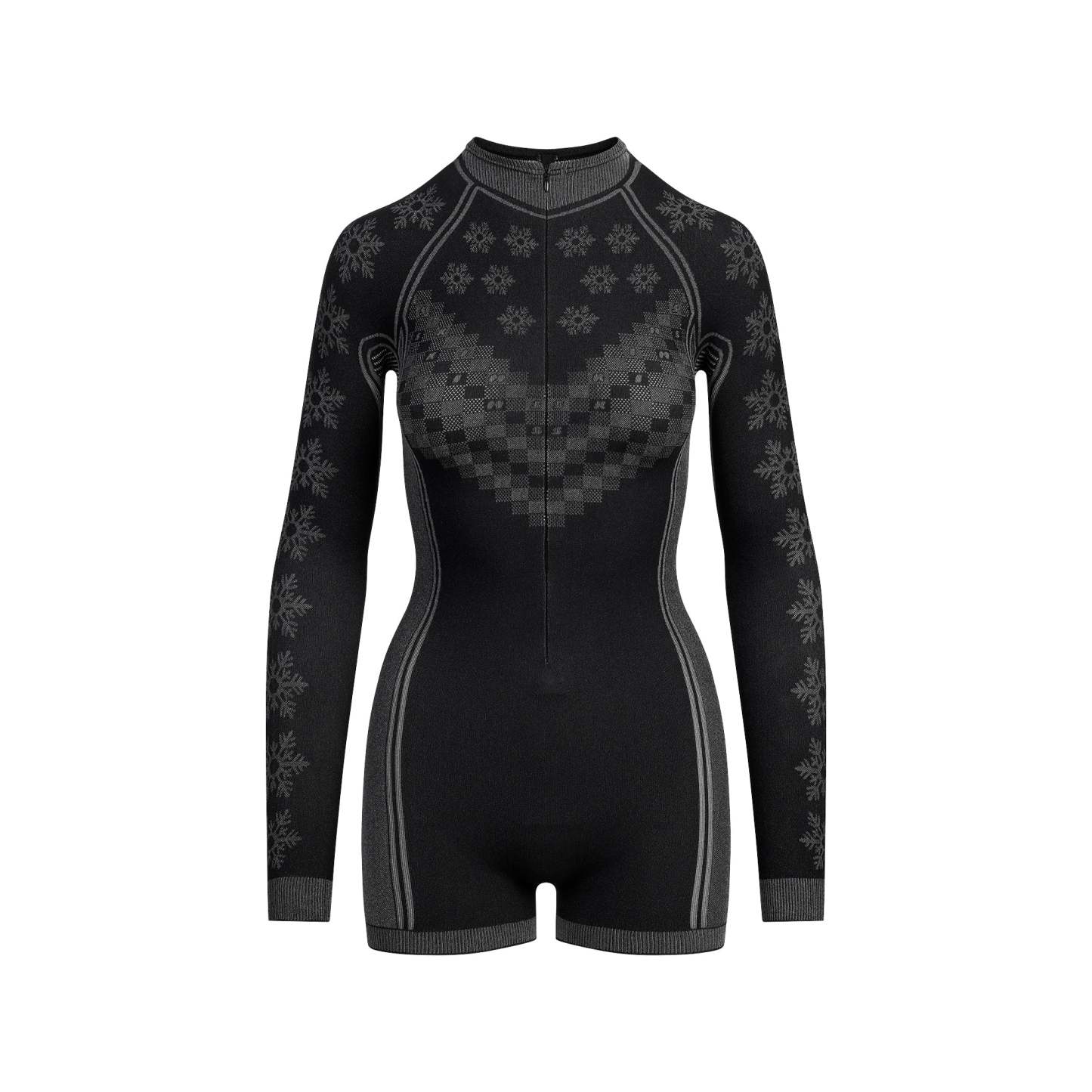 - Turtleneck, Zipper at center front, Contrast style lines enginerred to the body along front and back, Shortie length, Inseam: 2 1/4"