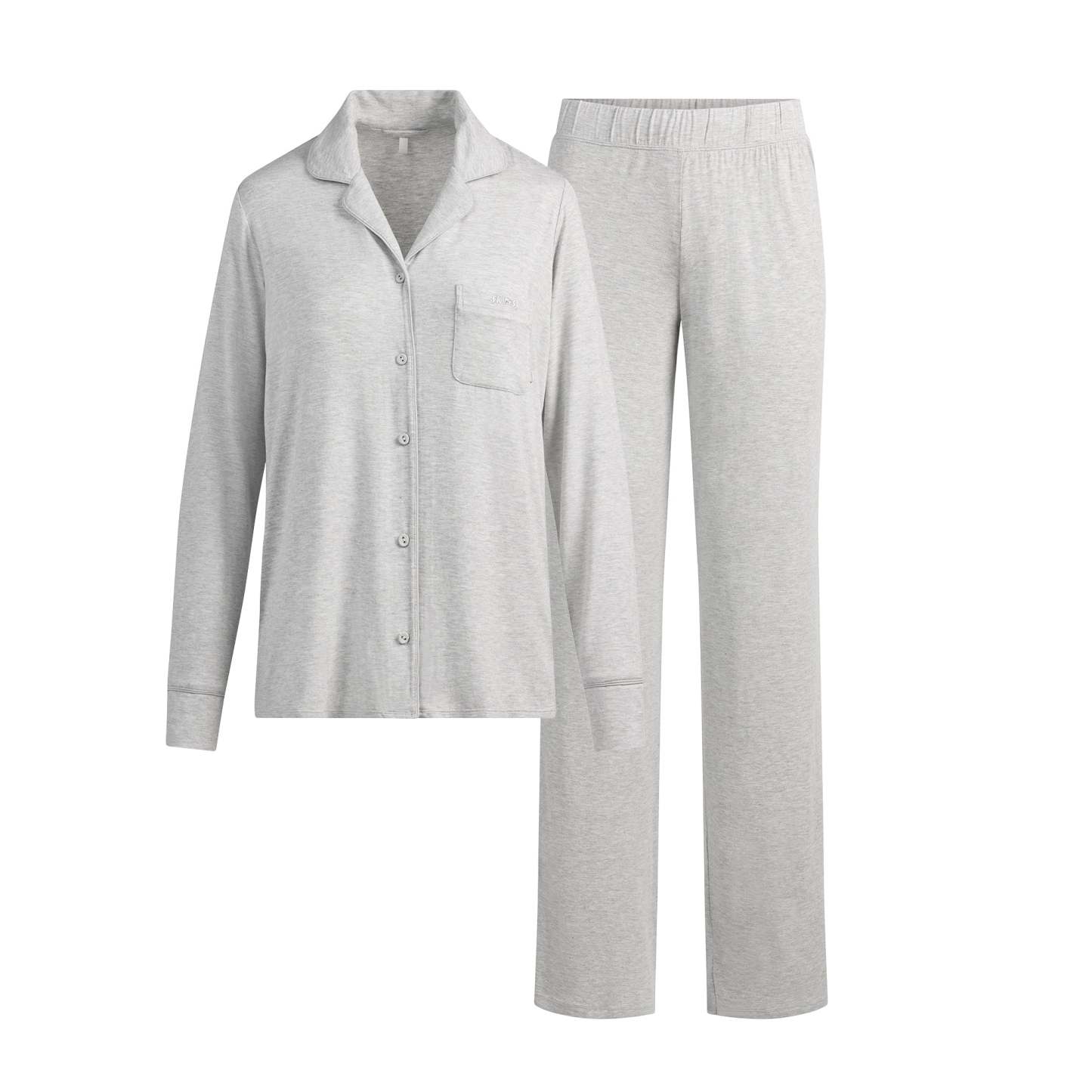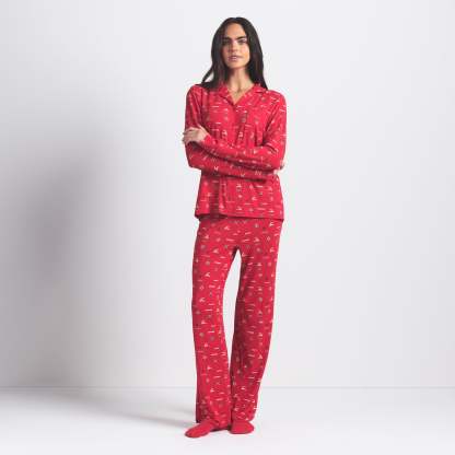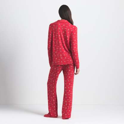 Your old pajamas can’t compete with this soft, ultra-comfortable sleep set. Features a slightly oversized button-up top with long sleeves, a chest pocket, and piping details. The straight leg pants have a relaxed fit and a stretchy waistband with an adjustable interior drawstring. Fits true to size.