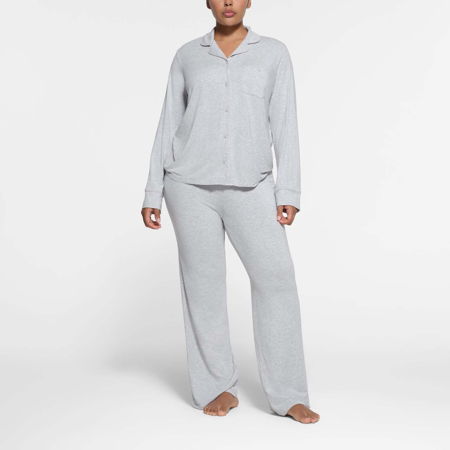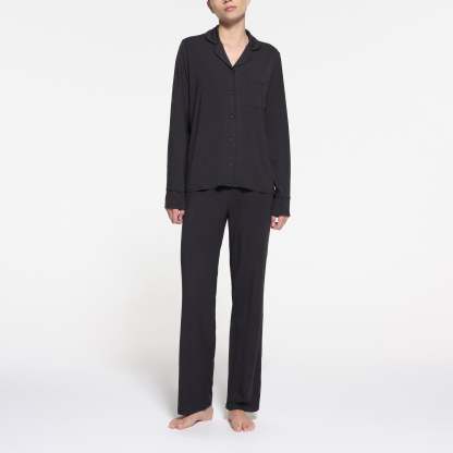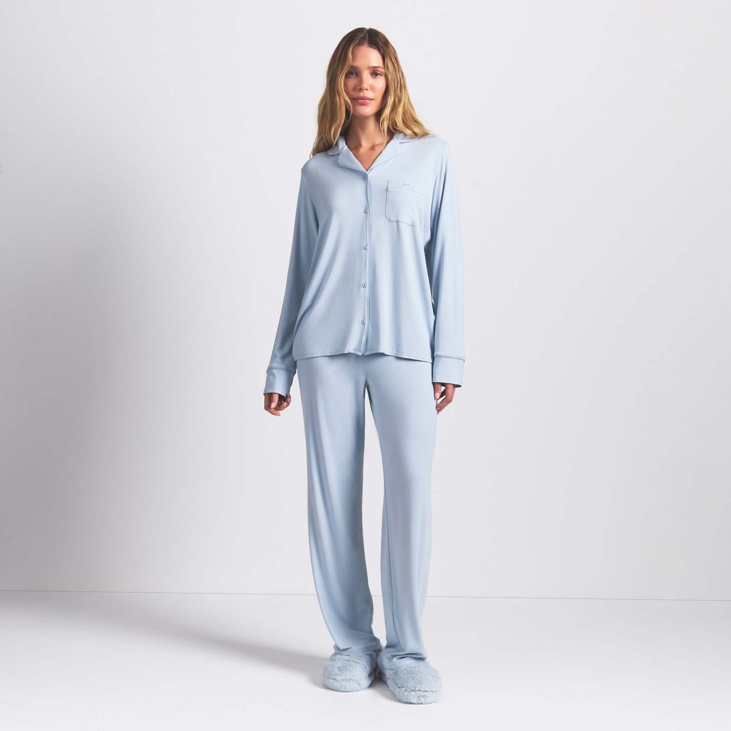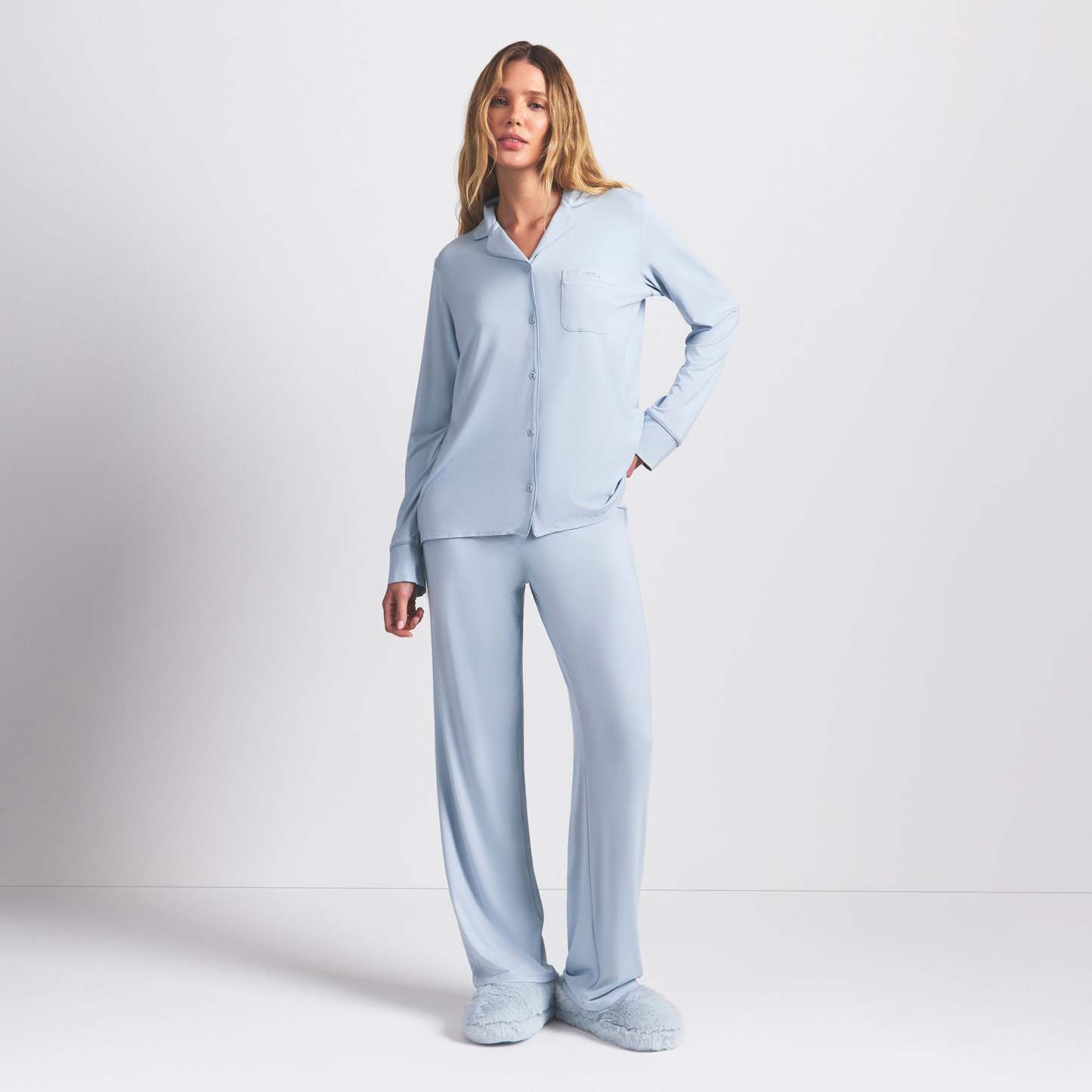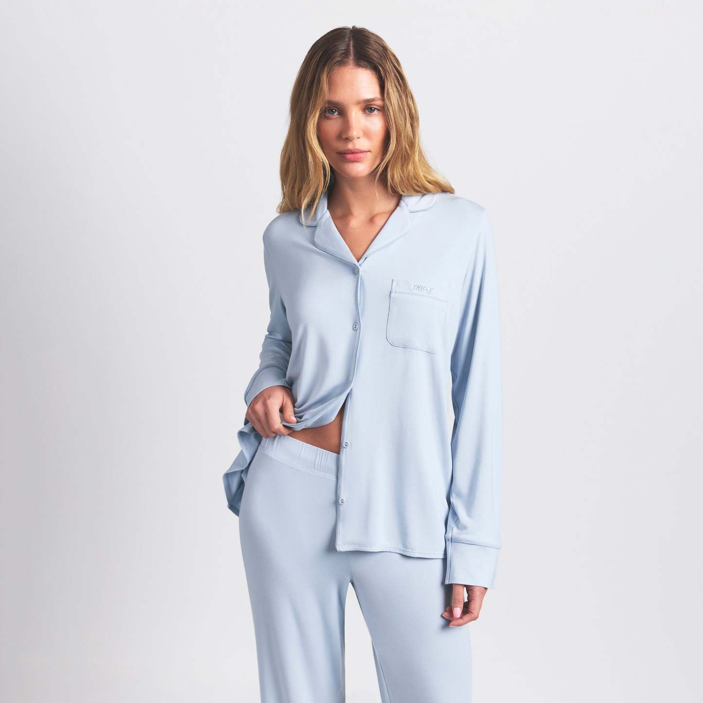 - Sleep top: Classic long sleeve sleepwear top, Center front button up closure, Chest patch pocket, Tonal piping details, Fits oversize throughout the body, Sleep Pant: Relaxed, straight leg silhouette, Stretchy waistband with interior drawcord for adjustable fit
