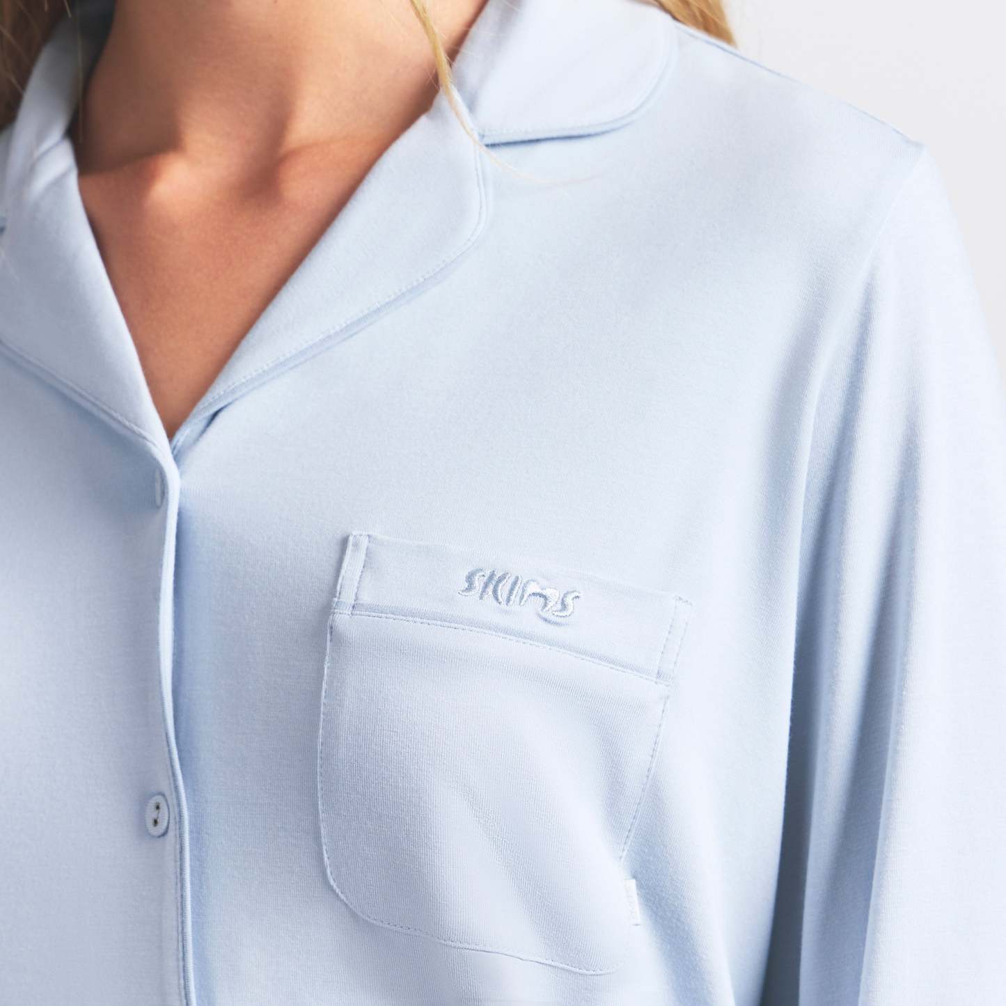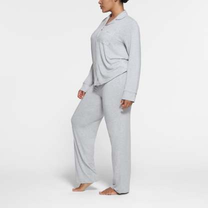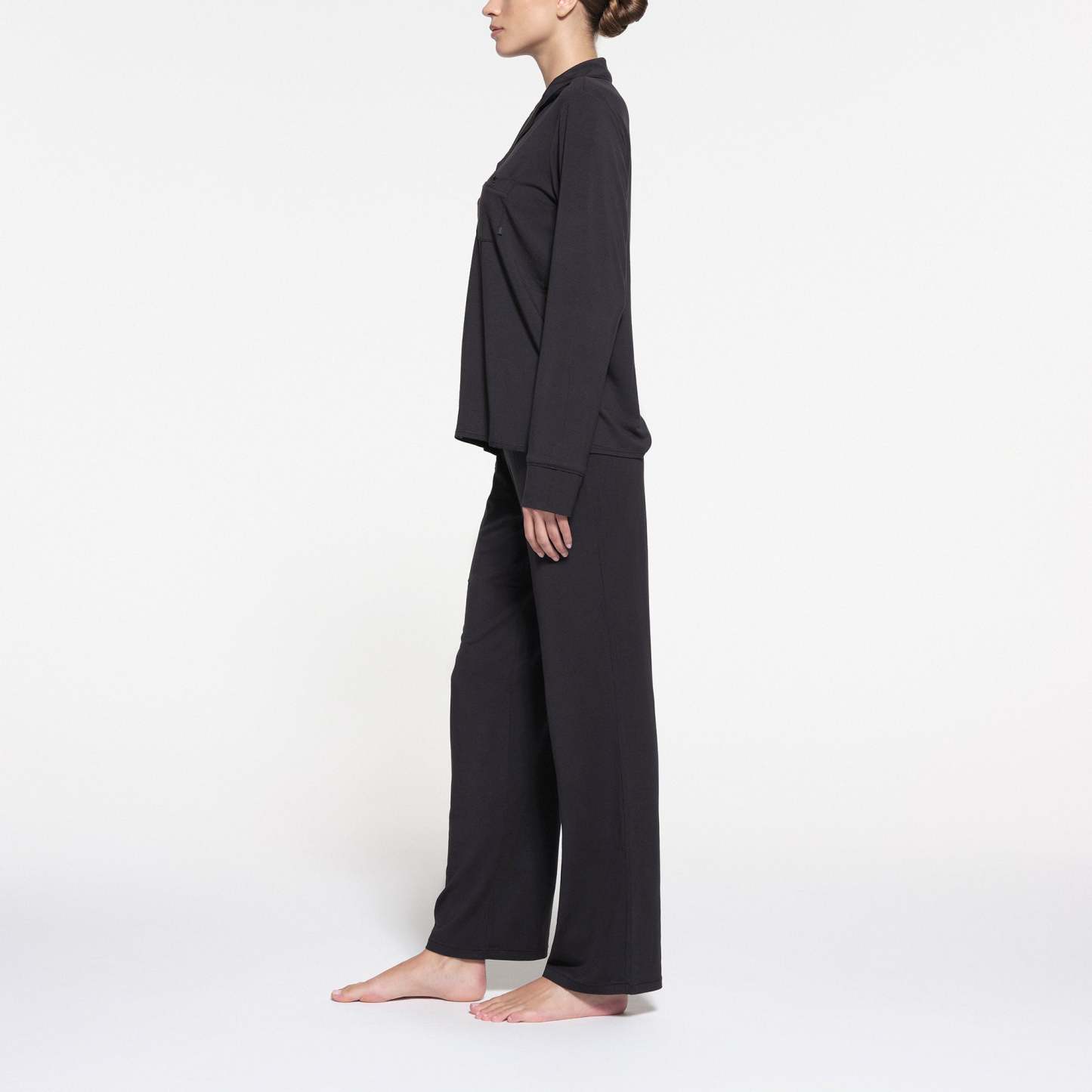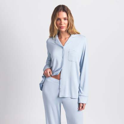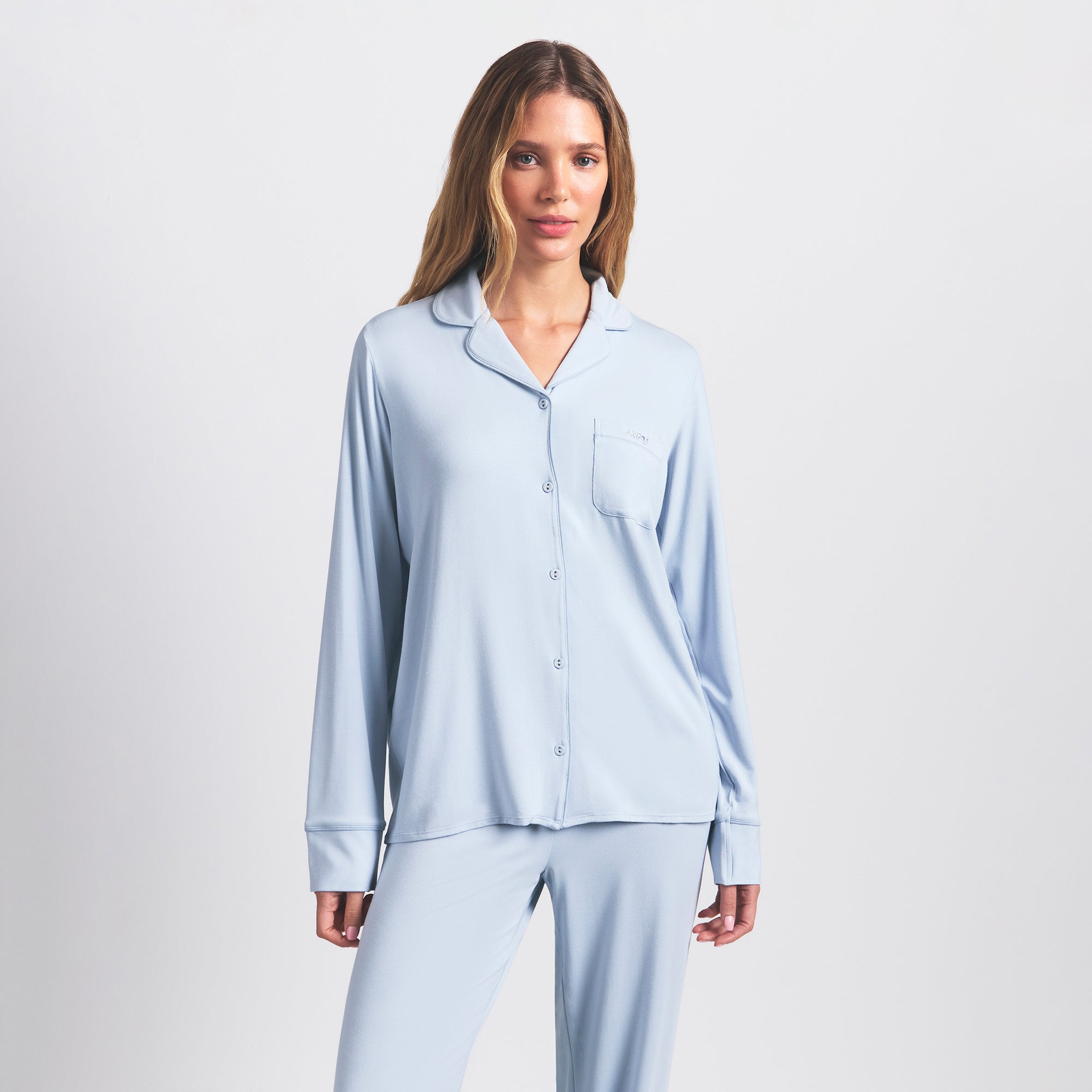 - Sleep top: Classic long sleeve sleepwear top, Center front button up closure, Chest patch pocket, Tonal piping details, Fits oversize throughout the body, Sleep Pant: Relaxed, straight leg silhouette, Stretchy waistband with interior drawcord for adjustable fit