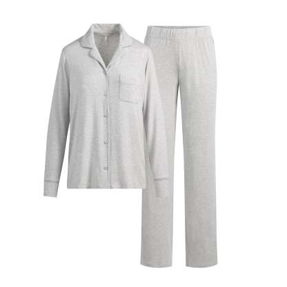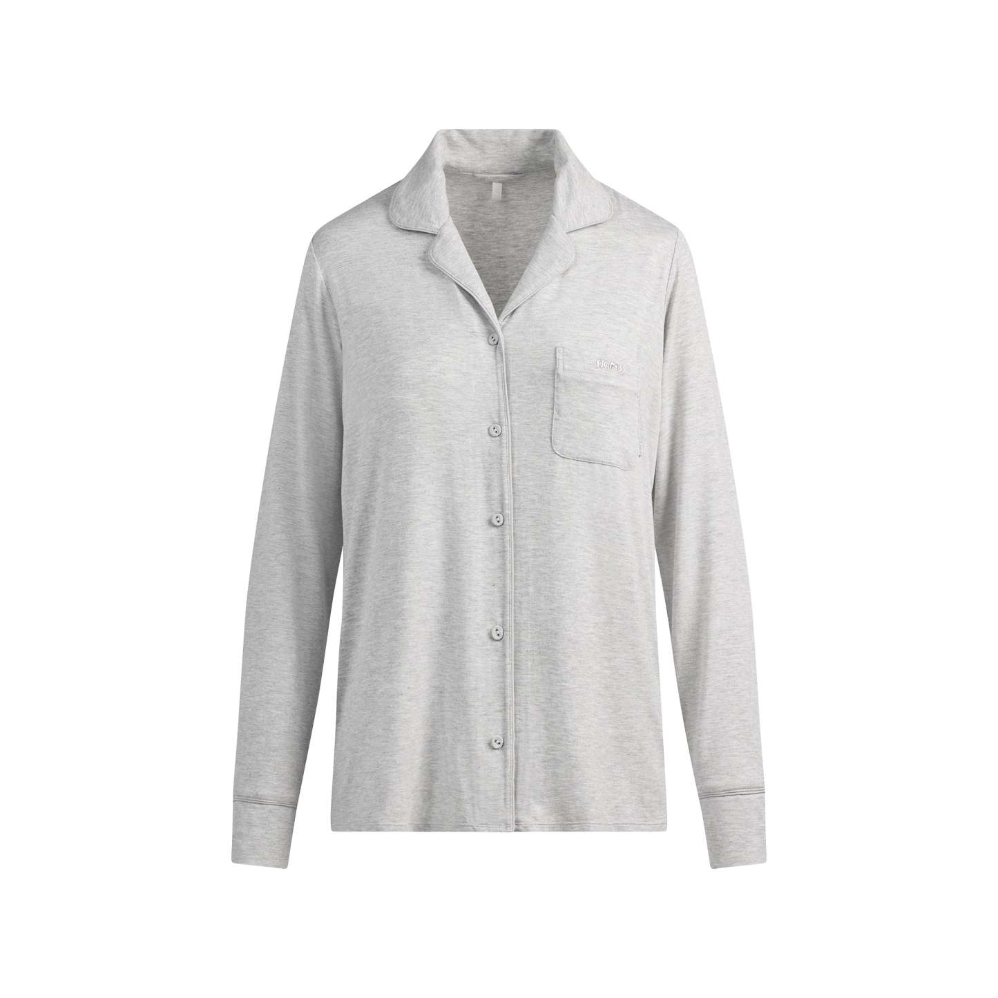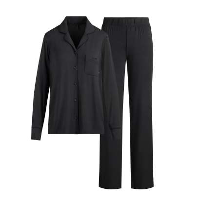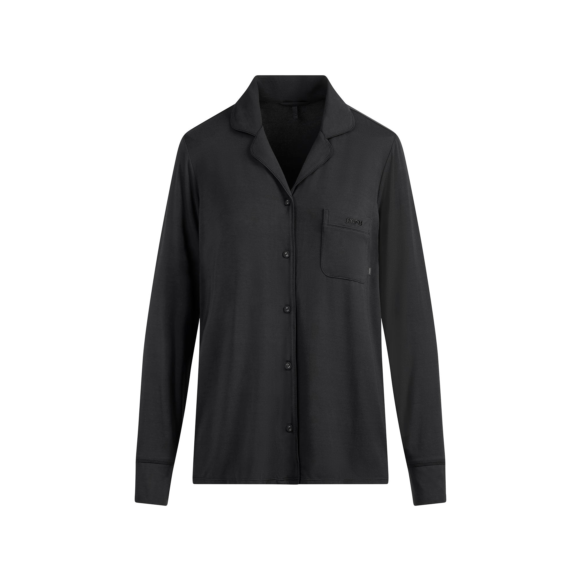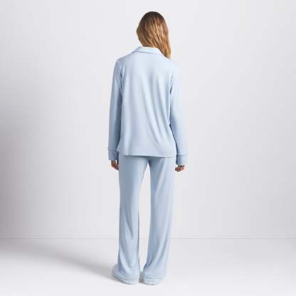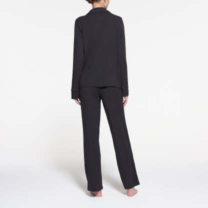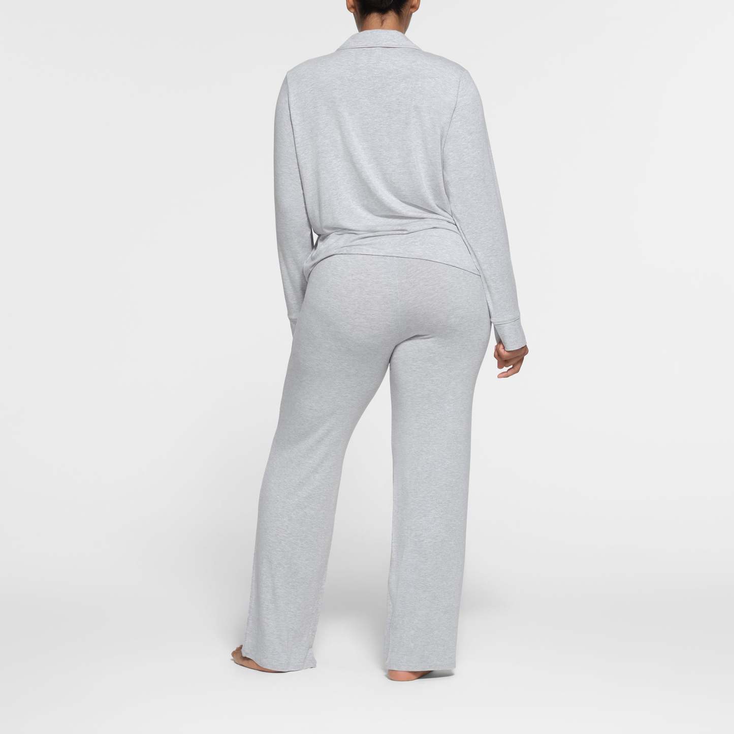 - Sleep top: Classic long sleeve sleepwear top, Center front button up closure, Chest patch pocket, Tonal piping details, Fits oversize throughout the body, Sleep Pant: Relaxed, straight leg silhouette, Stretchy waistband with interior drawcord for adjustable fit
