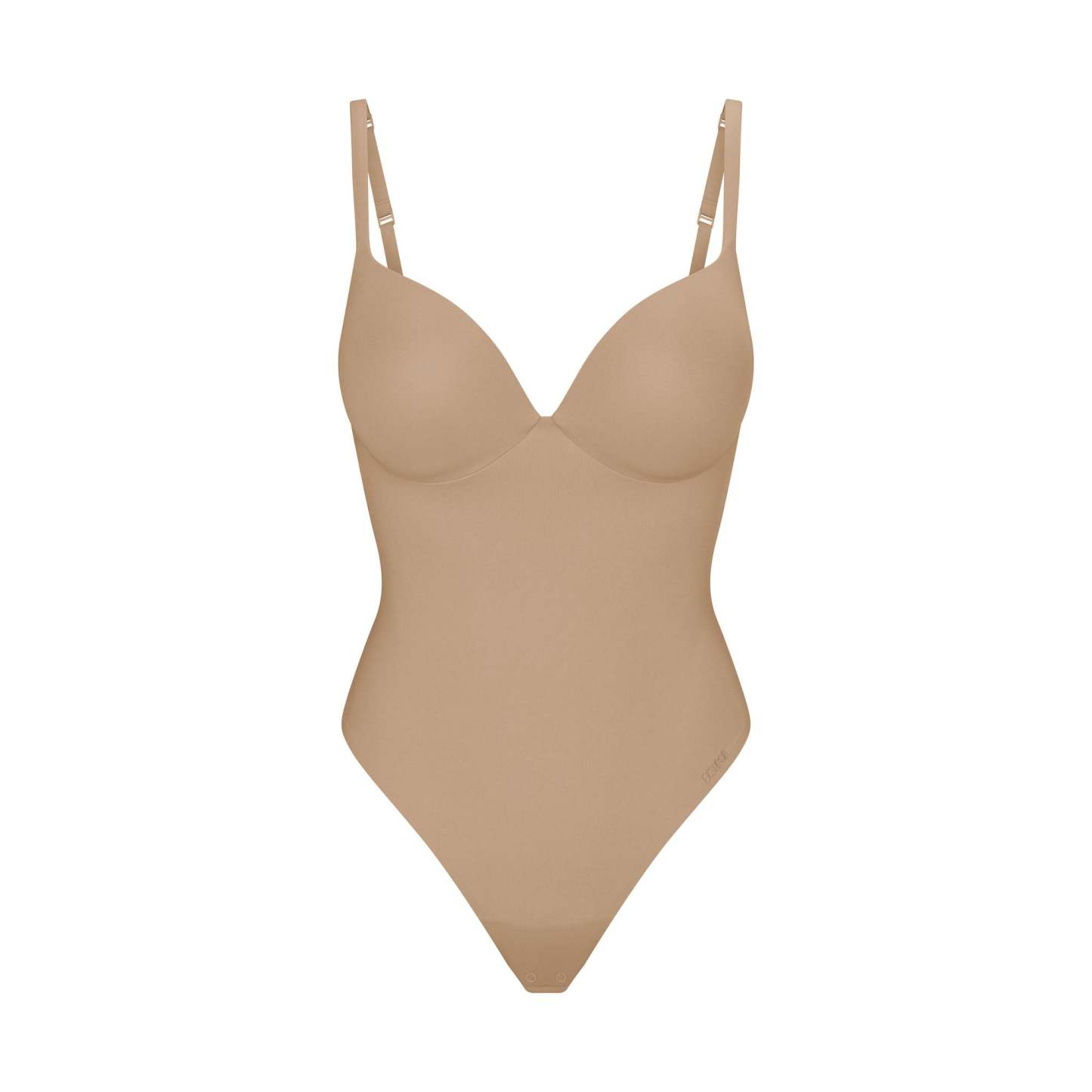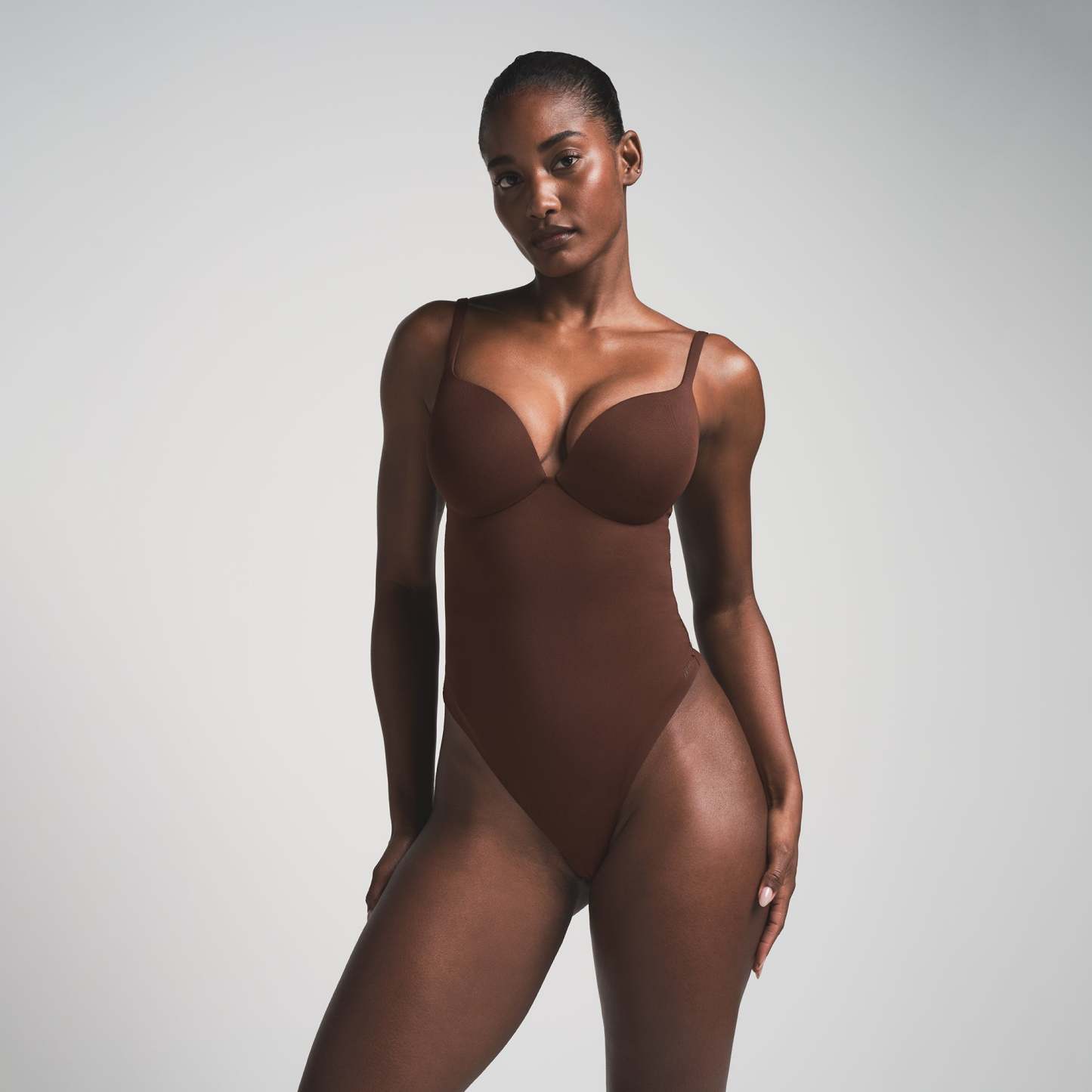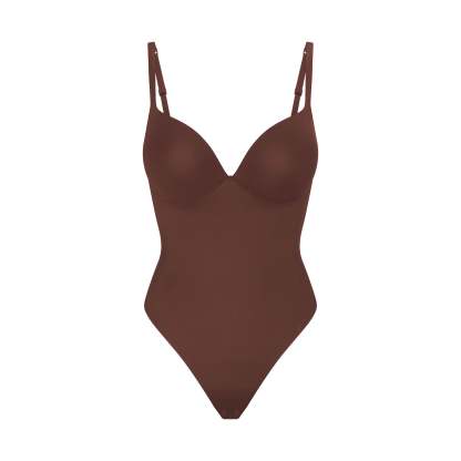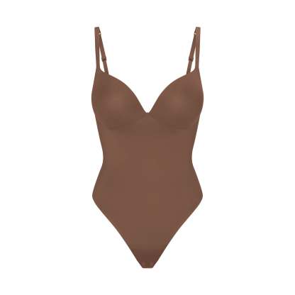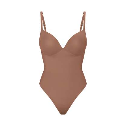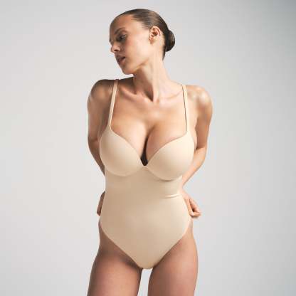 Plunge neckline, Push-Up padding, Concealed underwire, Adjustable straps, Interior wing elastic for support, Thong coverage, Snaps at gusset, Power mesh lining for added compression