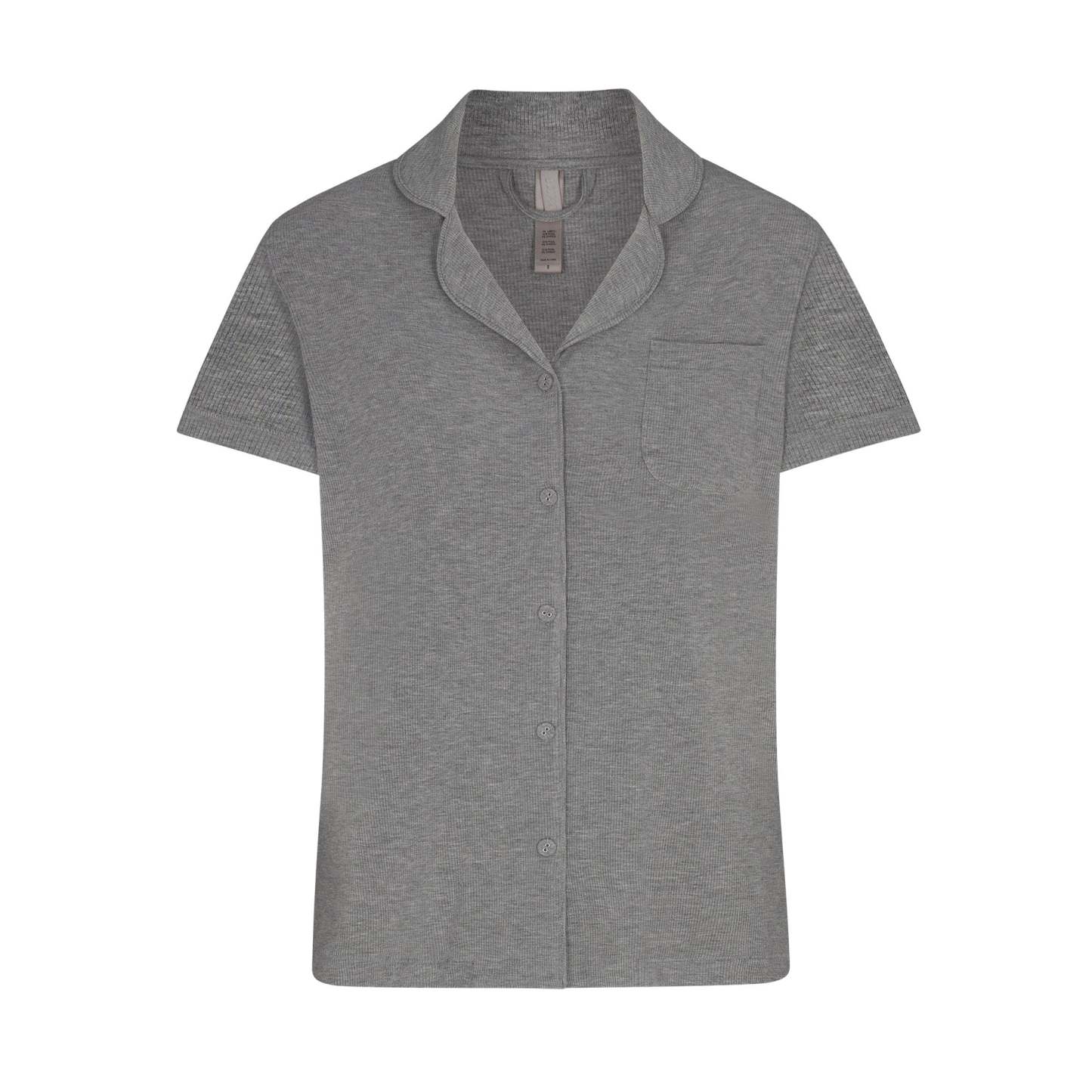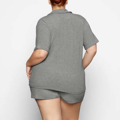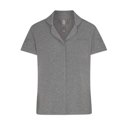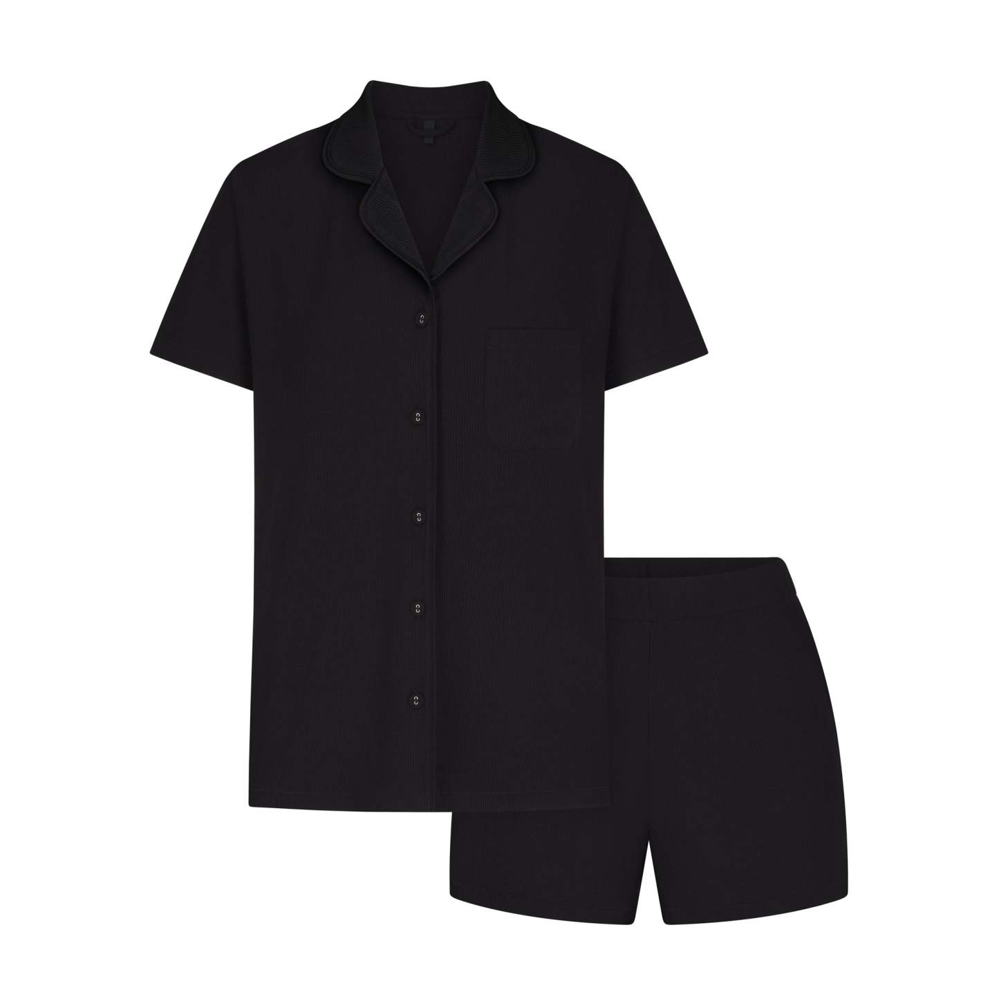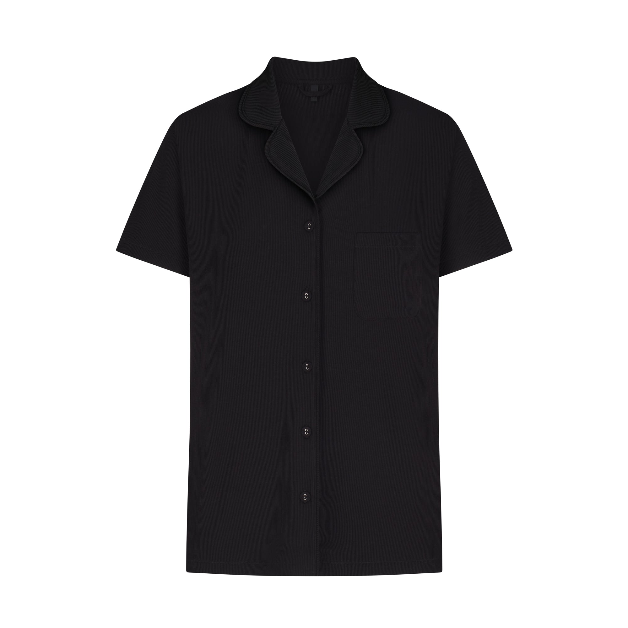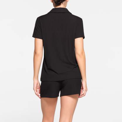 - Classic short sleeve sleepwear top, Center front button up closure, Chest pocket detail on wearers left side, Slinky lounge short with interior drawstring for added comfort, Ribbed fabric detail