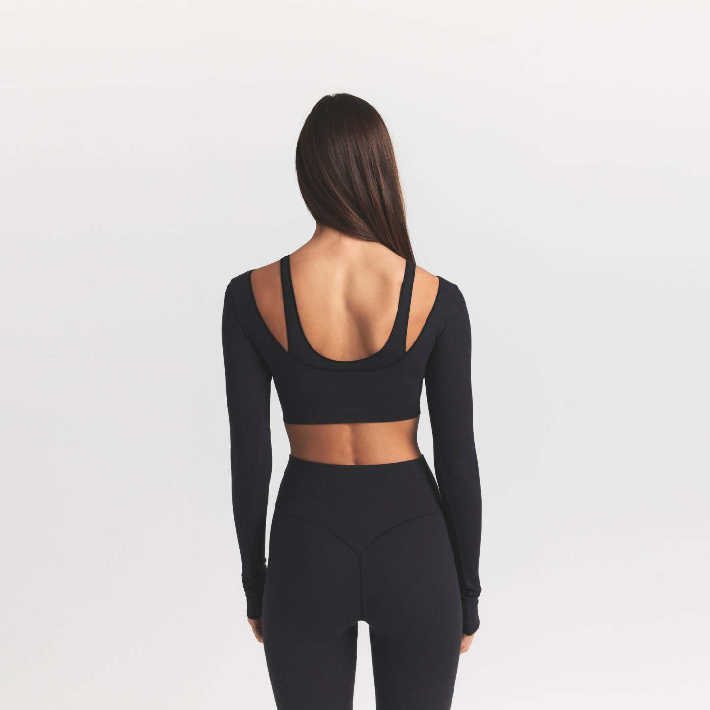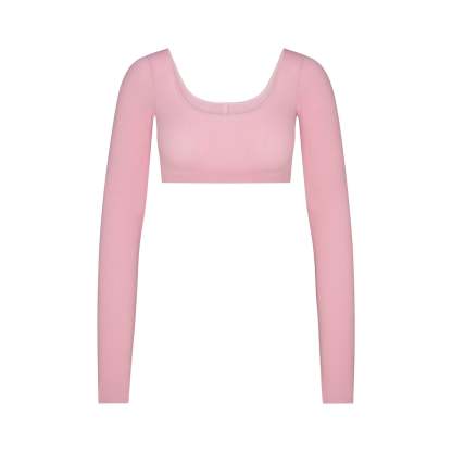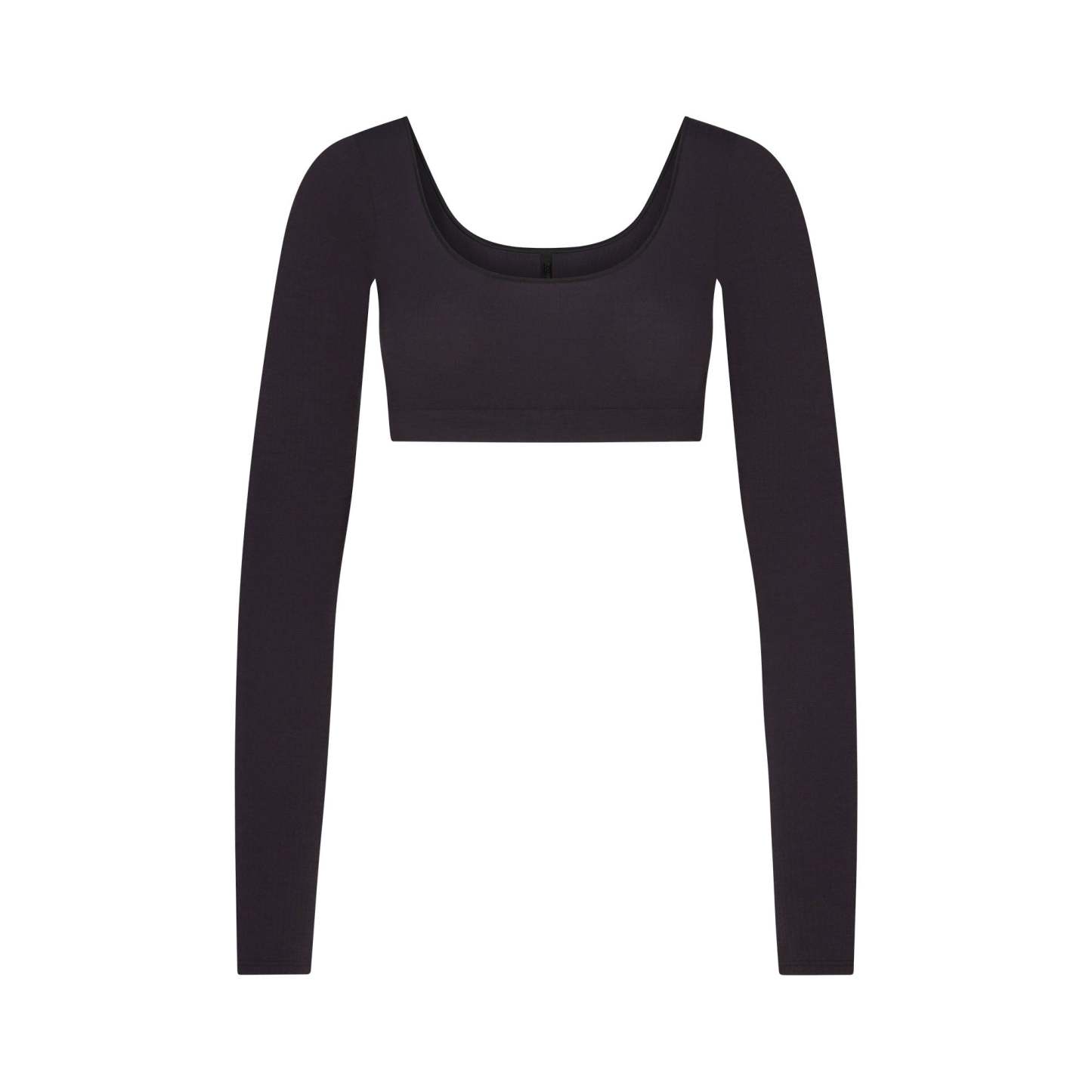 - Wide scoop neckline, Long sleeves, Low back, Fits tight to body, Super cropped length