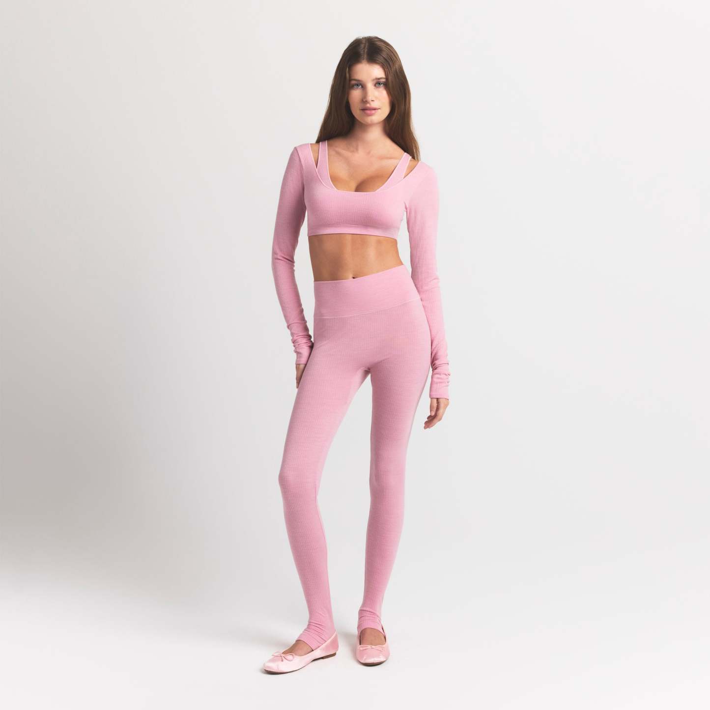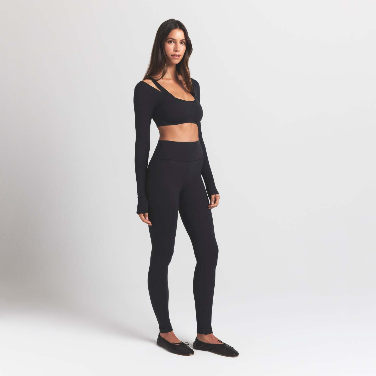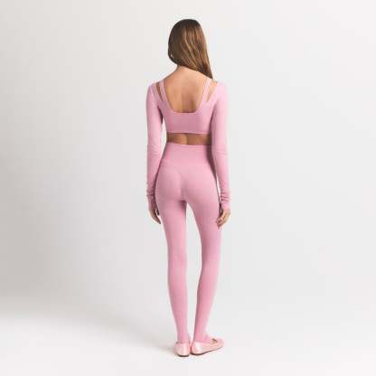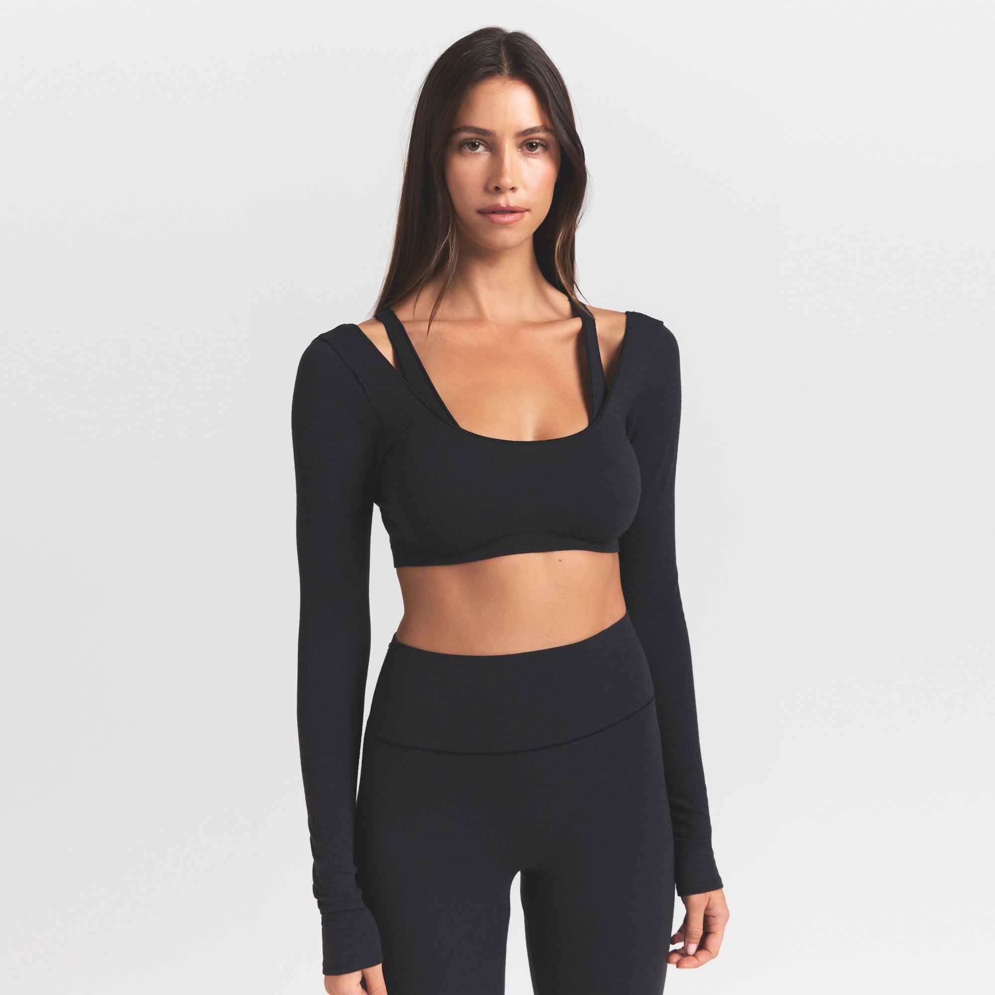 - Wide scoop neckline, Long sleeves, Low back, Fits tight to body, Super cropped length
