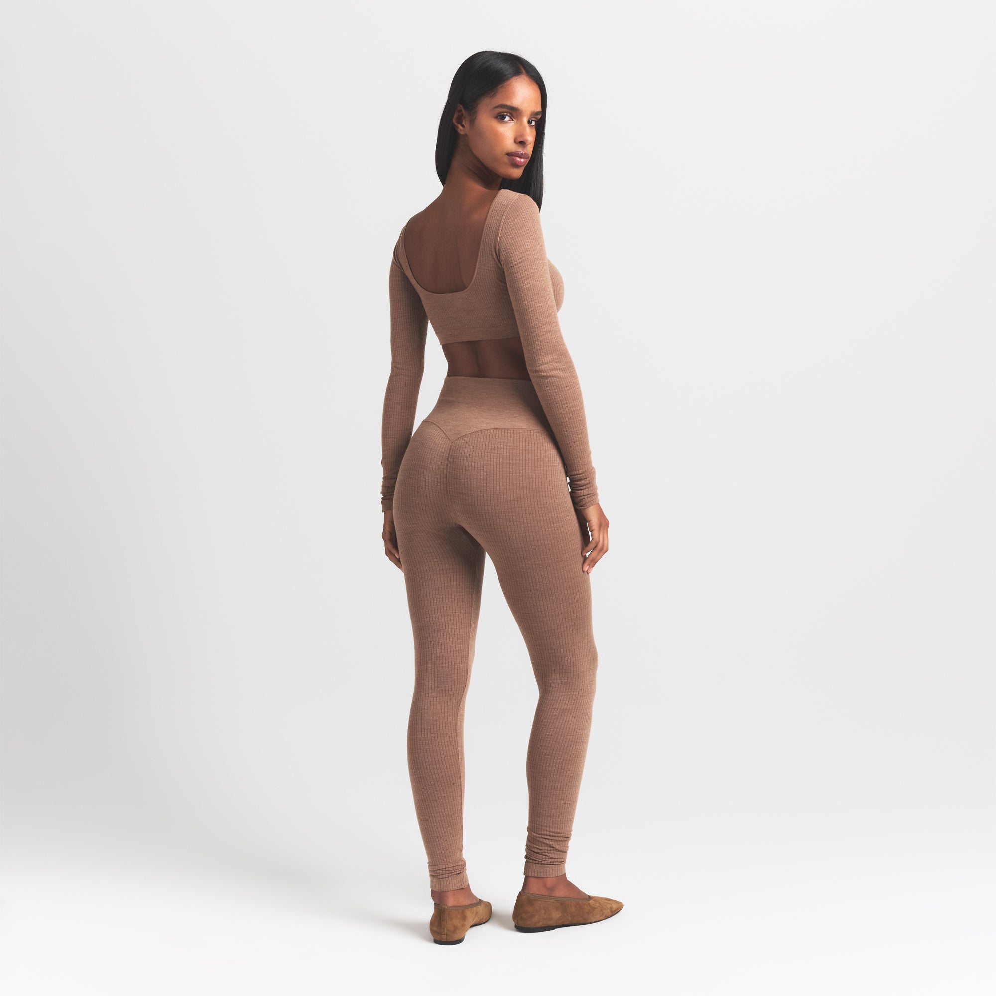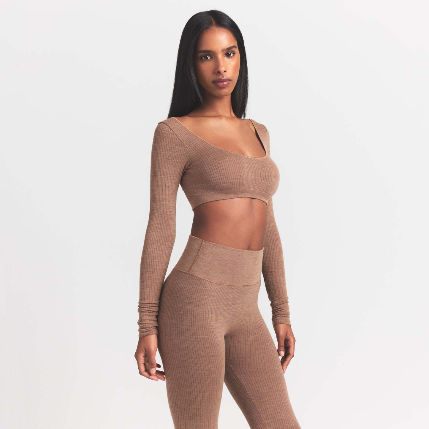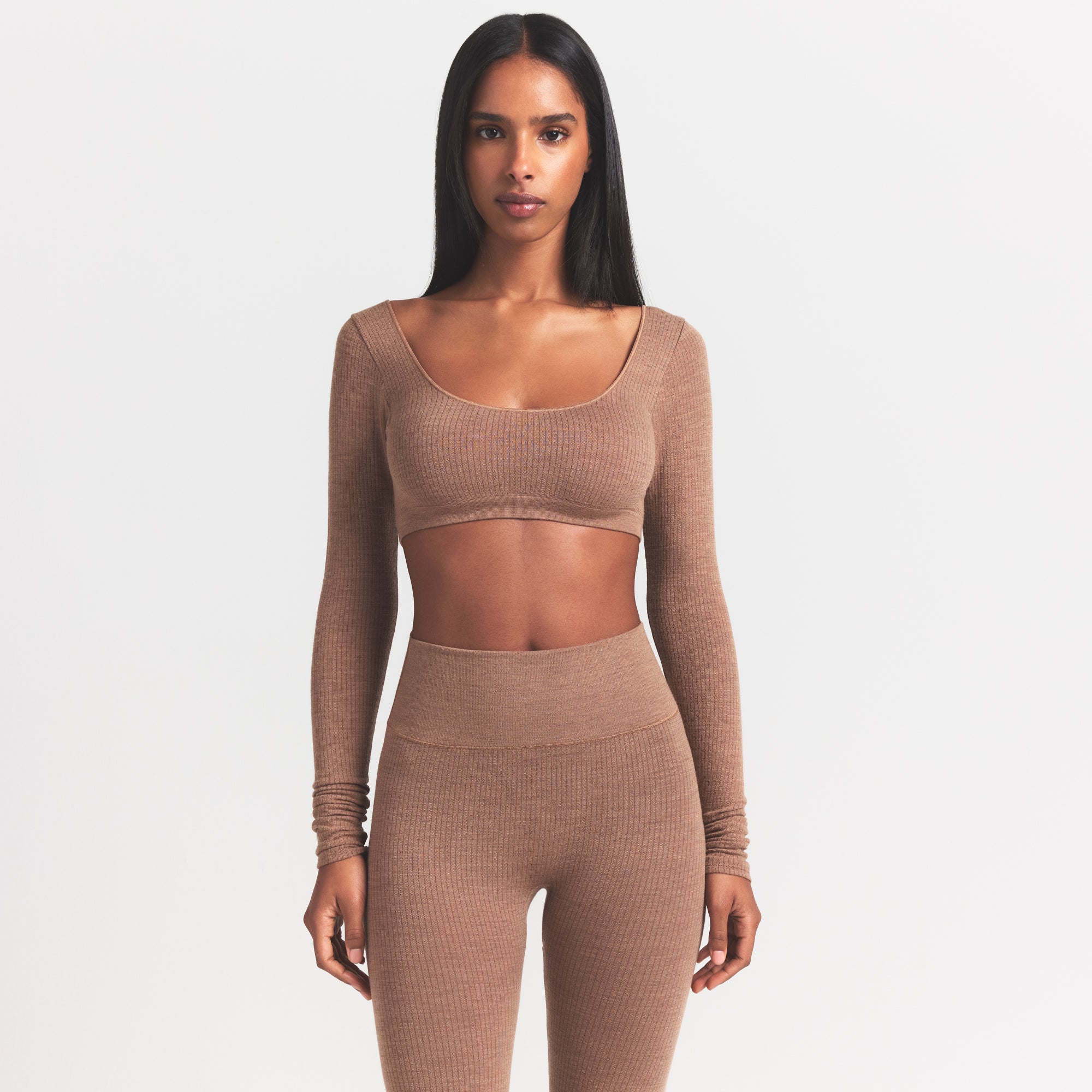 Super cropped, super cozy. Designed in our stretchy new ribbed wool blend, this body-hugging top features a wide scoop neckline and low back for a sexy winter statement.
