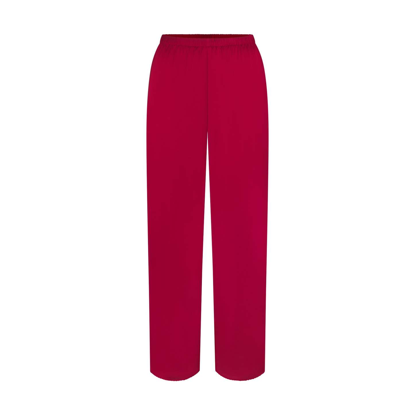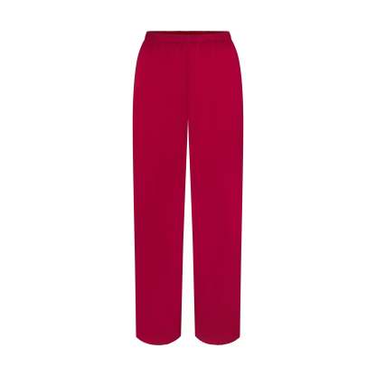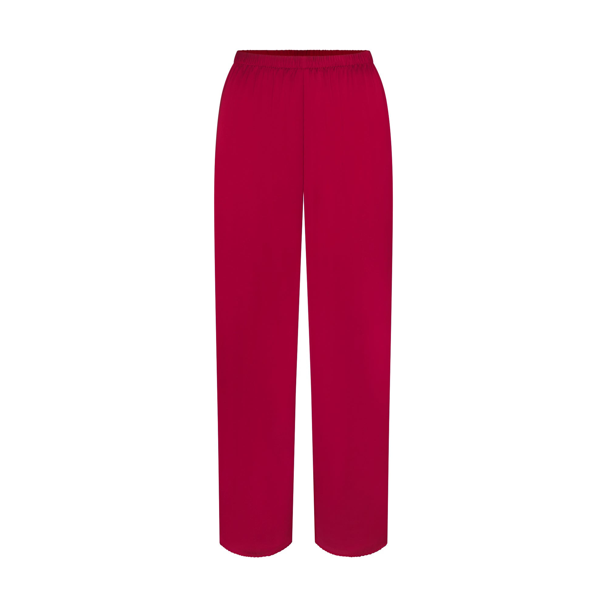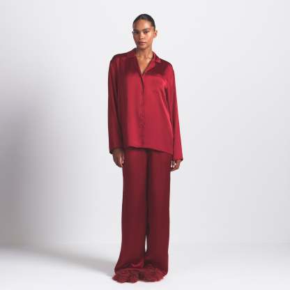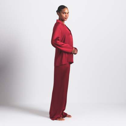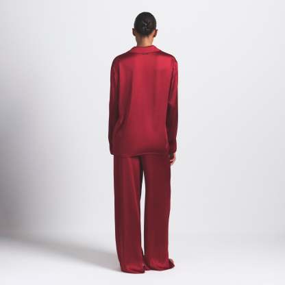 The secret to your most comfortable sleep. Made with our satiny Woven Shine fabric, this sexy two-piece set includes a long sleeve-button up with a chest pocket, center back logo label, and slits at the side seams. The relaxed straight leg pant features an encased elastic waistband and picot edge stitching details.